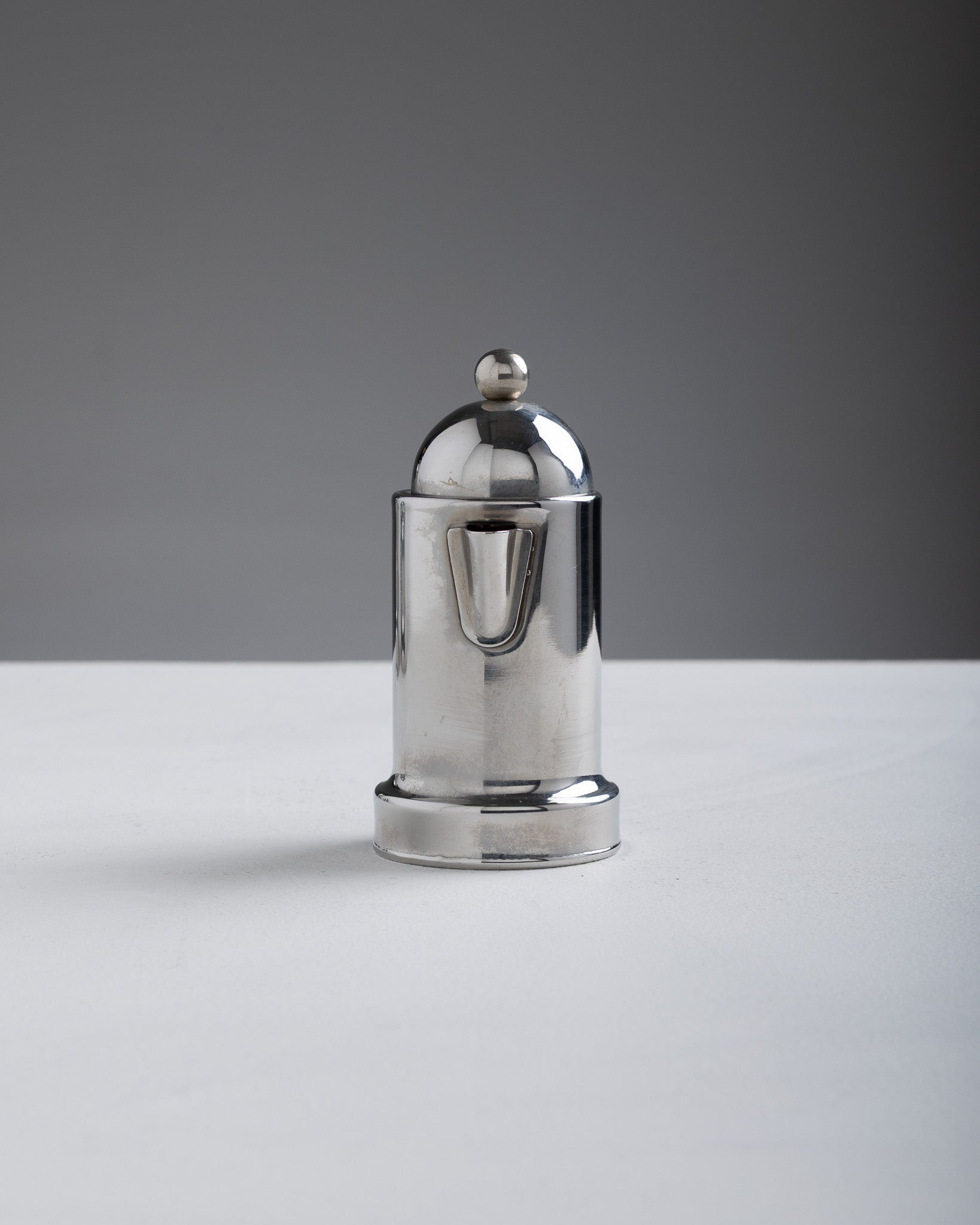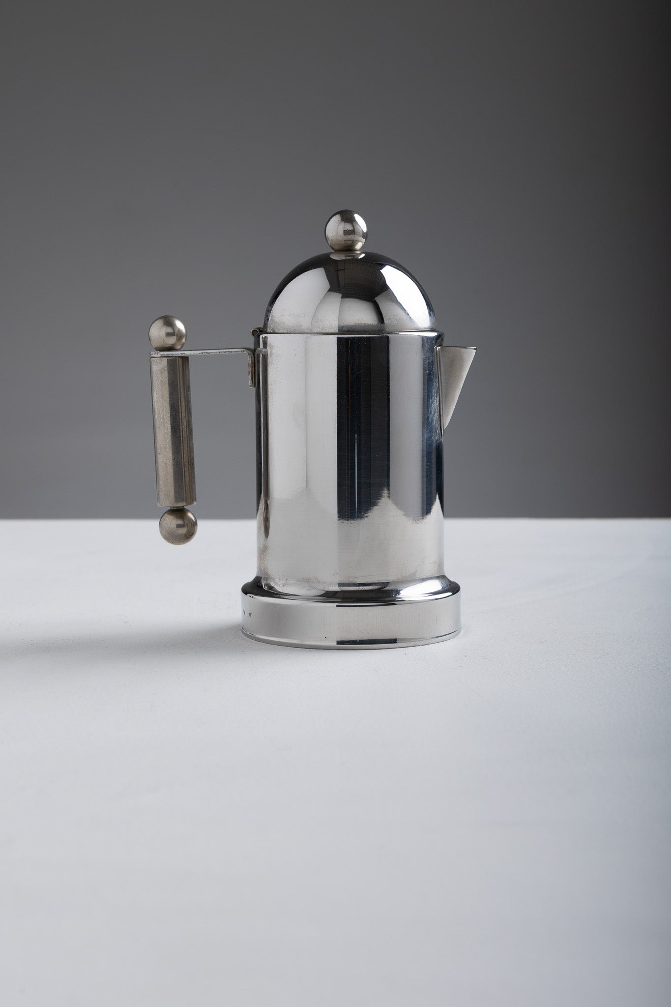 Coffee service set made of 18/10 stainless steel, consisting of a coffee pot, a milk jug and a sugar bowl. Cylindrical shape topped with a hemispherical lid and a side handle accented with a spherical knob. Italian work from the 1980s and hallmarked on the underside.