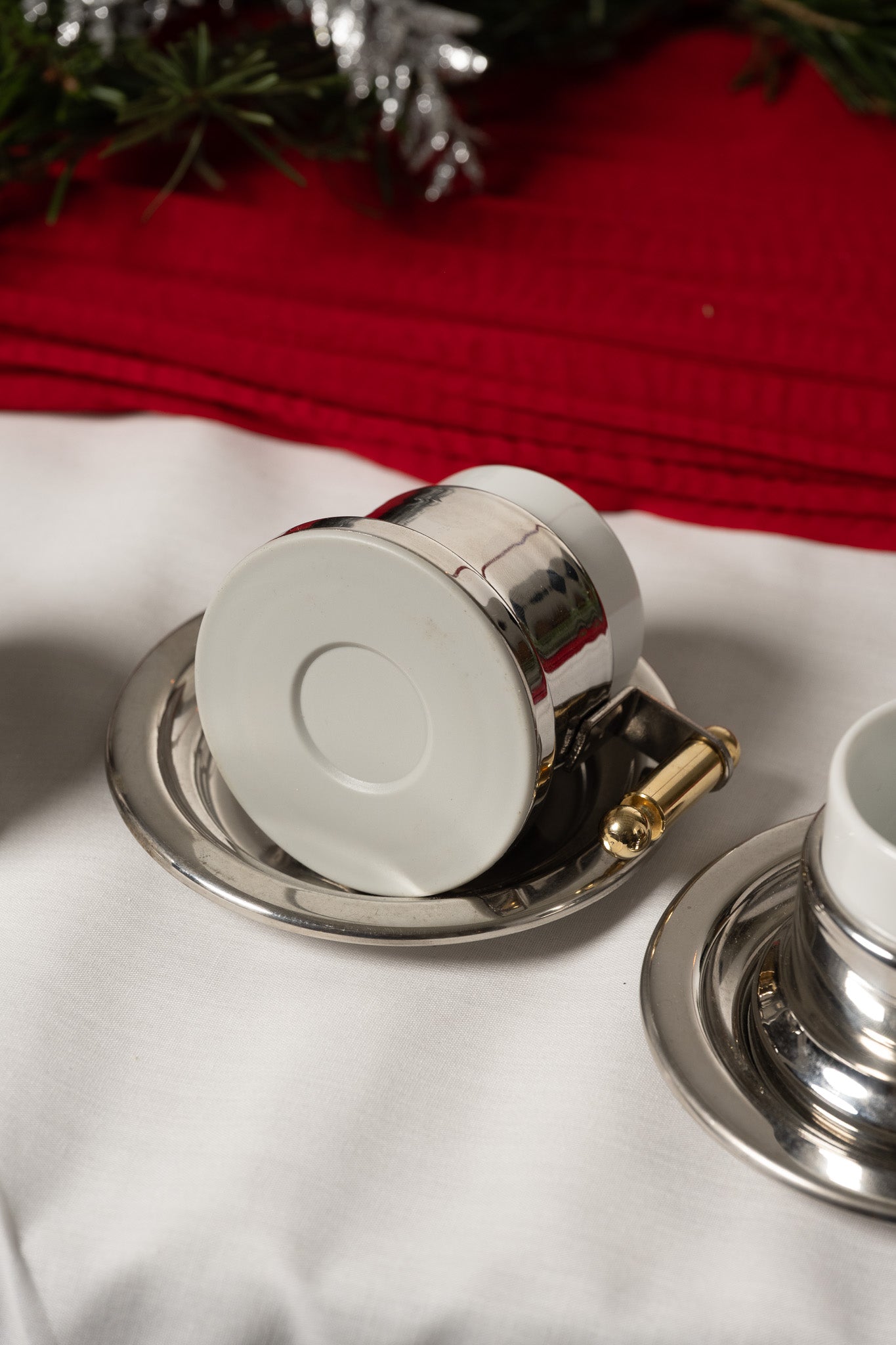 VEV Vigano coffee service in 18/10 stainless steel, Italian craftsmanship from the 1980s. The set comprises two cups with saucers and a creamer. An iconic design from the Vigano company, it blends cylindrical lines, a mirror finish, and gilded brass details. Each piece is stamped VEV Vigano - Inox 18/10 - Made in Italy.