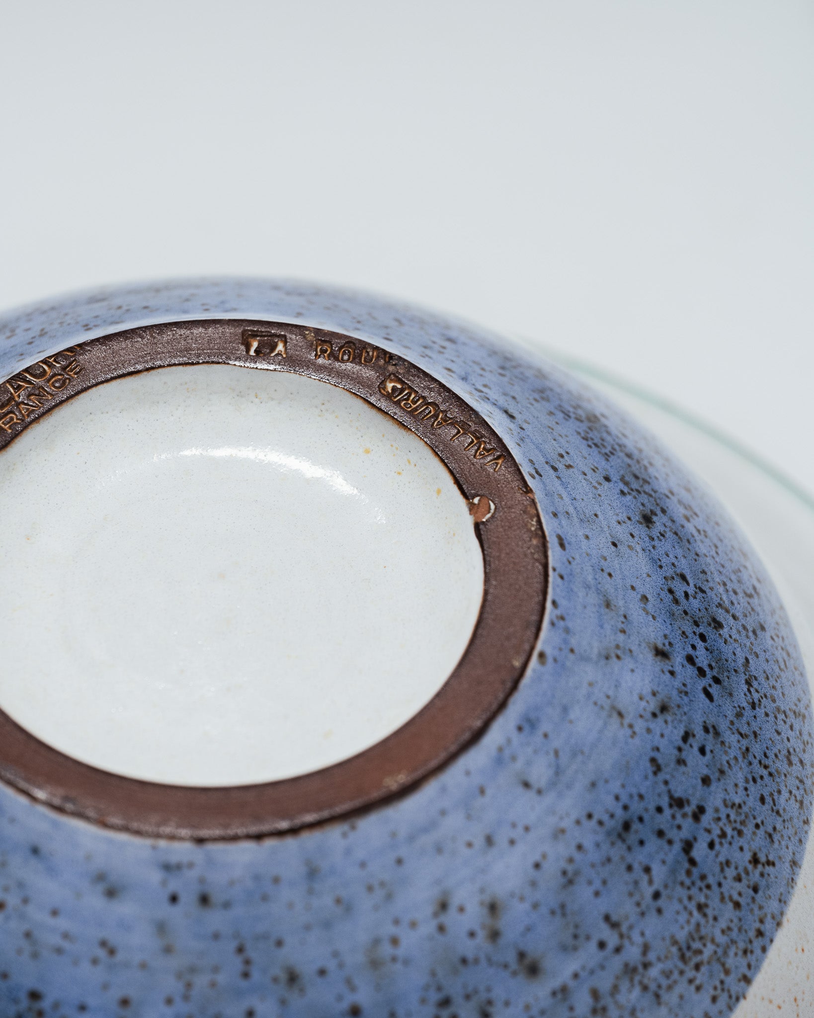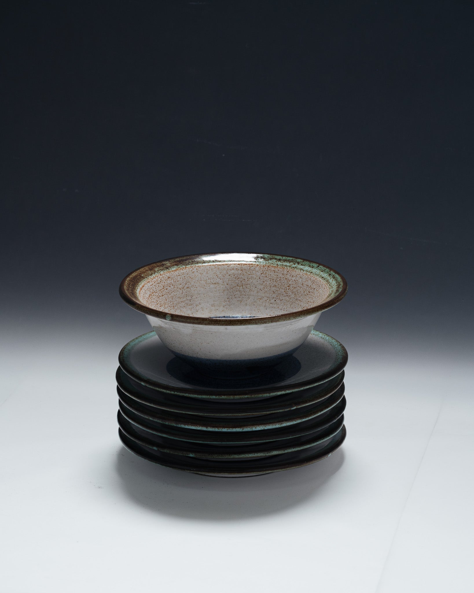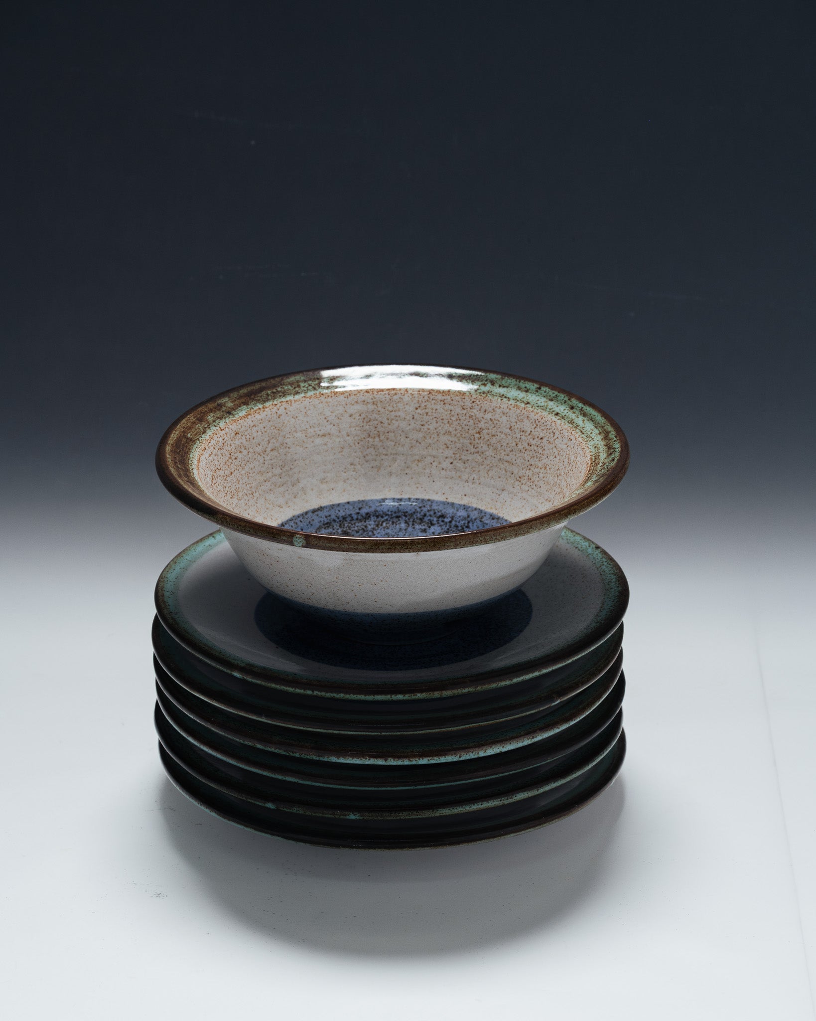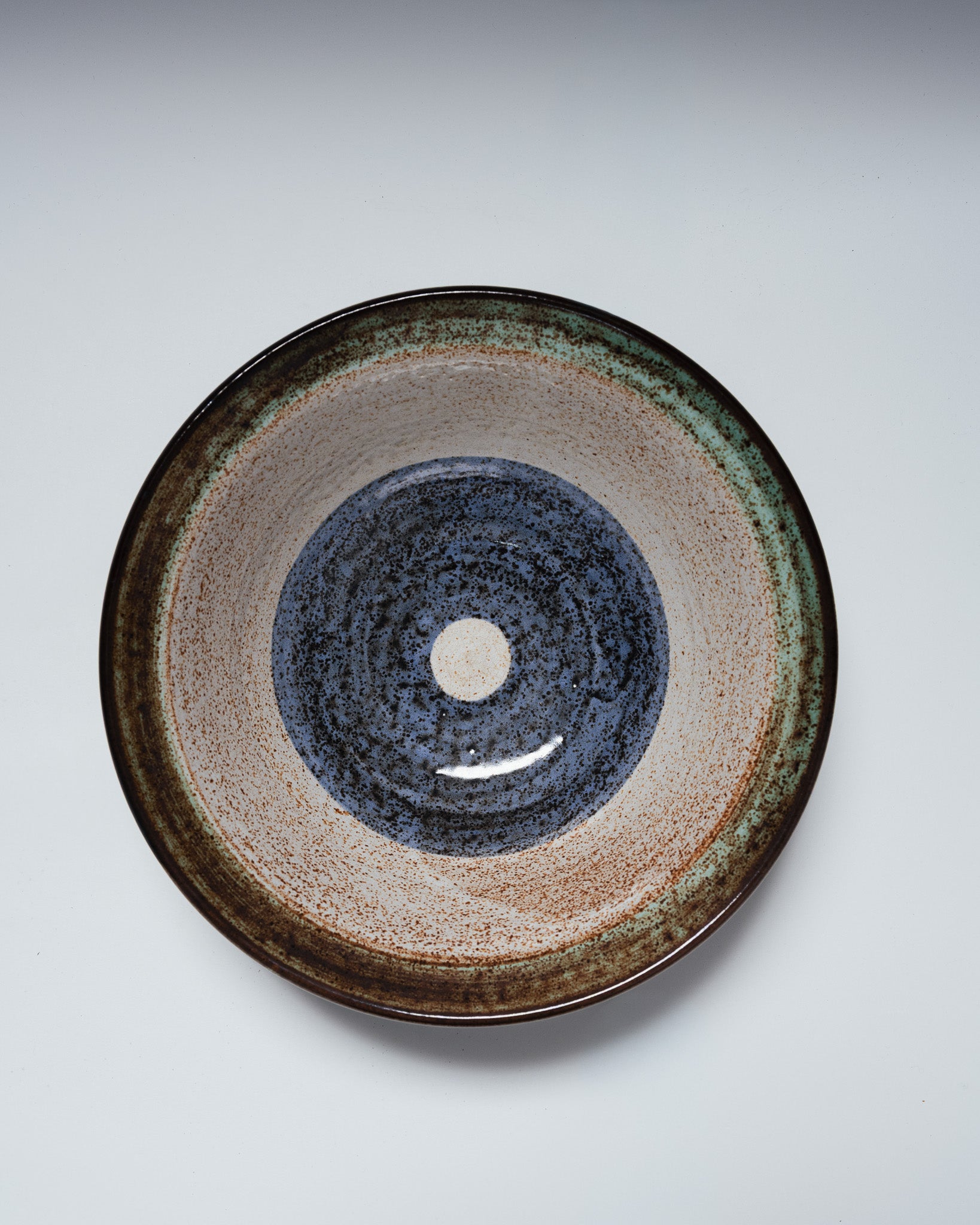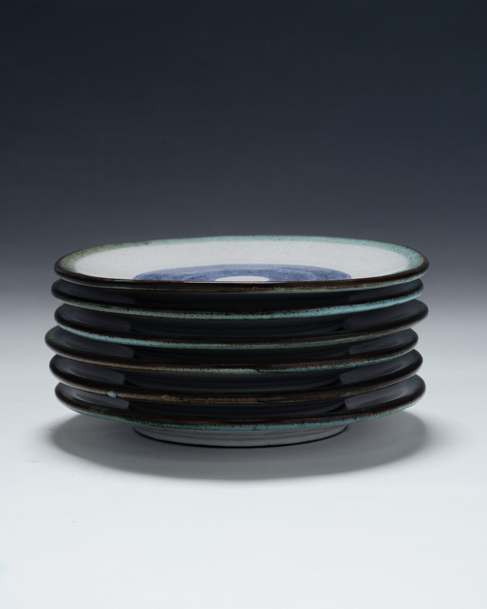 A set of six plates and a matching platter, "La Roue" pattern, from Vallauris. Glazed ceramic with a circular decoration in shades of brown, green, beige, and blue. Dark brown rim, speckled green band, and central blue-gray motif. A 1950s piece, signed on the reverse. Very good overall condition.