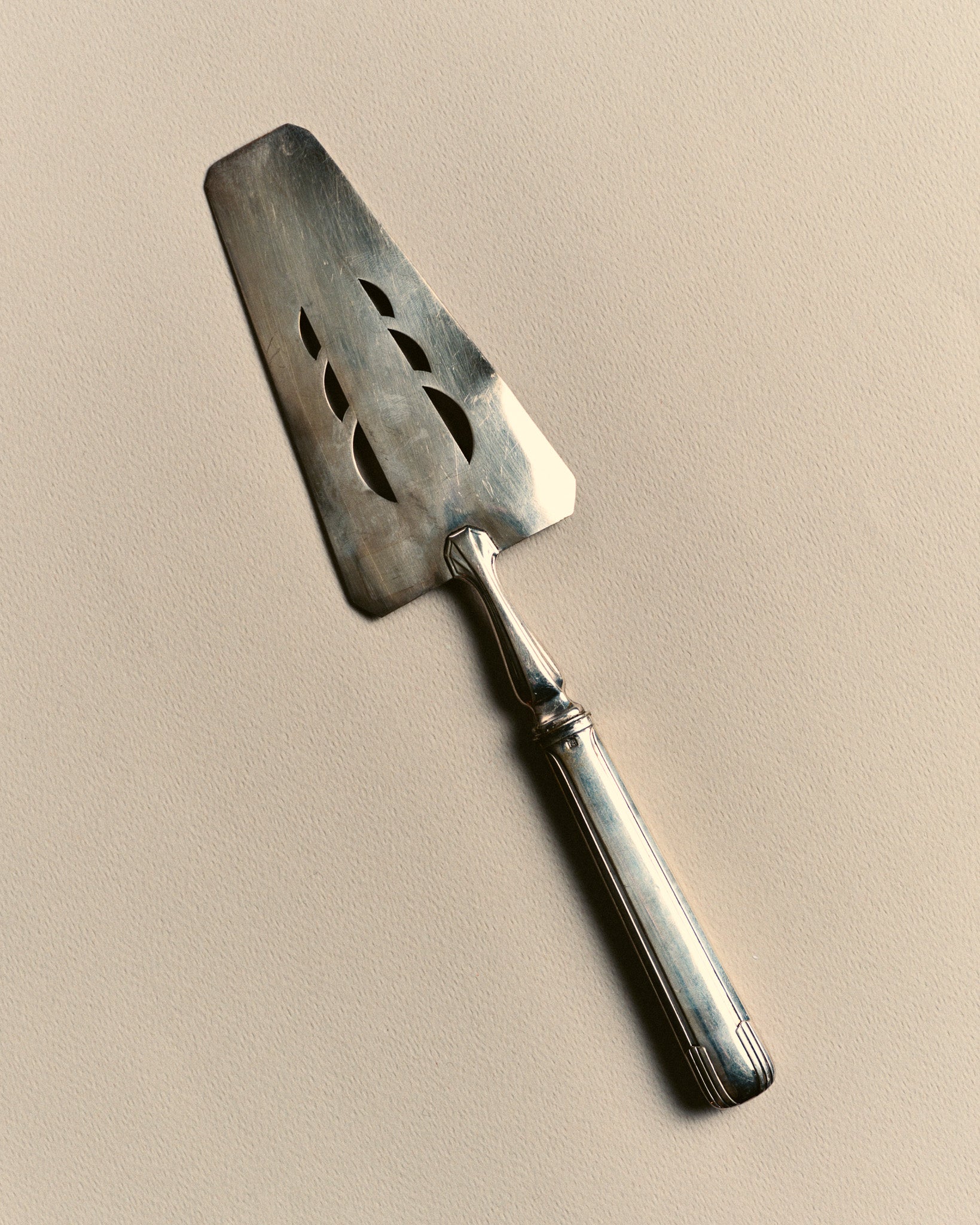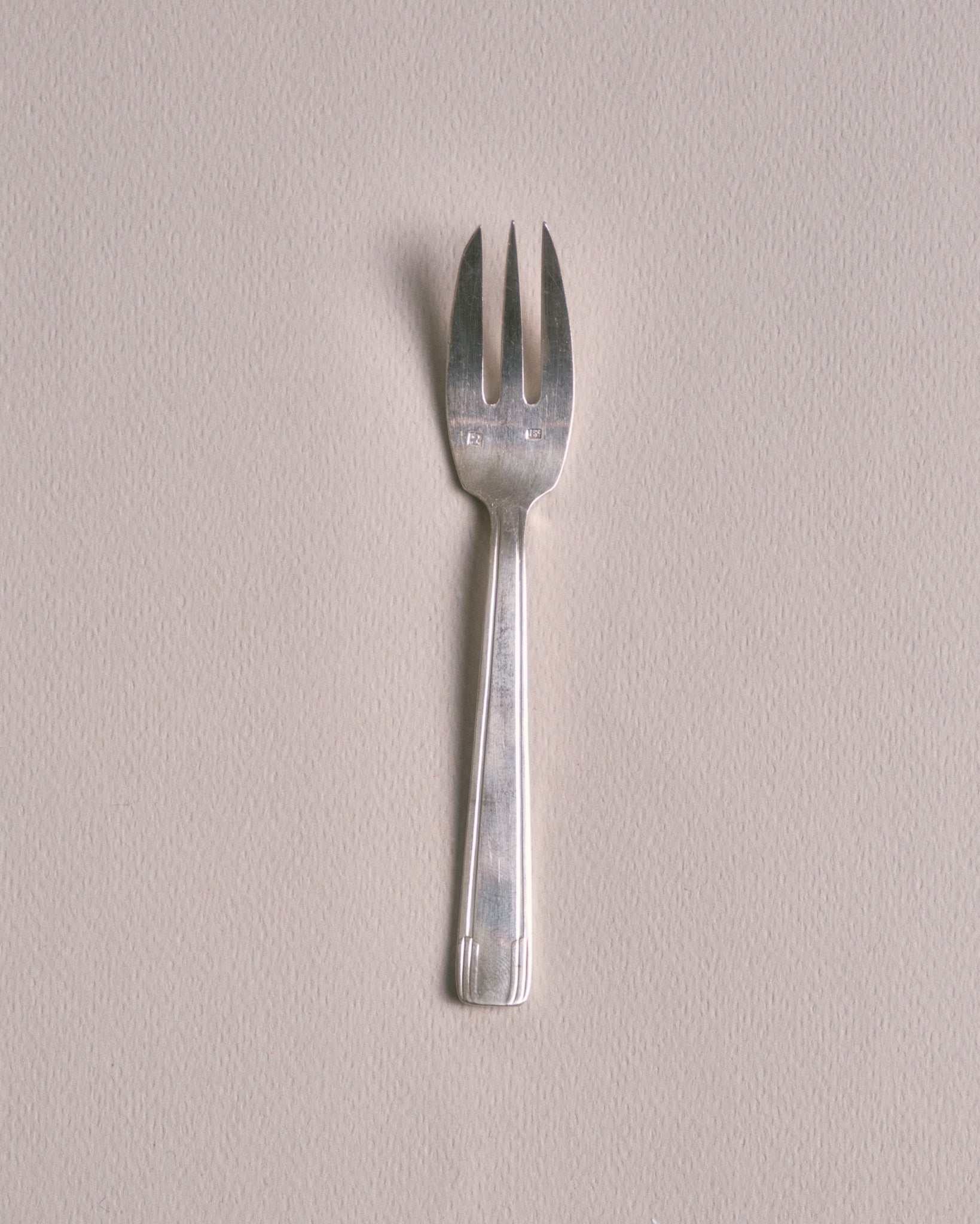 A silver-plated dessert service comprising twelve forks and a cake server. Presented in its original Henri Carraud, Jeweler's, case. The pieces feature a geometric design typical of the Art Deco aesthetic.