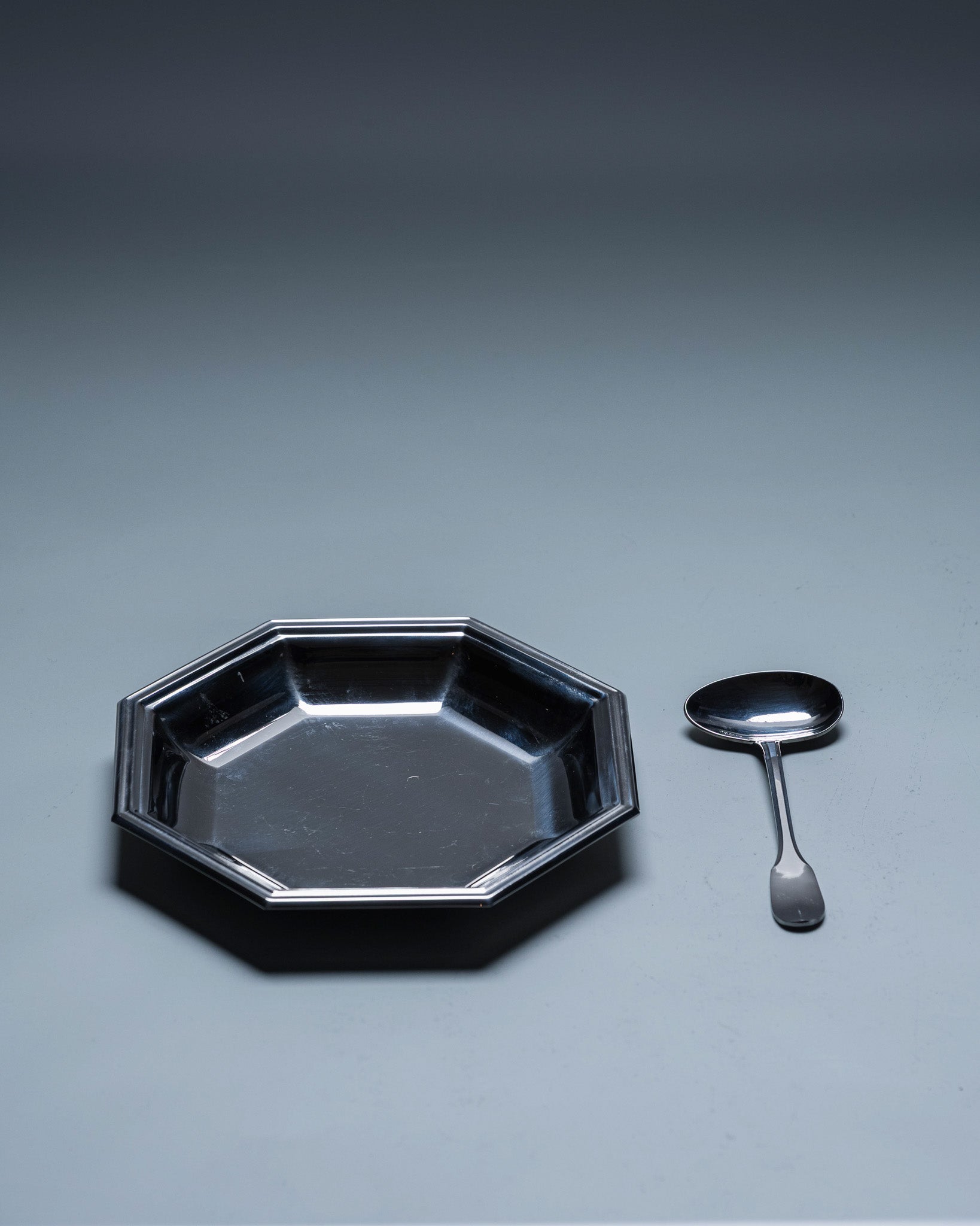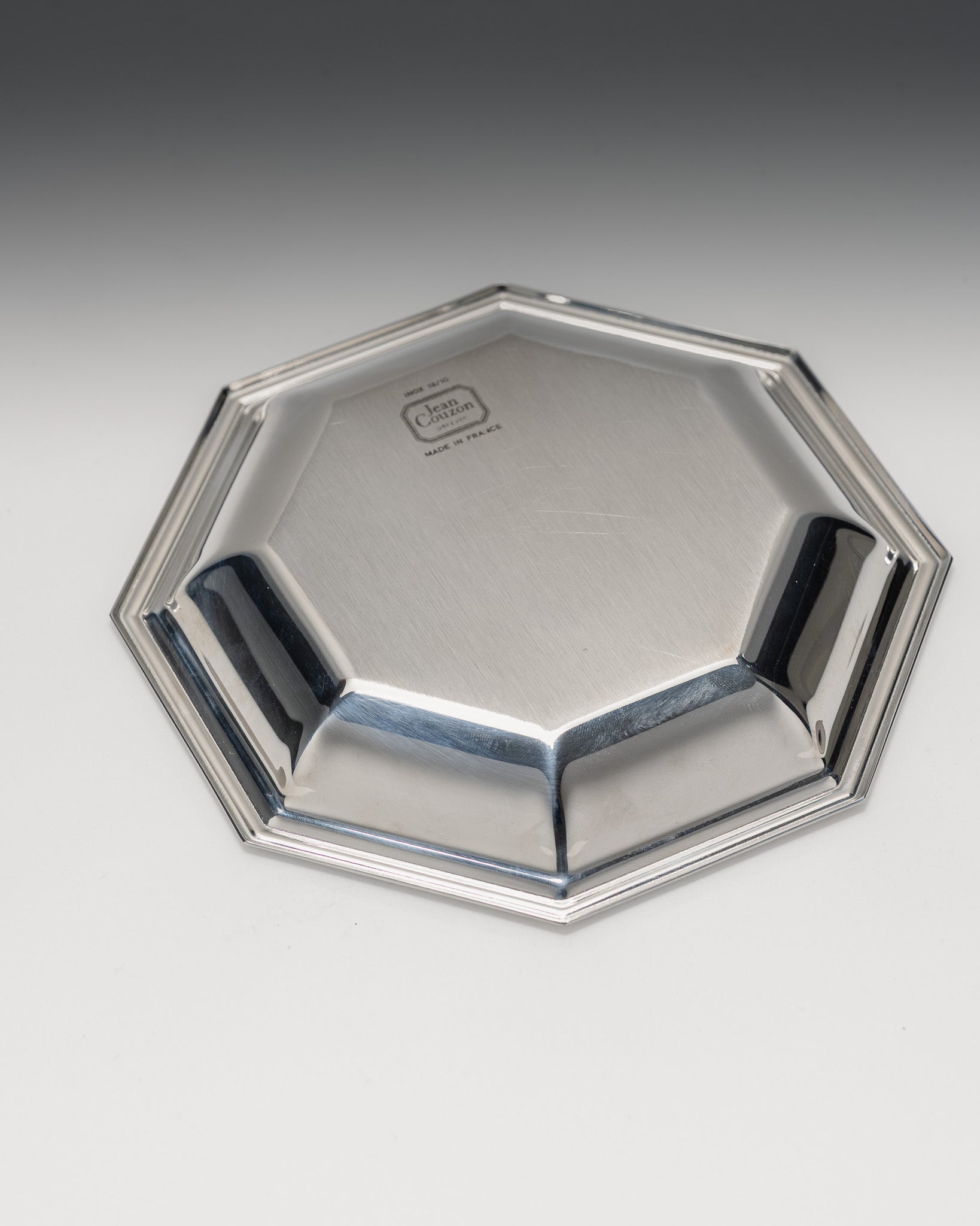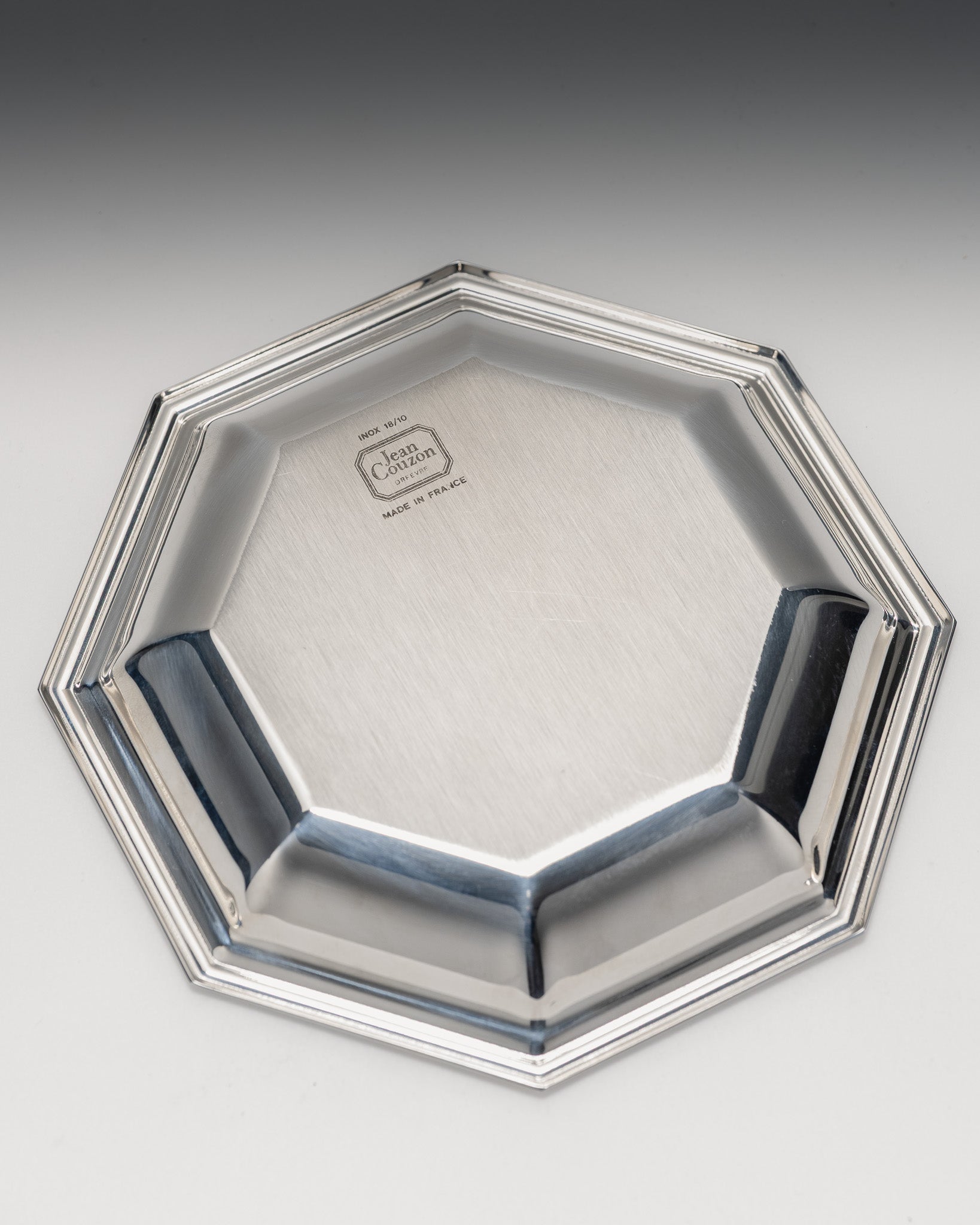 Jean Couzon baby gift set, 1970s. The set comprises an octagonal bowl and a polished stainless steel spoon. Maker's mark Jean Couzon on the reverse. Very good overall condition.