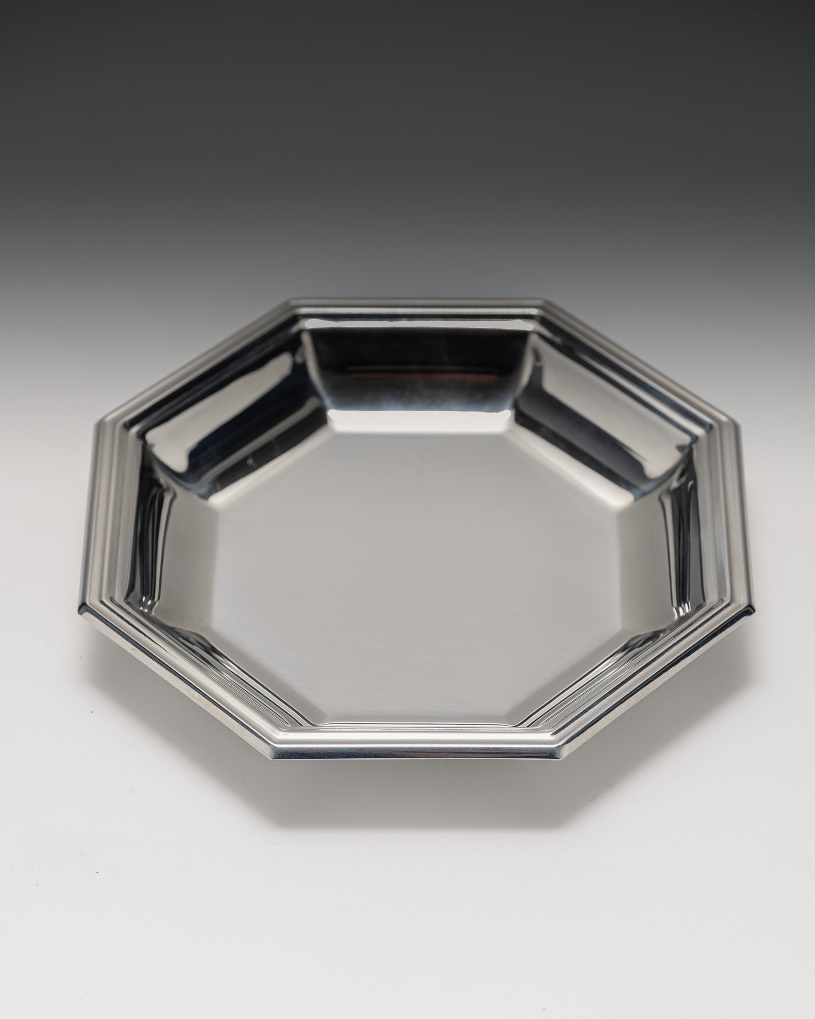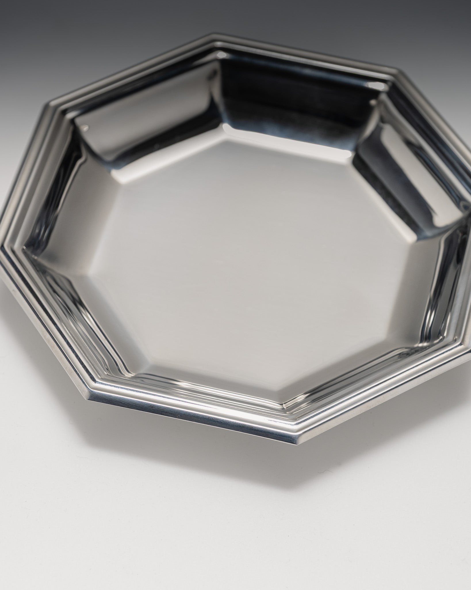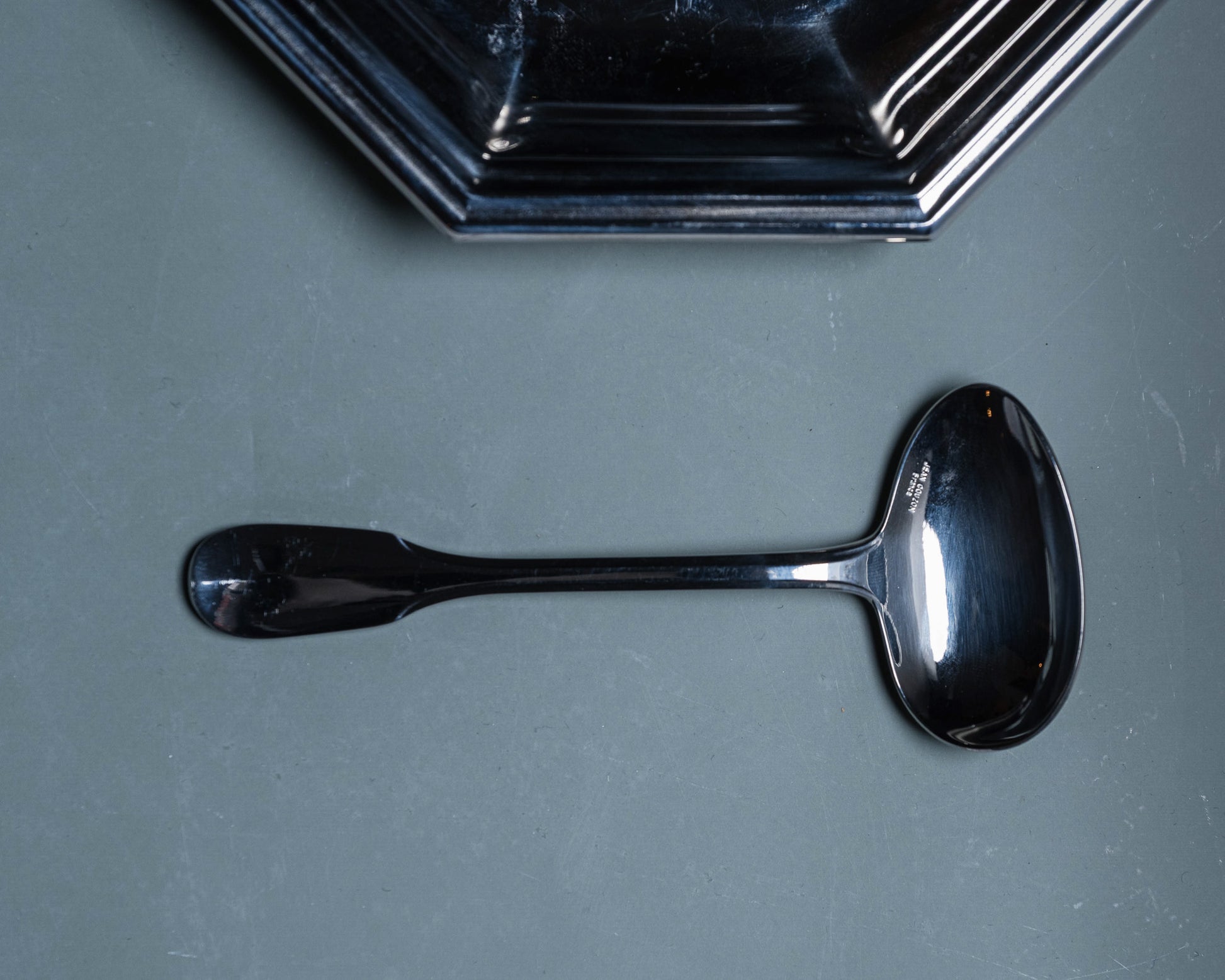 Jean Couzon baby gift set, 1970s. The set comprises an octagonal bowl and a polished stainless steel spoon. Maker's mark Jean Couzon on the reverse. Very good overall condition.