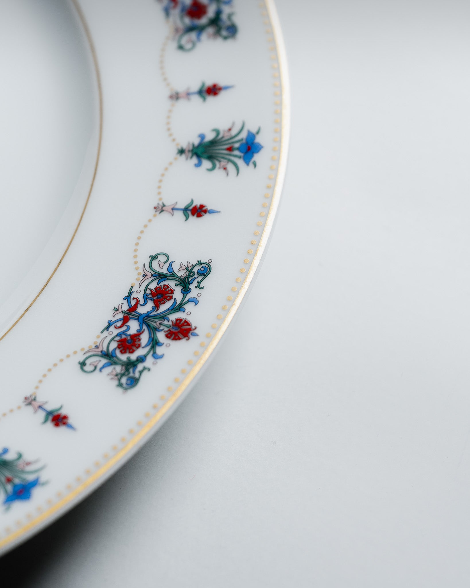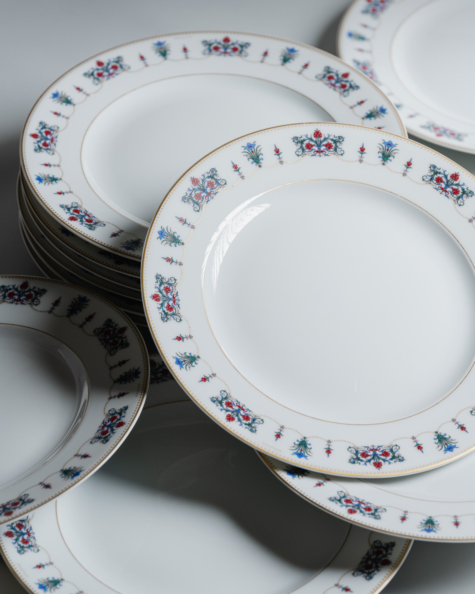 Set of 12 dessert plates, Ciselio pattern by Christofle. White porcelain decorated with beaded gold garlands and chiseled floral arabesques, highlighted with a fine gold rim. French production from the 1960s.