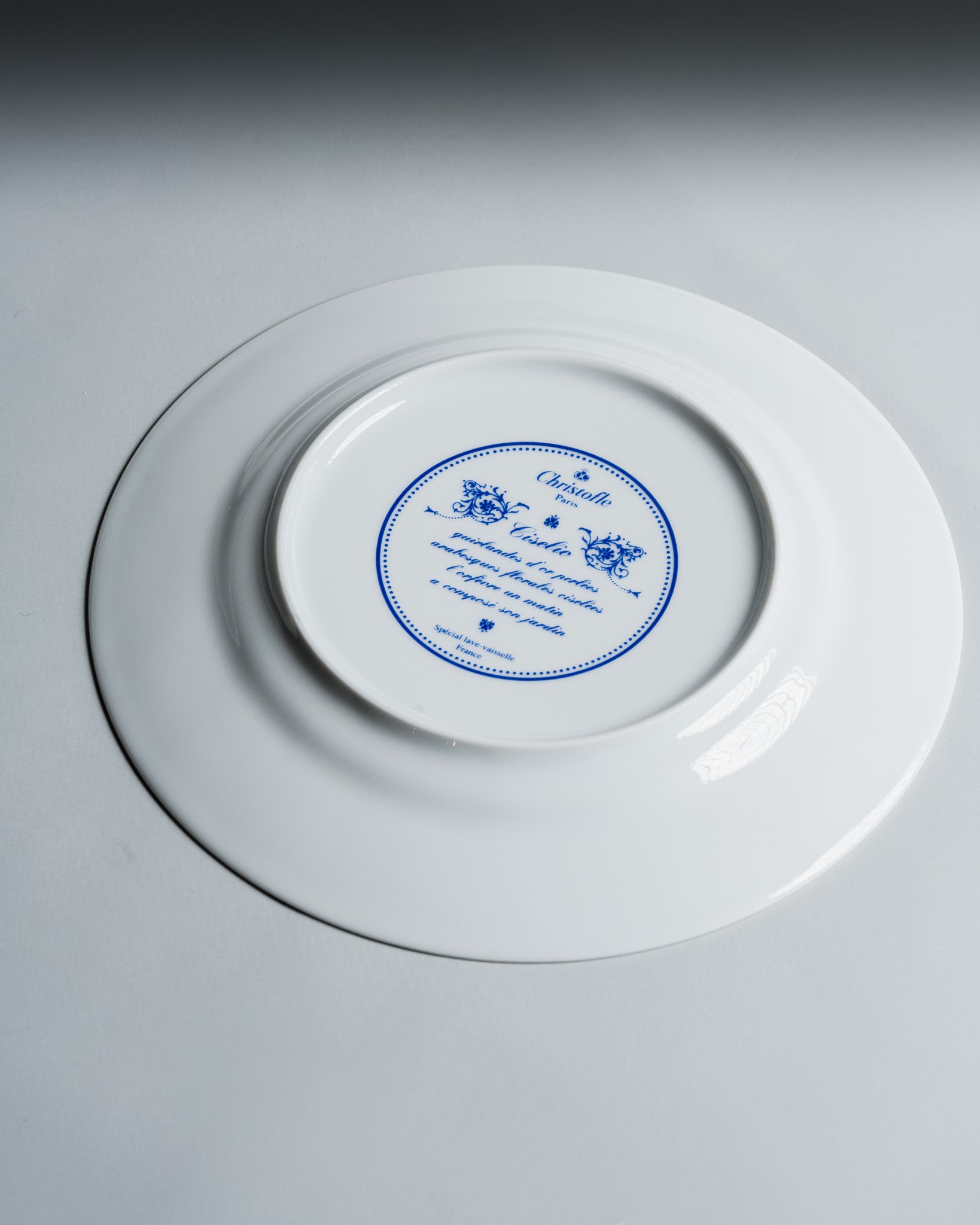 Markings on the reverse: "Chistofle", "Ciselio", "Golden beaded garland, chased floral arabesques. The goldsmith, one morning, composed his garden." The Ciselio motif evokes a stylized garden.