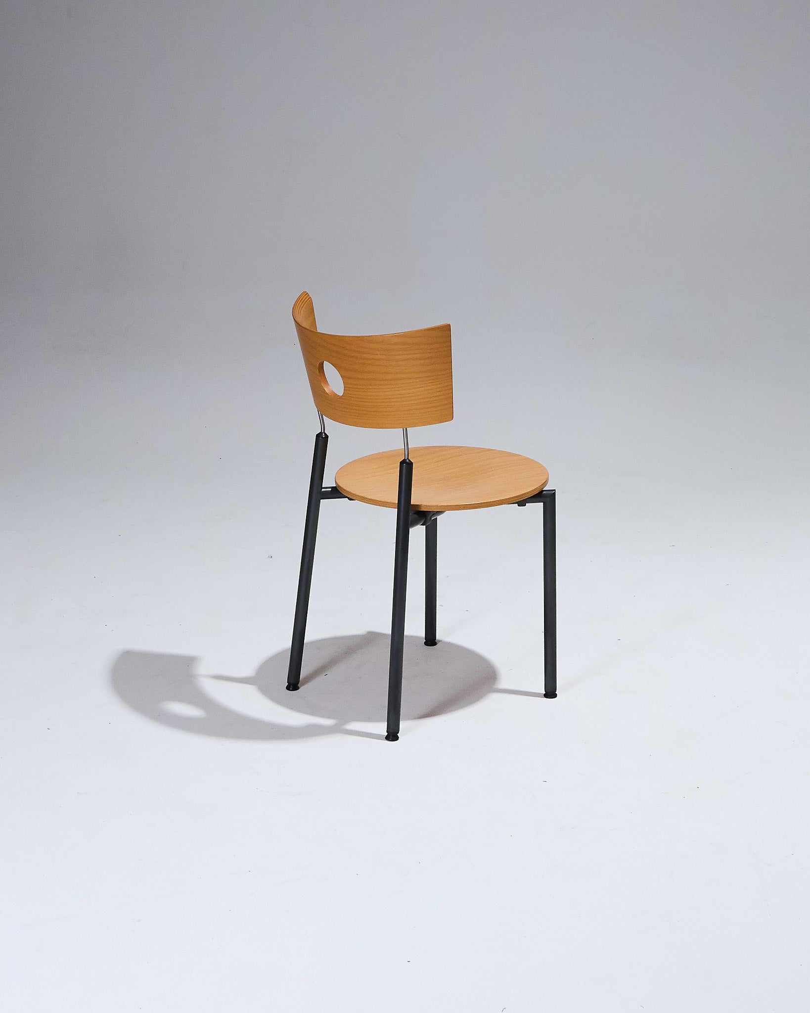 Set of 4 stackable chairs produced by the manufacturer Kusch+Co in the 1980s in Germany. Black lacquered steel frame combined with a circular seat and backrest in beech, pierced with a central cutout.