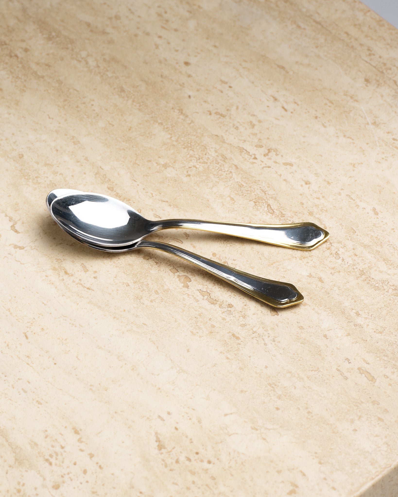 Set of two Italian espresso cups with matching spoons, VEV Vigano, Kontessa model, postmodern production from the 1980s. Each white porcelain cup is integrated into a cylindrical stainless steel holder. The gold-tone metal handles terminate in decorative balls. Stamped underneath : VEV Inox 18/10.