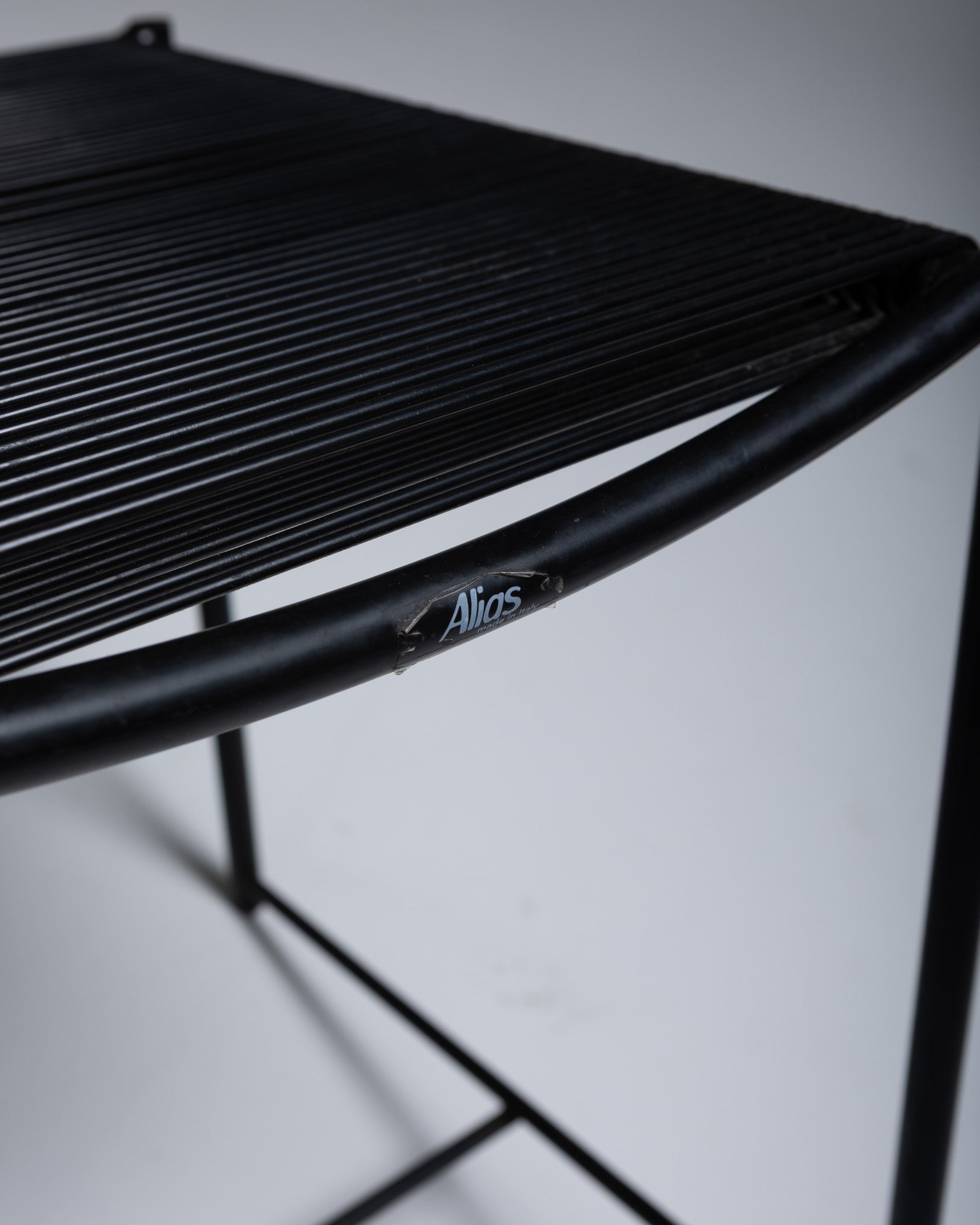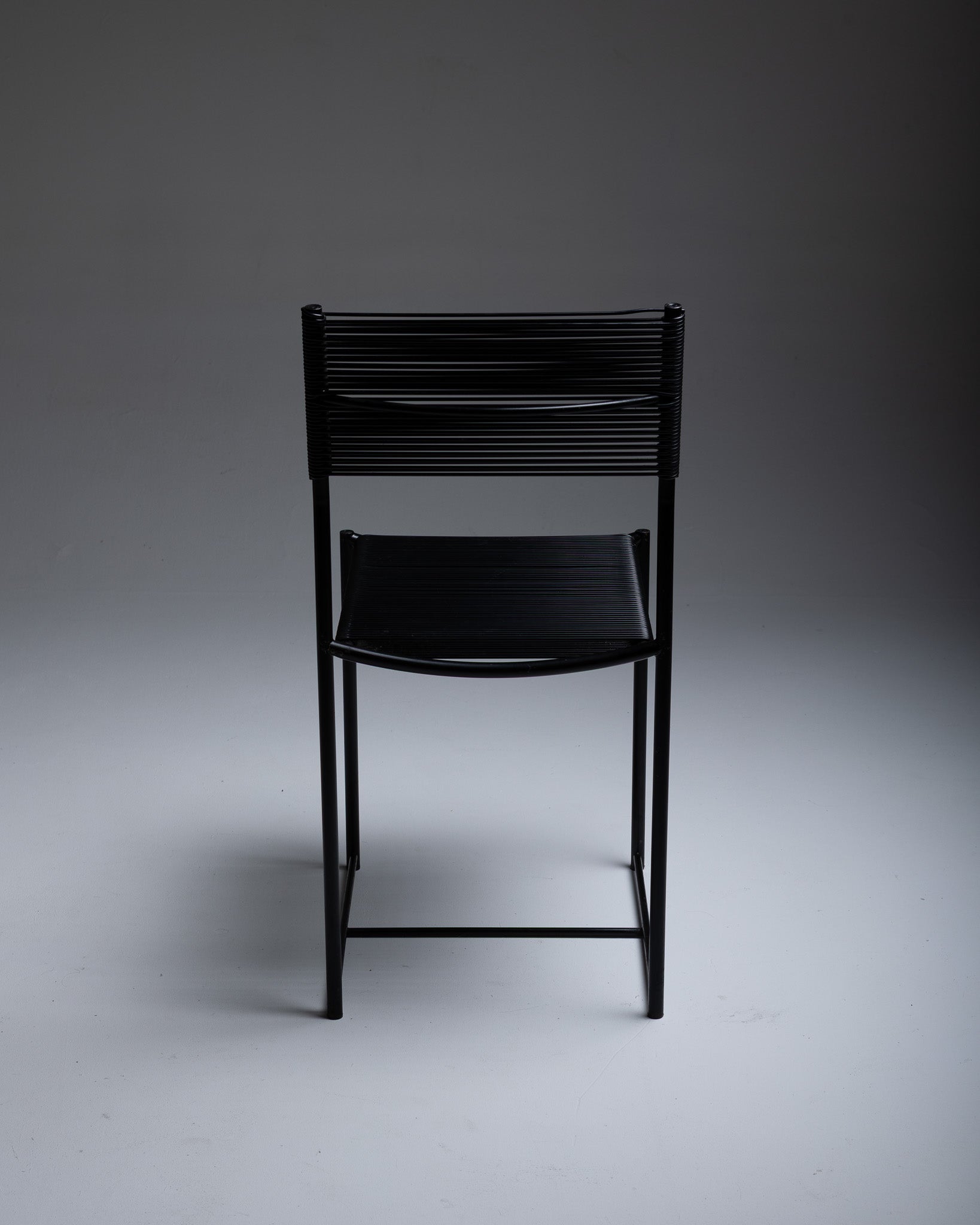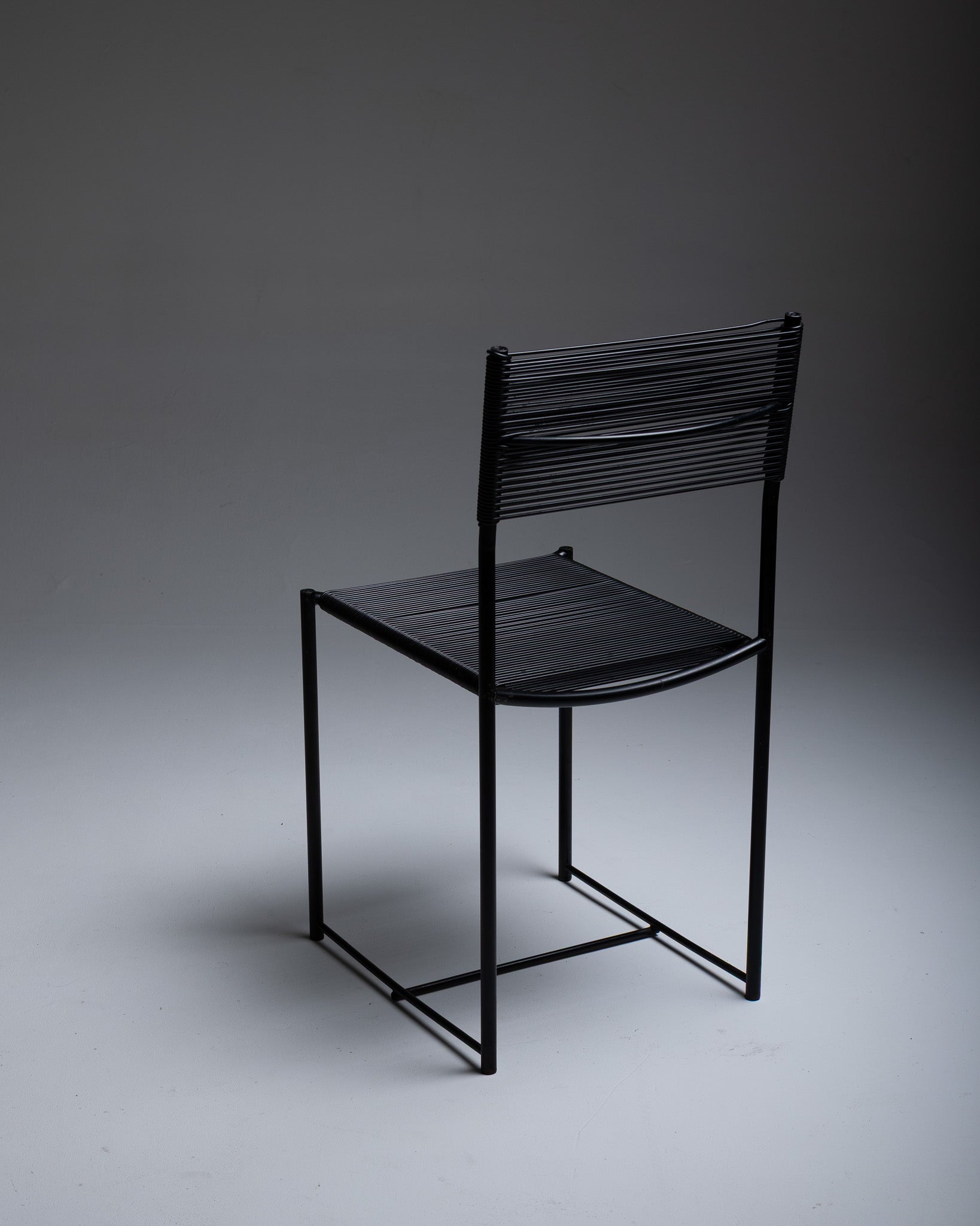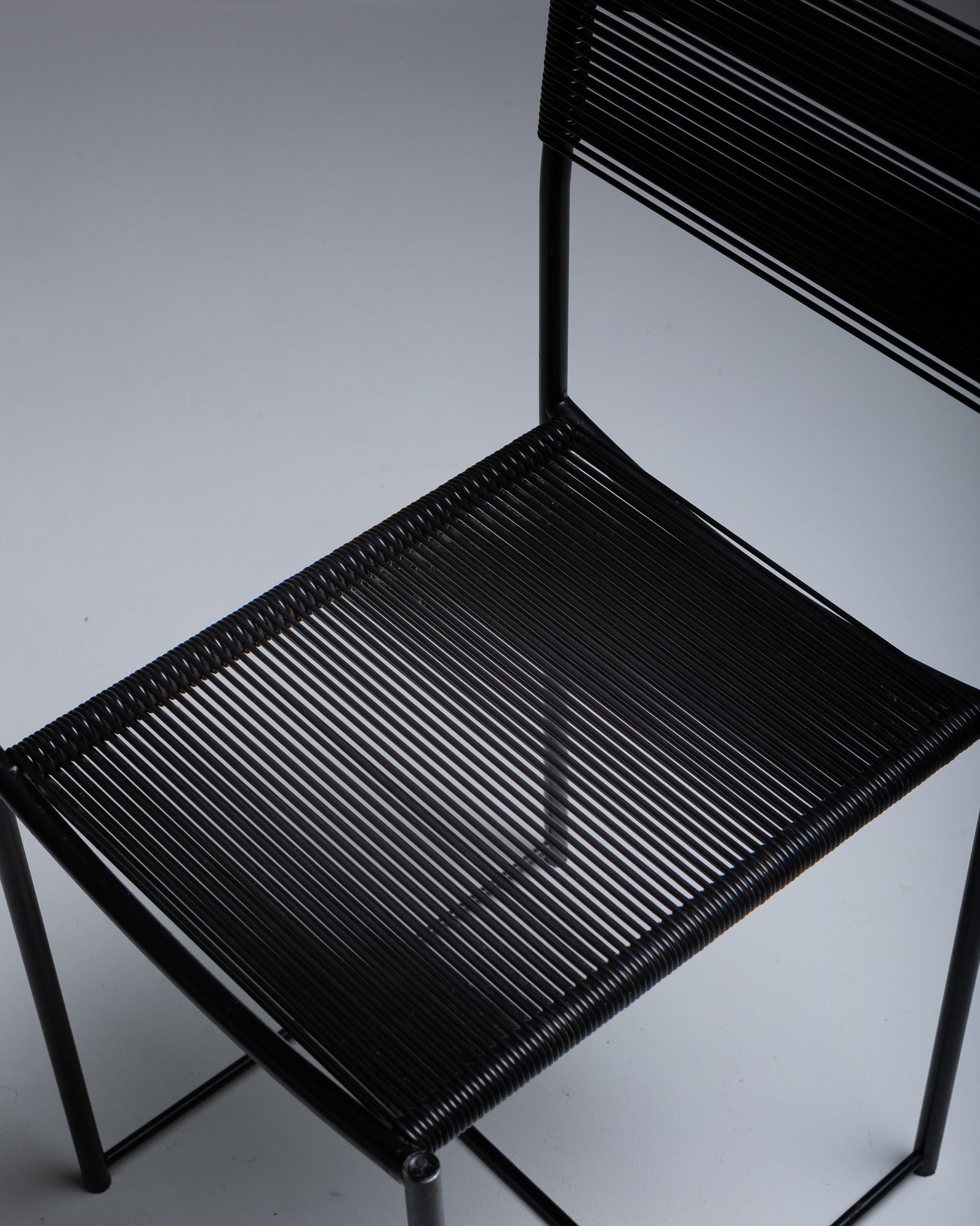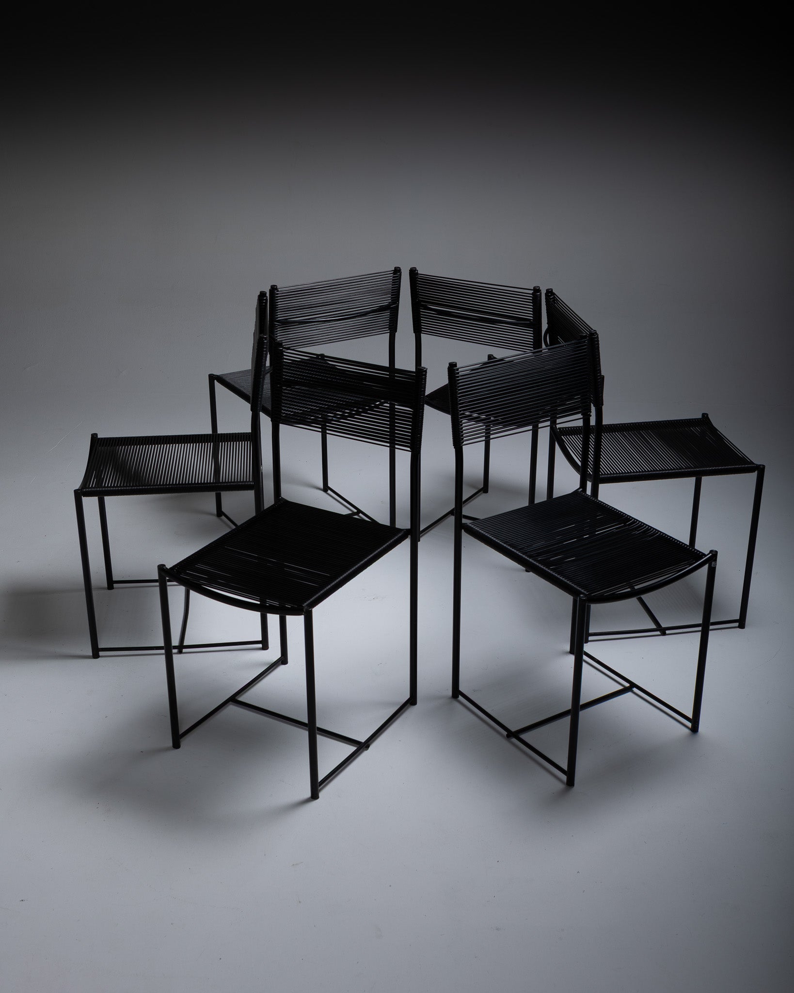 Set of six Spaghetti 101 chairs attributed to Giadomenico Belotti for Alias. Produced in Italy from 1979. Black lacquered metal frame with a PVC cord seat. The Spaghetti chair was the first Alias chair to enter the collection of the Museum of Modern Art (MoMA) in New York.
