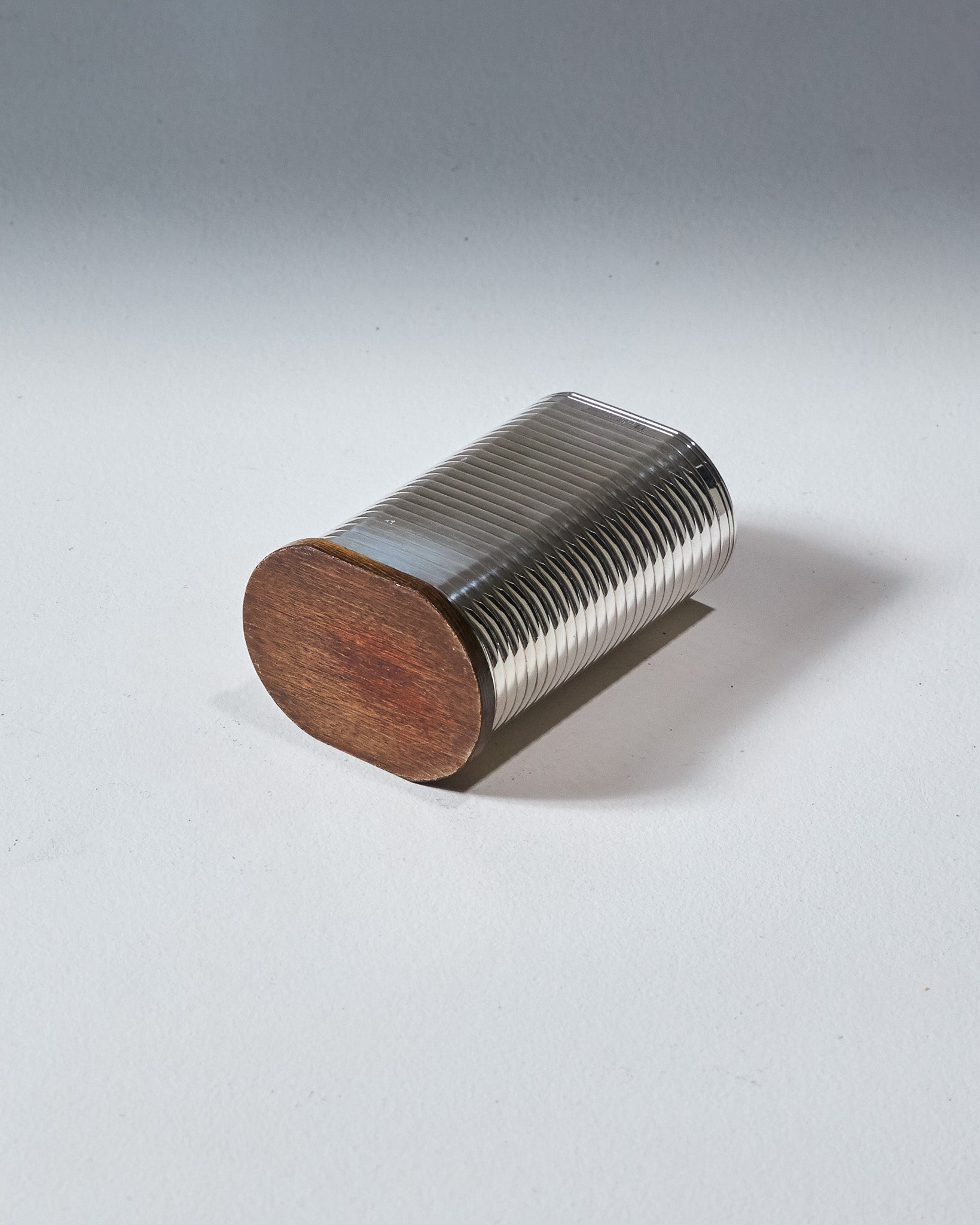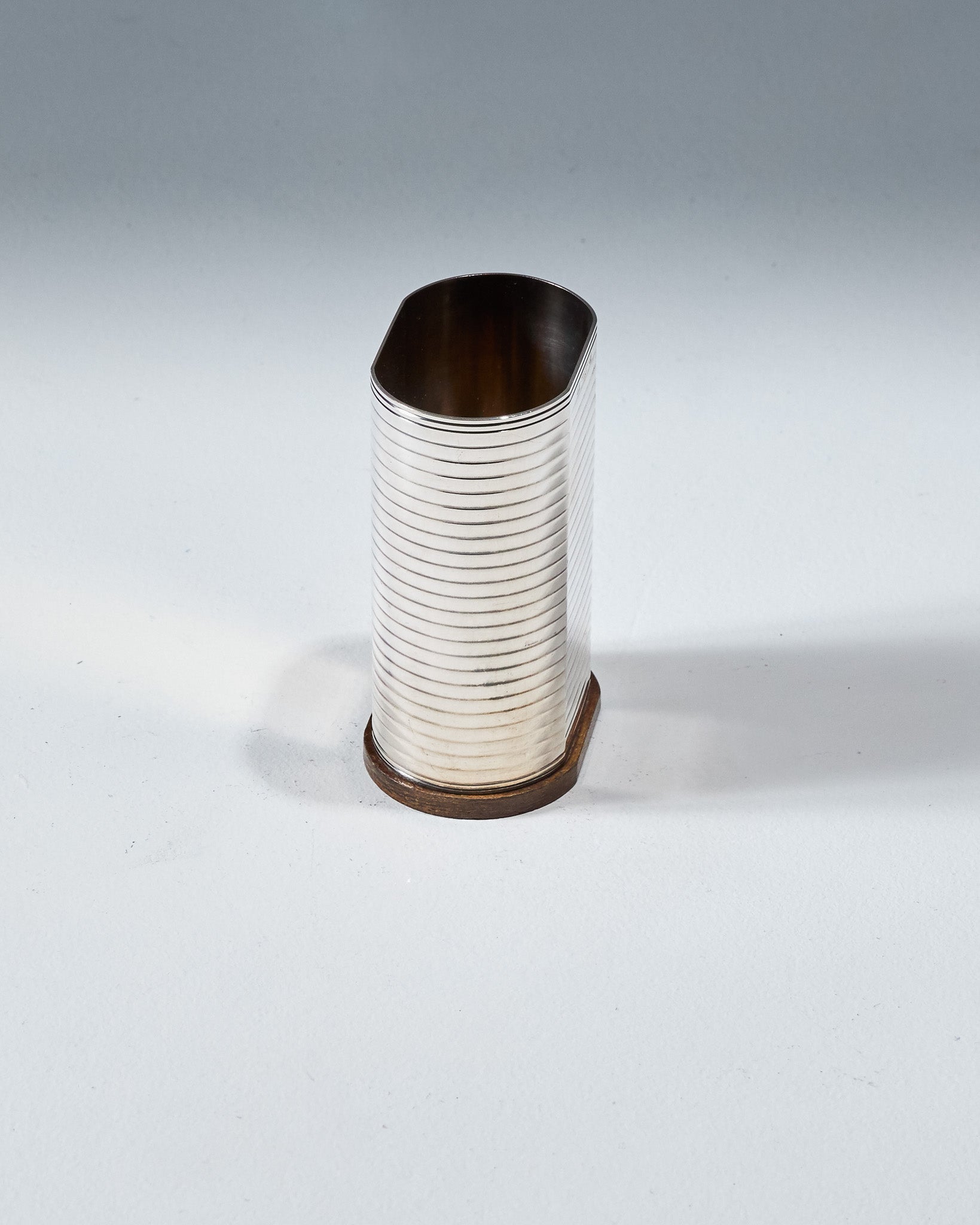 A rectangular, silver-plated metal pencil holder with rounded corners. The body is decorated with fine horizontal striations, the interior is smooth, and the base is slightly overhanging and made of wood. Stamped on the side "Christofle France " with the maker's mark. A piece in the style of the 1970s.
