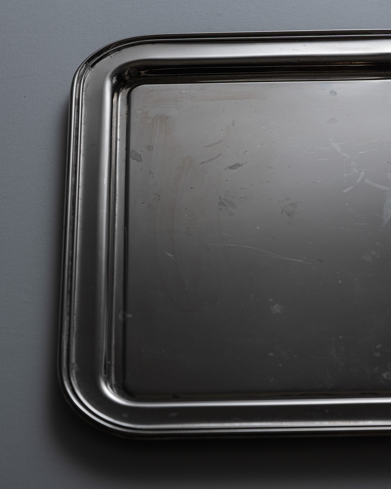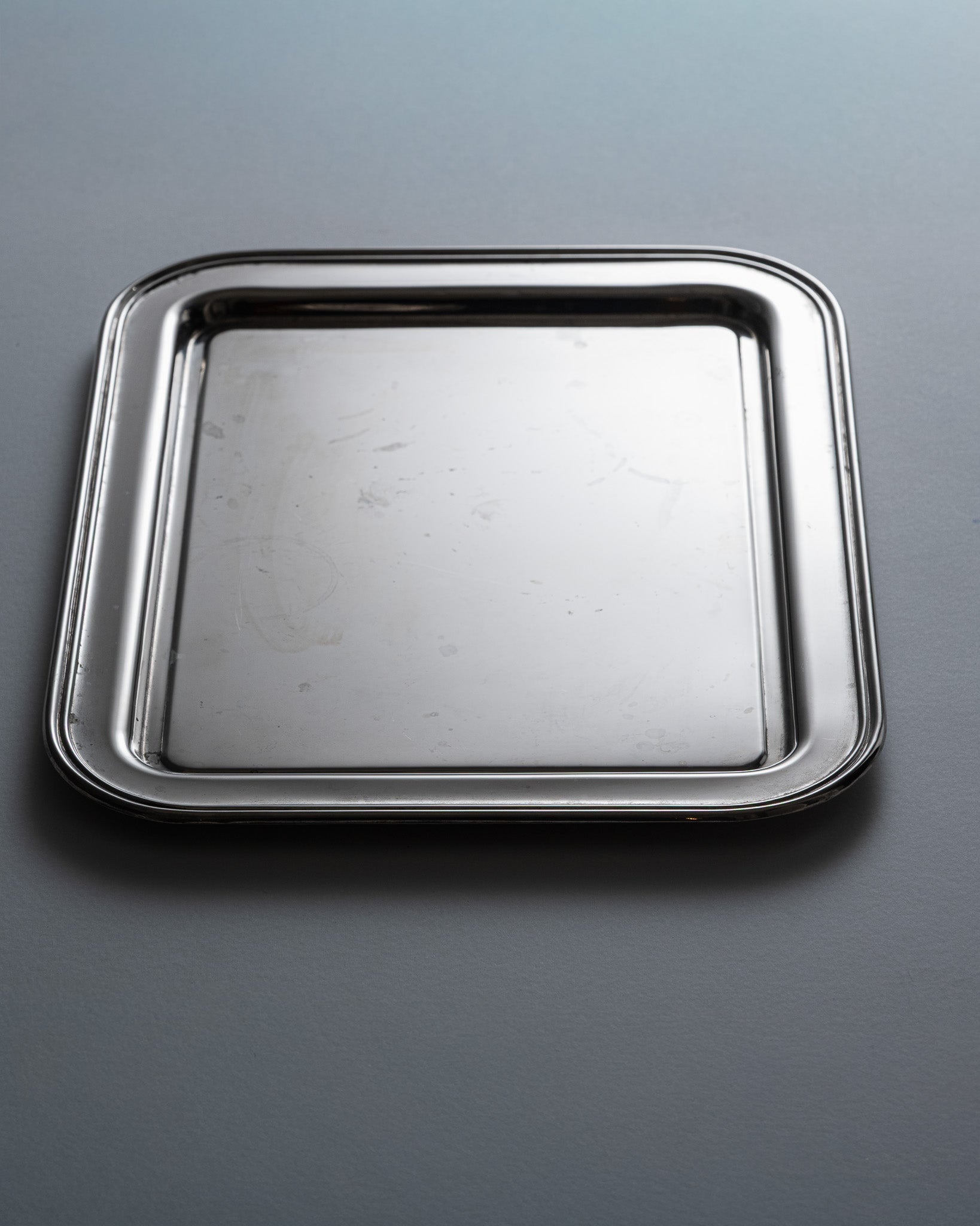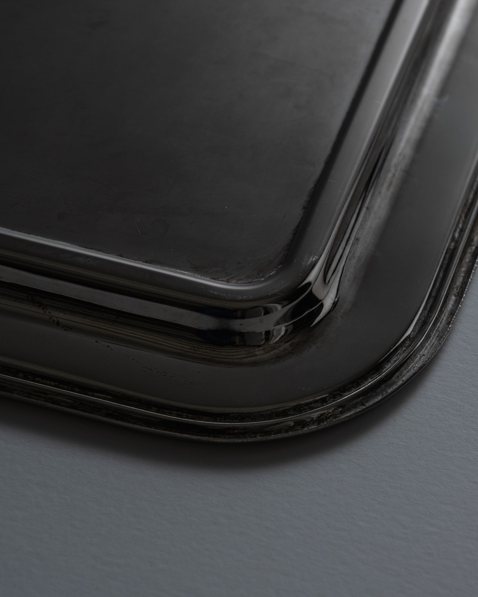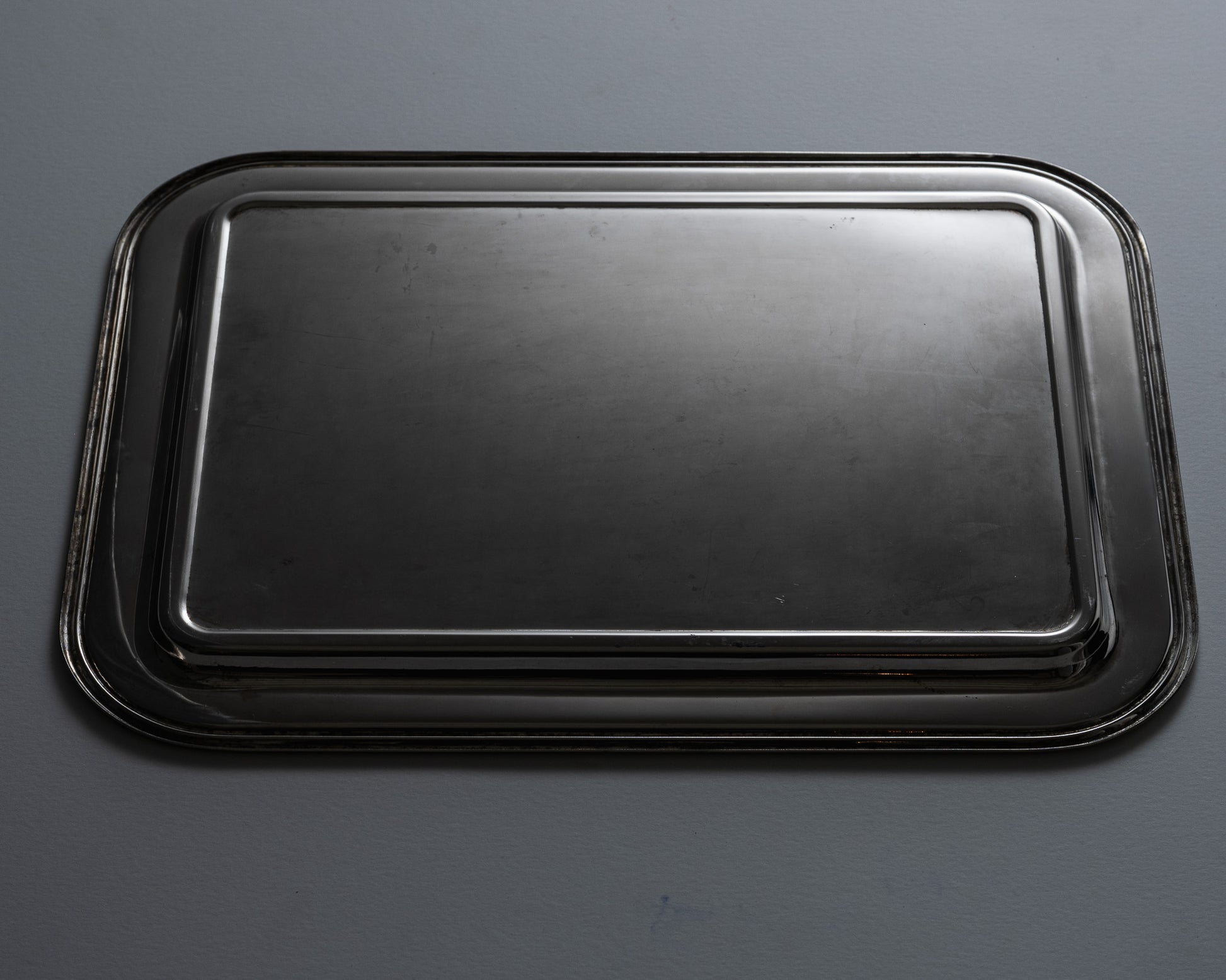 Silver-plated metal serving tray. Some signs of wear consistent with age and use. Good condition.