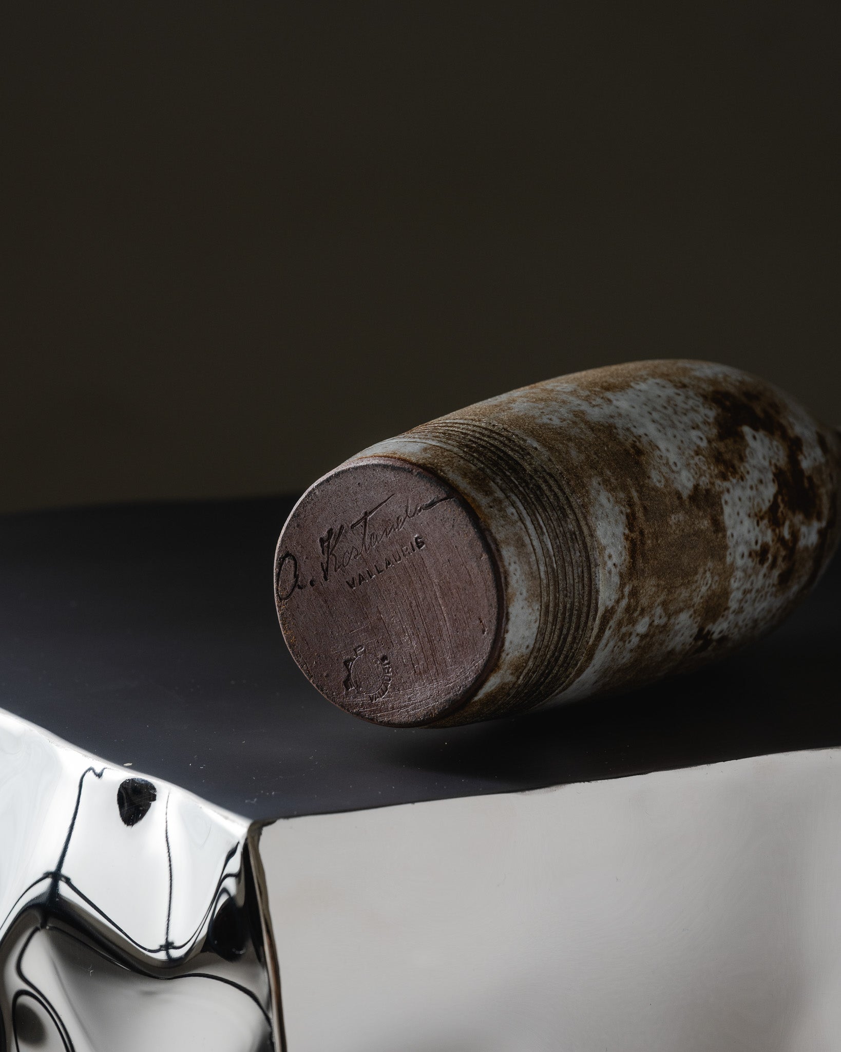 Brown and white glazed ceramic soliflore, decorated with bubbles and crystallizations typical of Vallauris production in the 1950s. Slender shape with a narrow neck. Ksotanda Vallauris incised signature under the base. French work, circa 1950. Perfect condition.