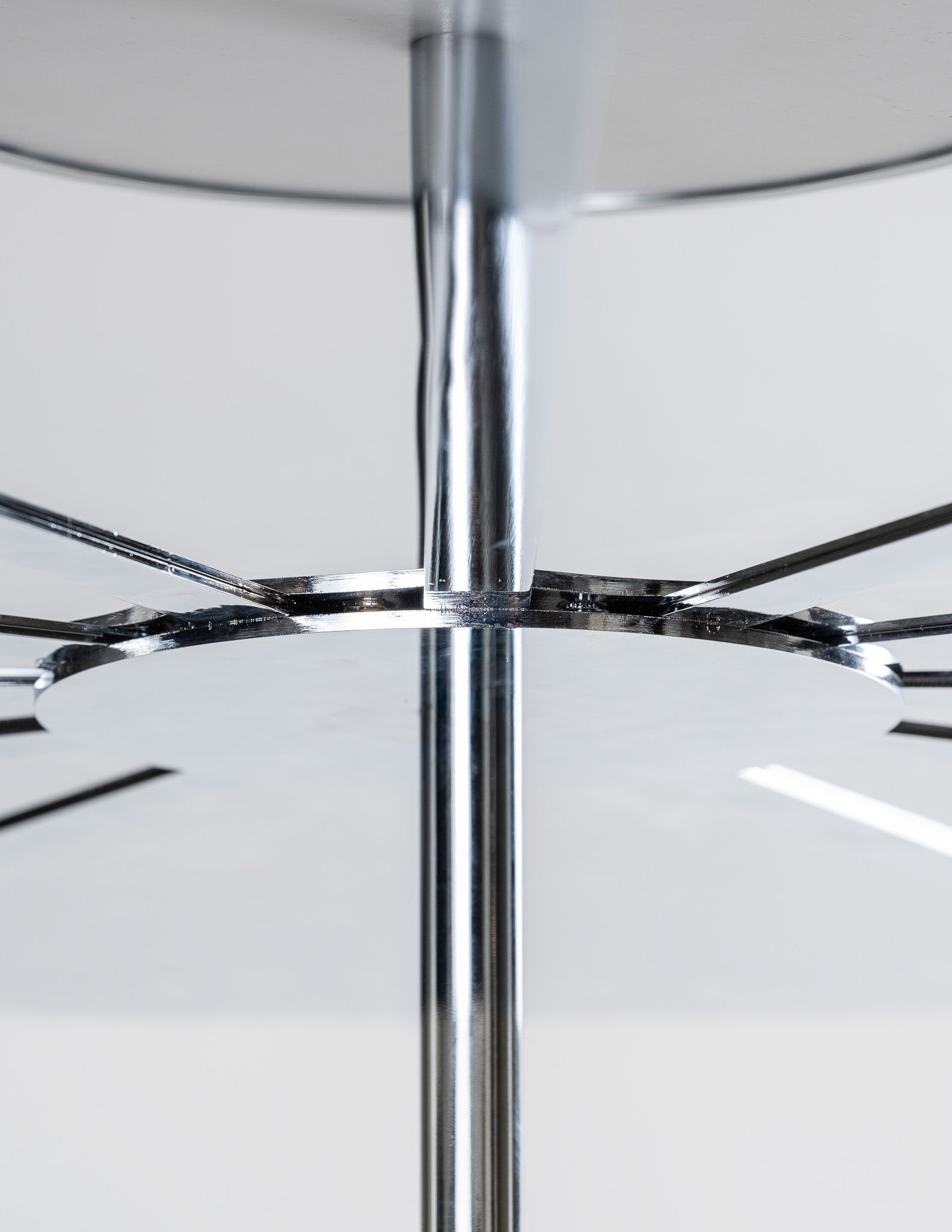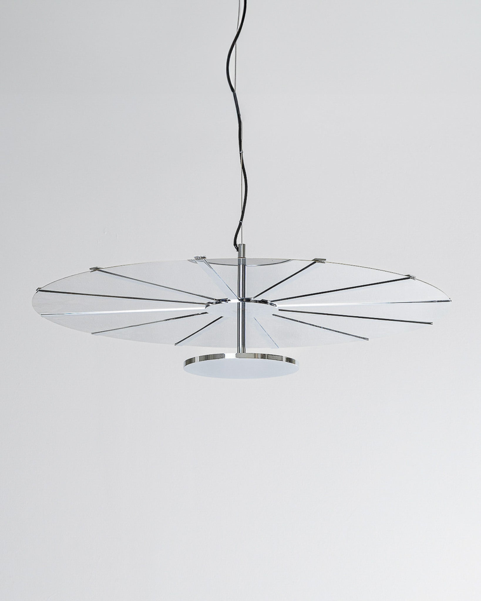 This model was produced exclusively for Galerie Paradis in this finish. Composed of two discs connected by a central structure and slender metal rods, the pendant features a graphic, well-balanced form.