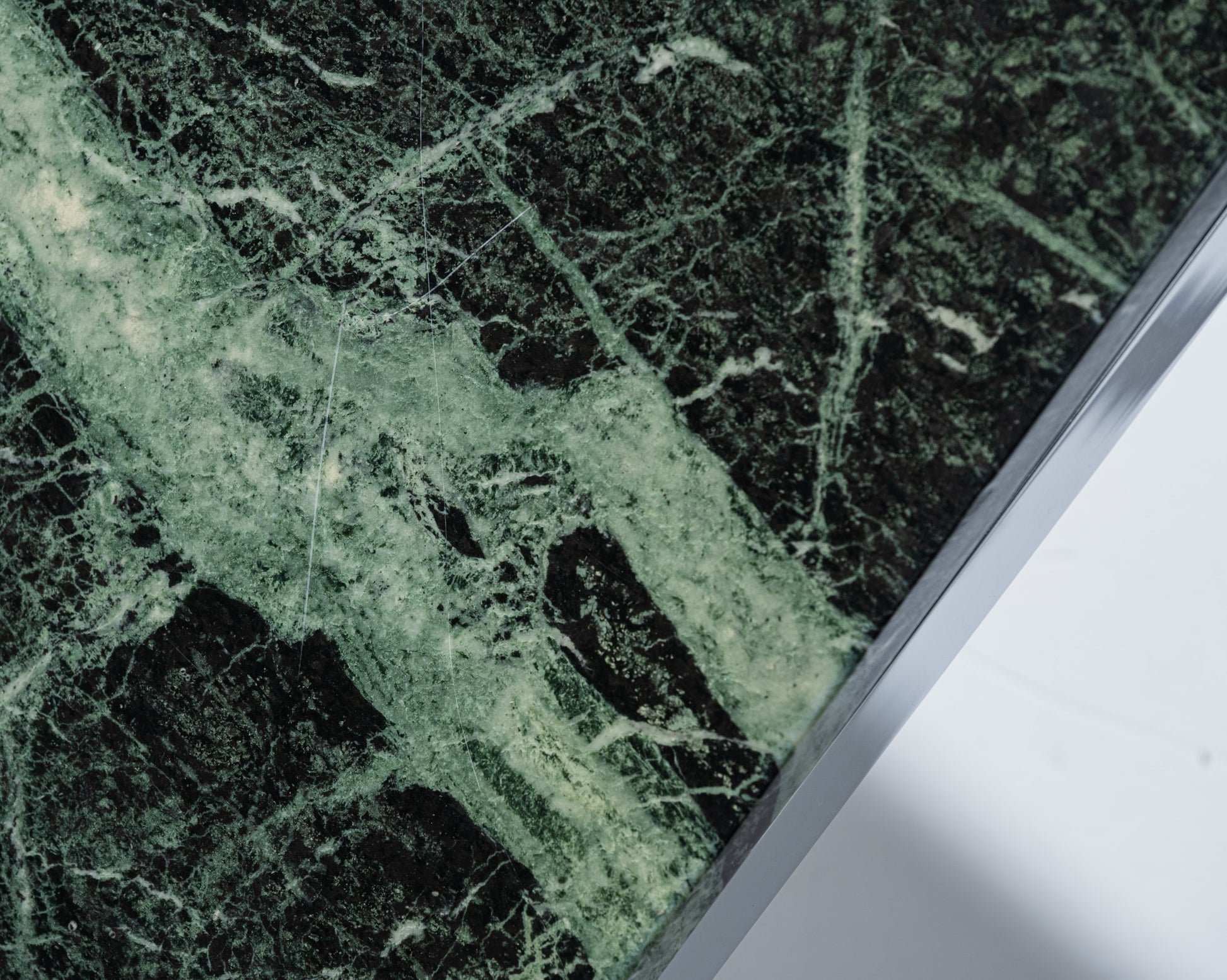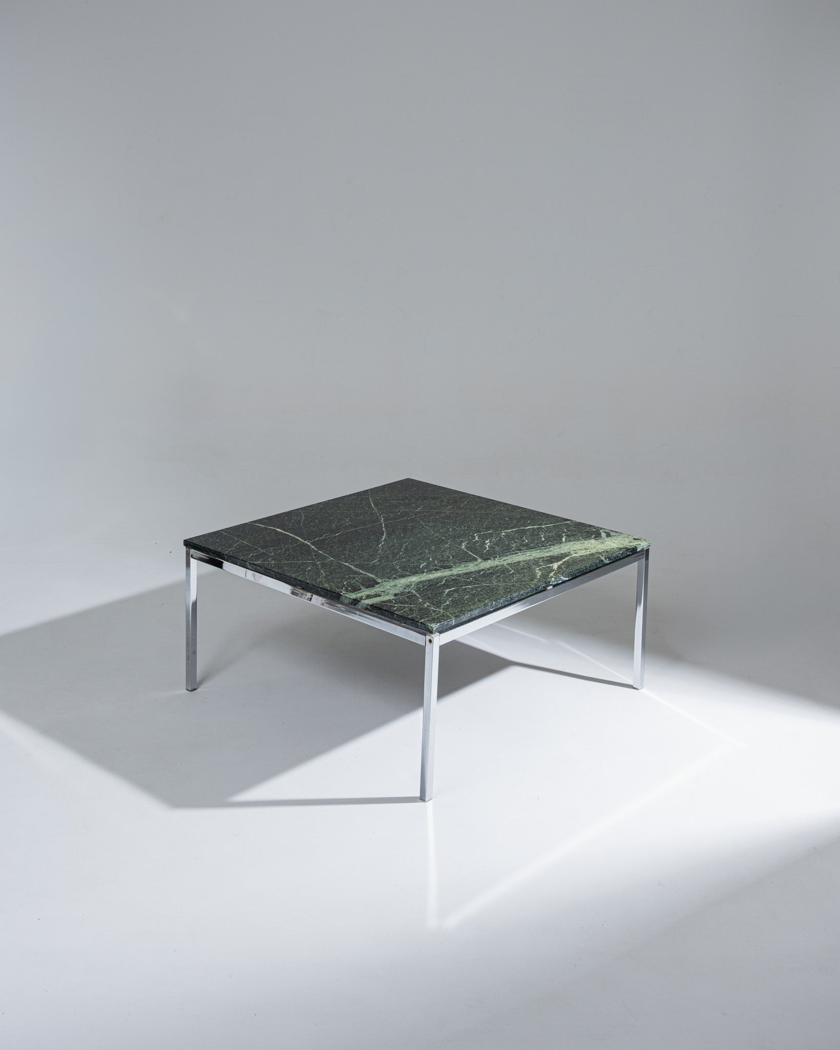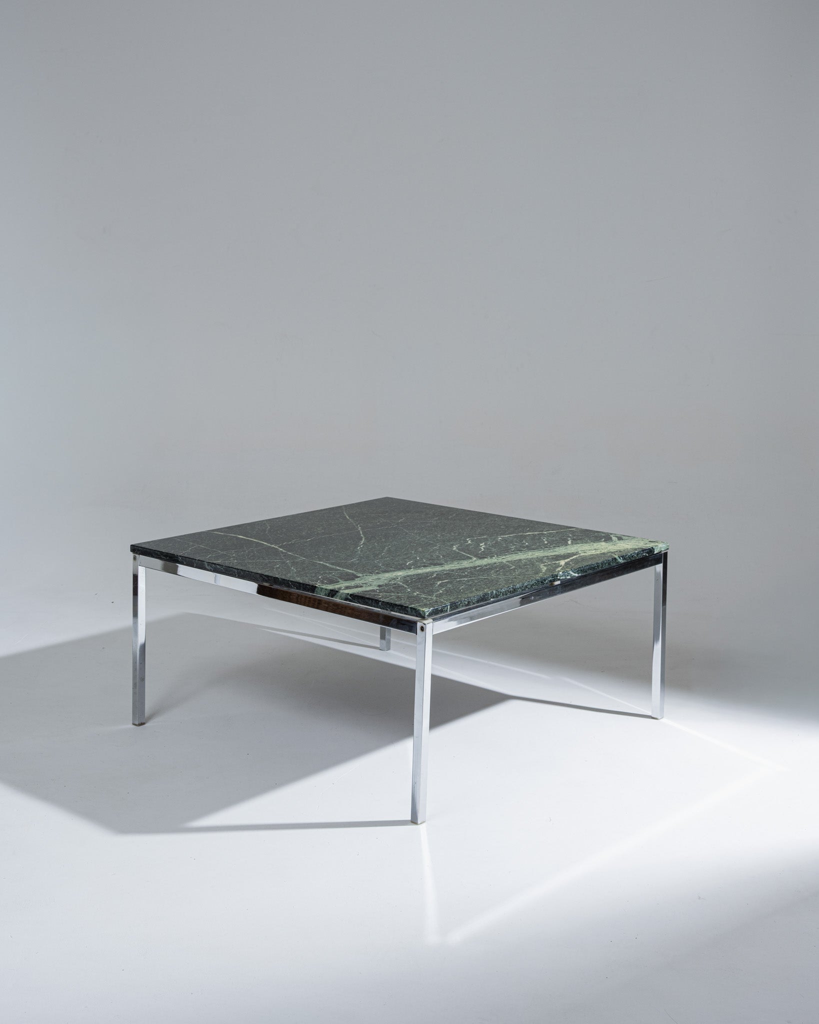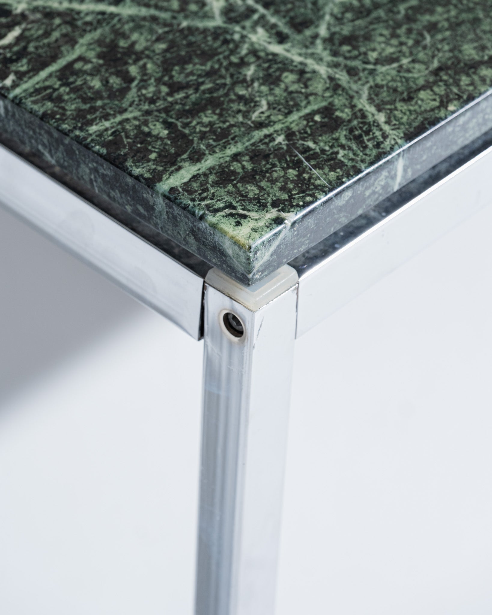 Square coffee table in green marble from the 1970s. It has a large marble top resting on a metal base. The base shows slight instability at one leg due to the weight of the tabletop; overall, it is in good condition.