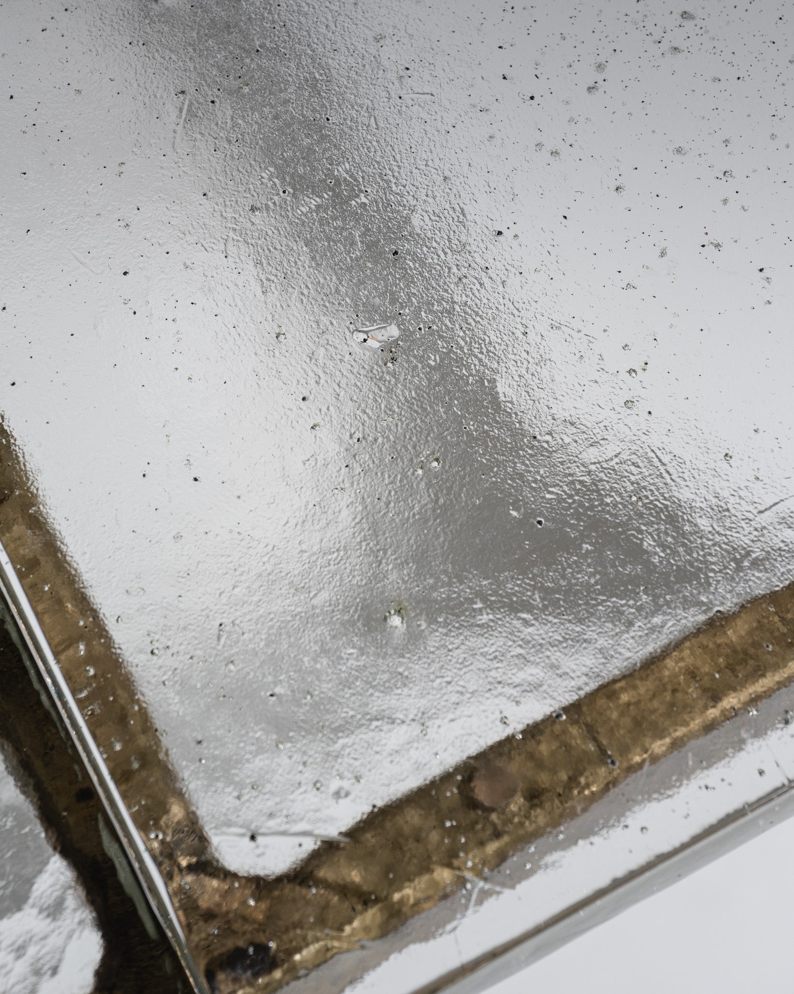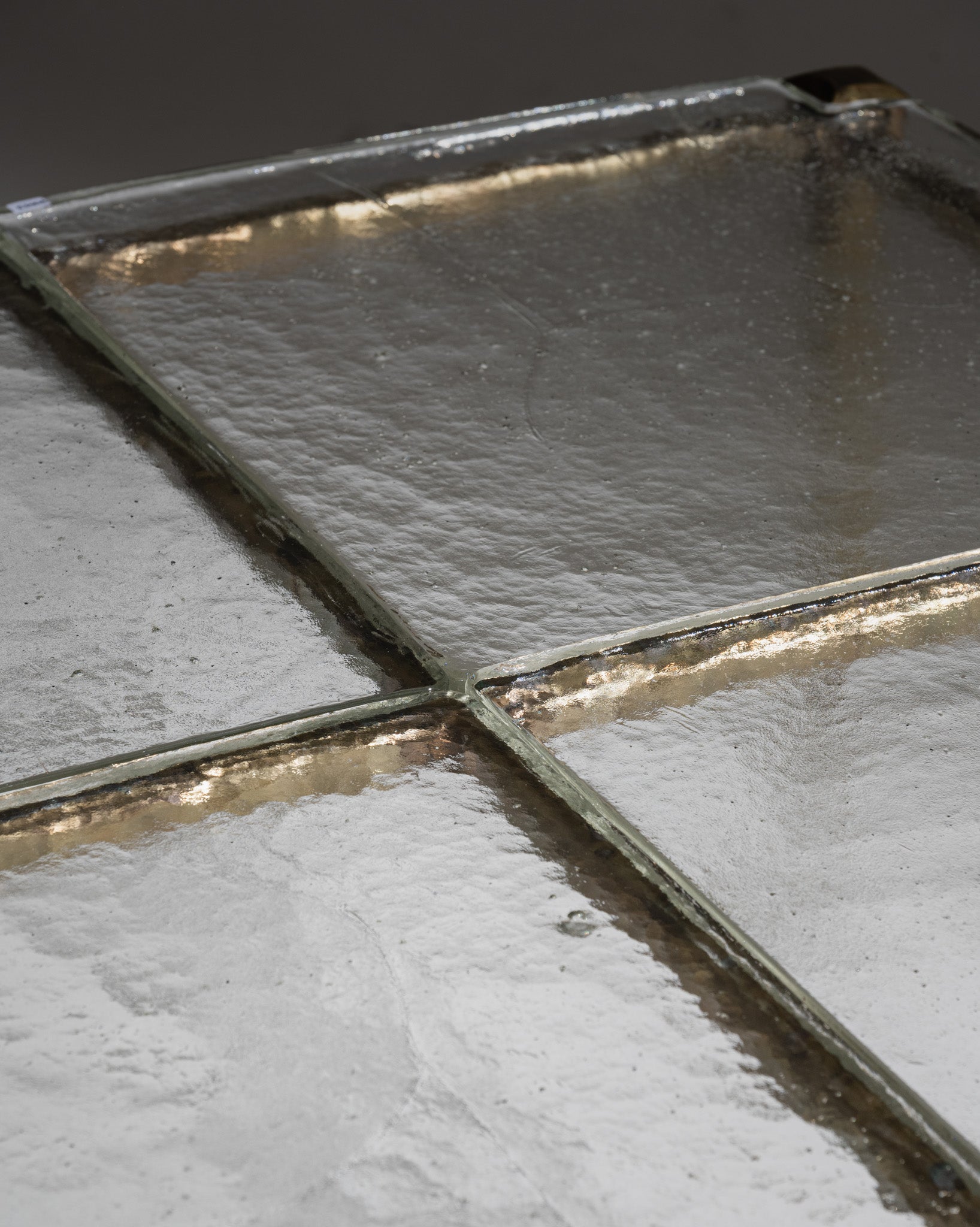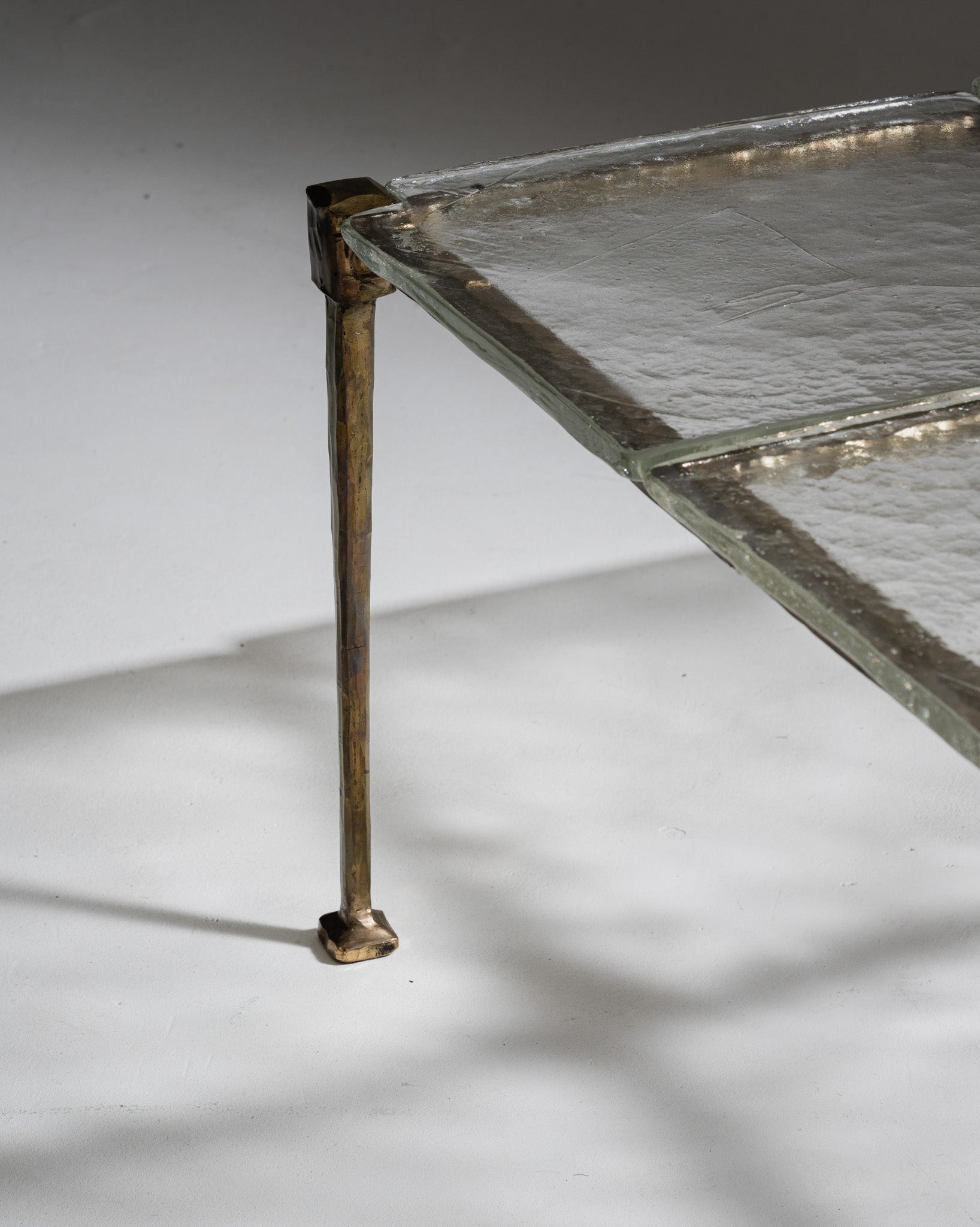 Brutalist bronze and thick glass coffee table by German artist Lothar Klute, circa 1985. The square, textured glass top is divided into four sections and rests on a frame of four slender bronze legs, finished with small sabots. In superb condition.
