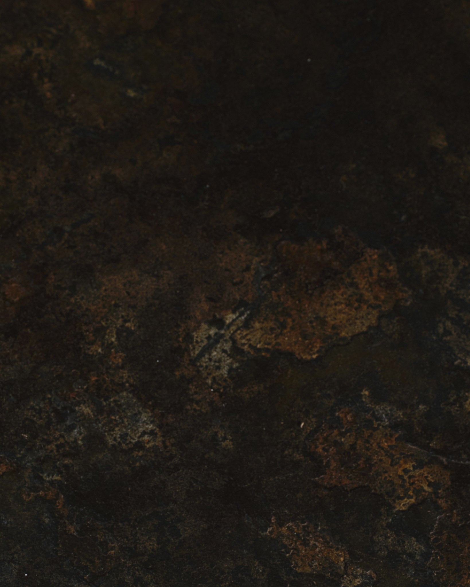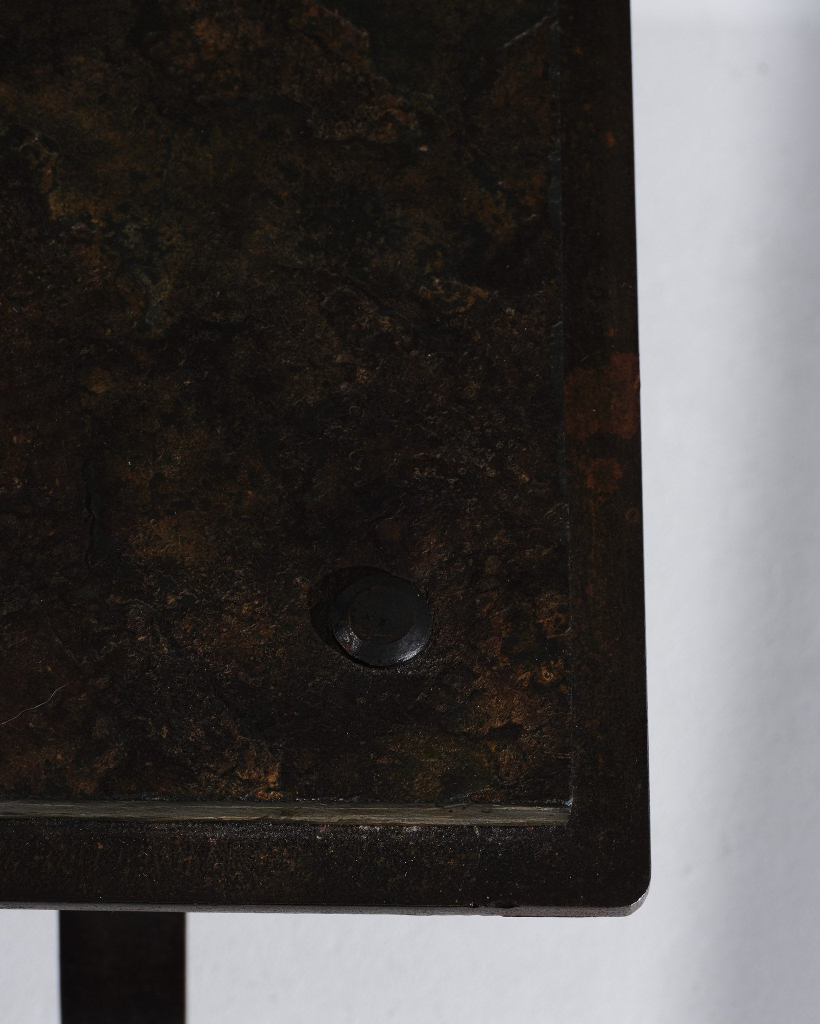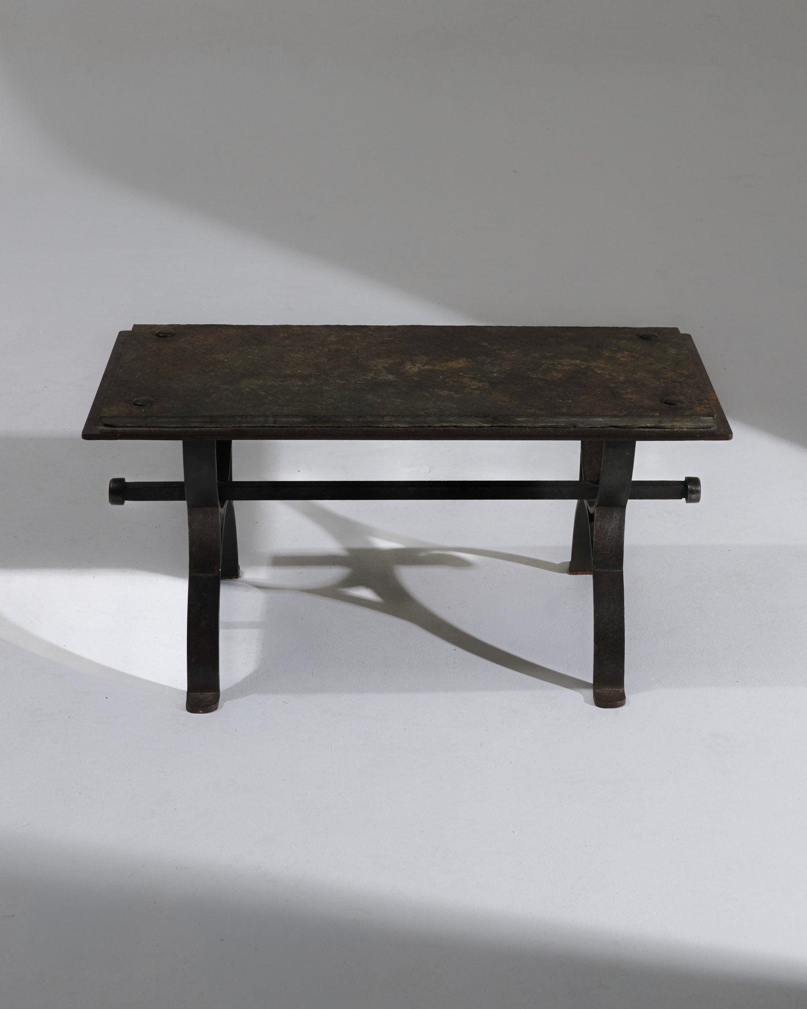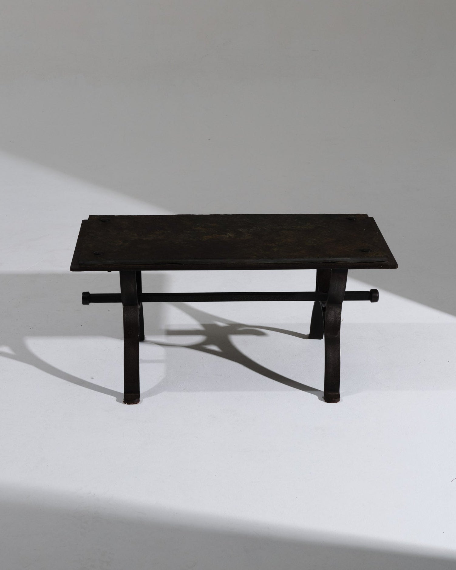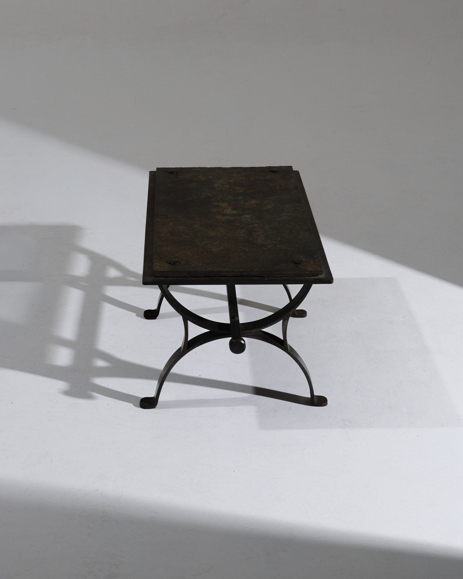 Rectangular coffee table with a patinated wrought iron base, topped with a natural slate surface in deep hues. The riveted details and curved structure give the piece a handcrafted character, typical of French ironwork from the 1950s. Very good condition.