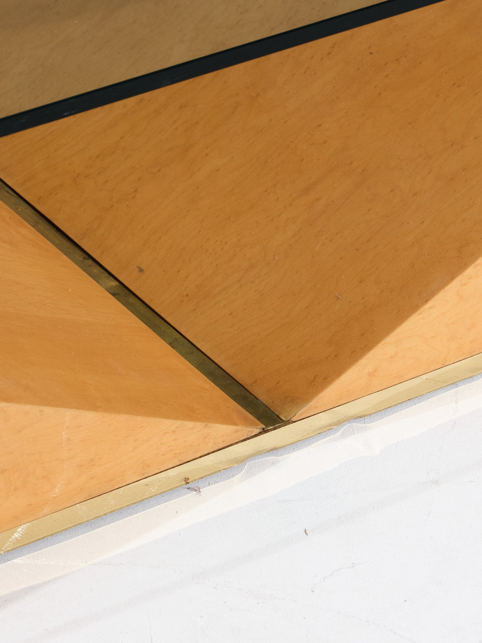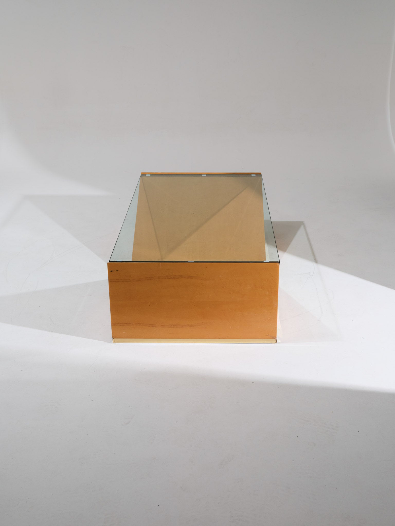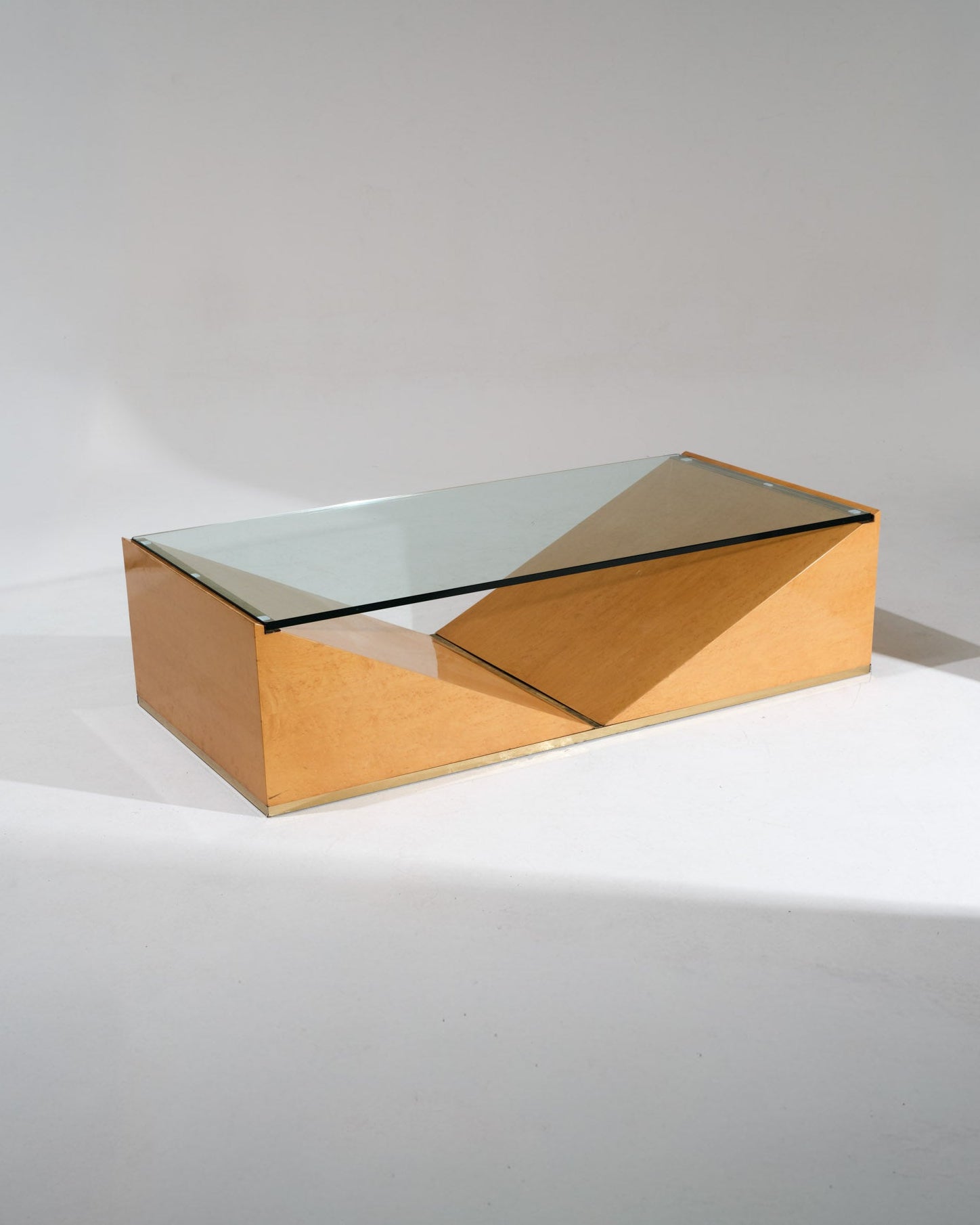 A rectangular coffee table by Roche Bobois, featuring a geometric structure in the shape of an inverted "V". Its solid elm burl base highlights a beveled glass top, offering an elegant contrast between transparency and wood.
