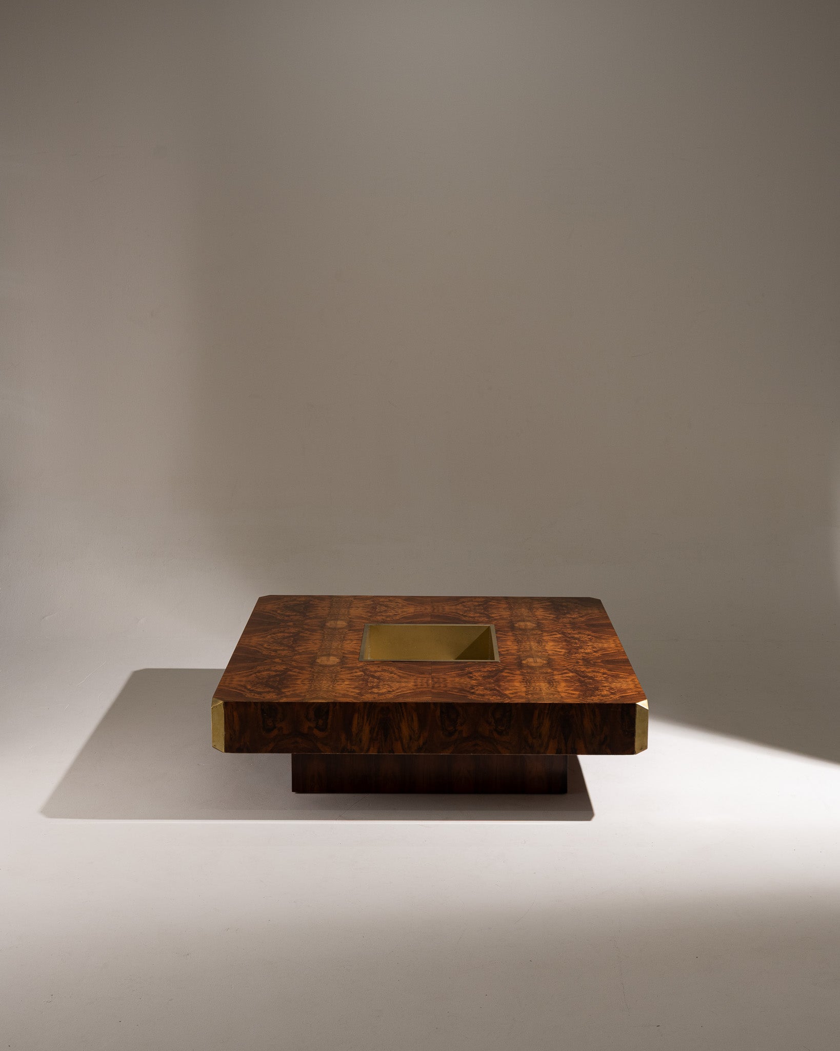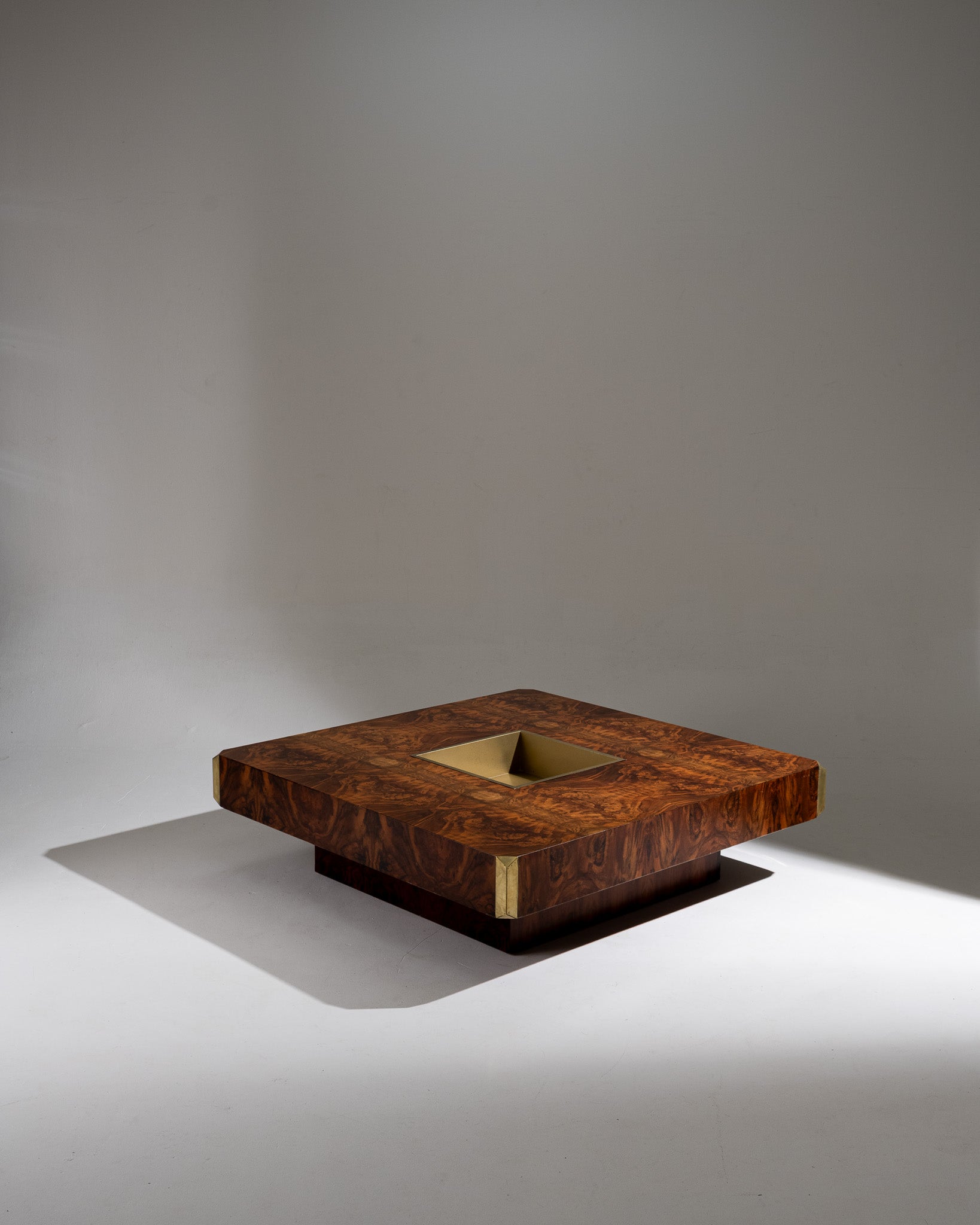Square coffee table in elm burl by Willy Rizzo, dating from the 1970s. Thick burl top with dense, contrasting grain. Square hollowed-out center, finished in brass. Low structure with solid volumes and clean edges. Corners emphasized by brass elements.