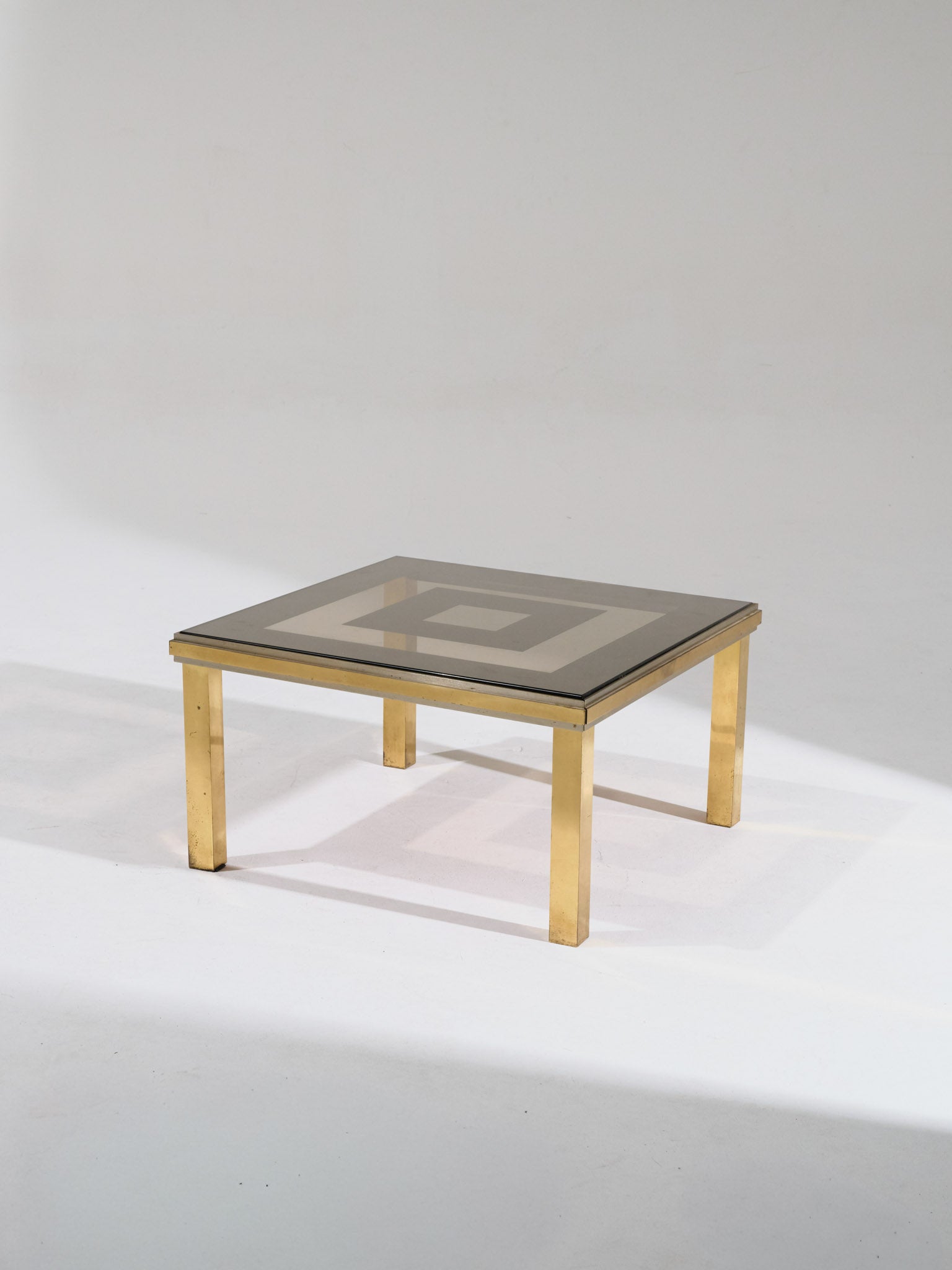 Square coffee table composed of a polished brass frame and a double smoked glass top. The geometric lines and the metal's sheen highlight the aesthetic spirit of 1970s Italian design. Good overall condition, slight patina on the brass.
