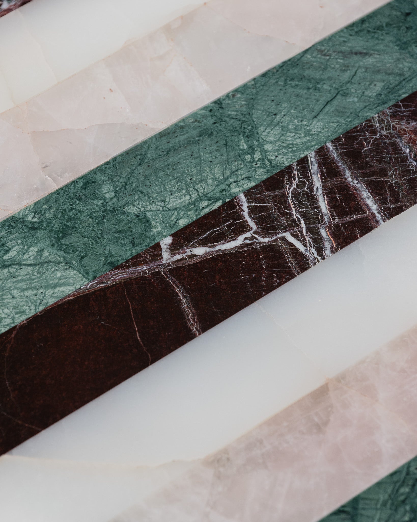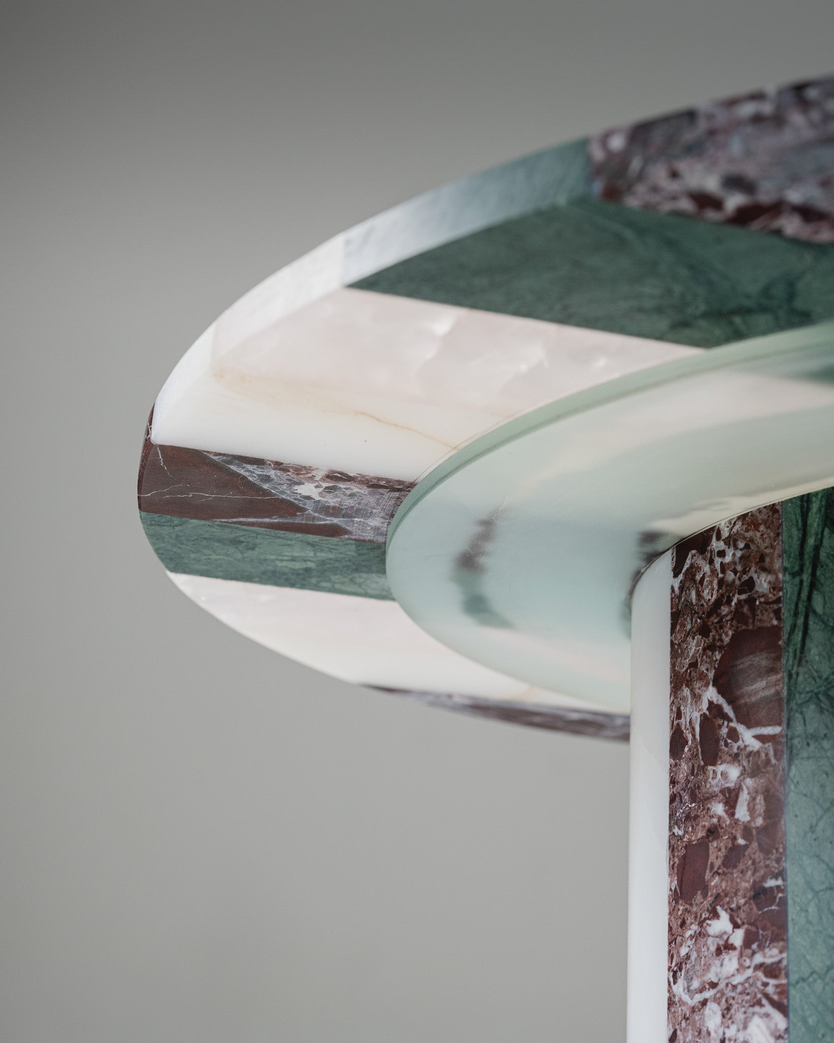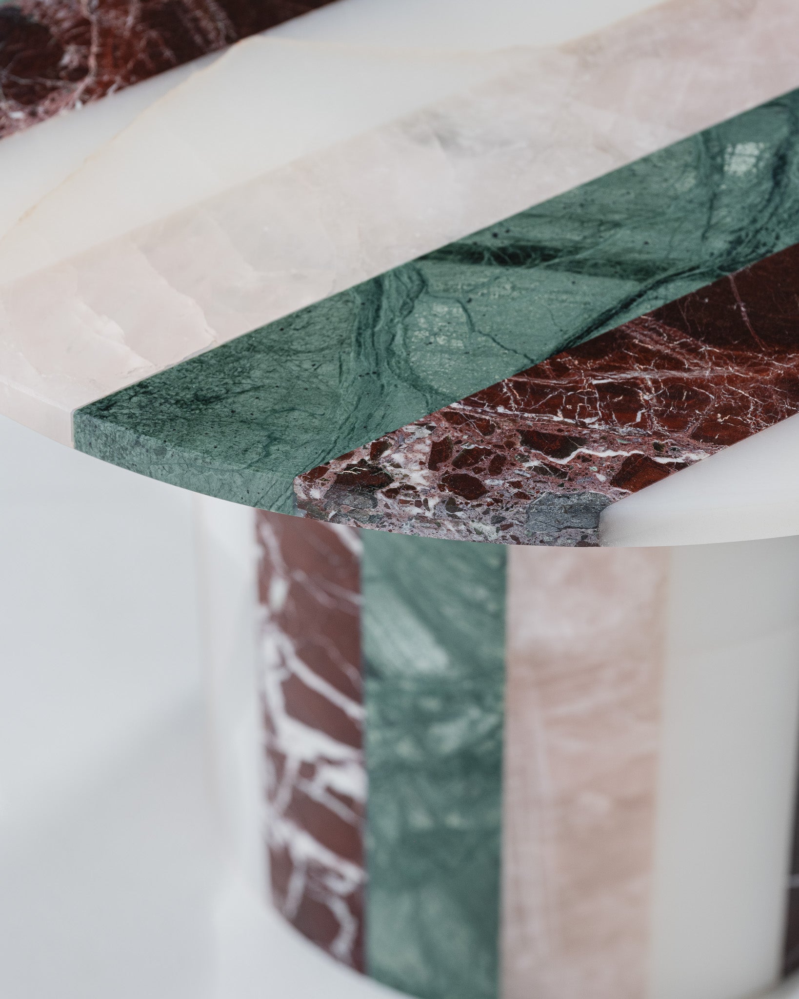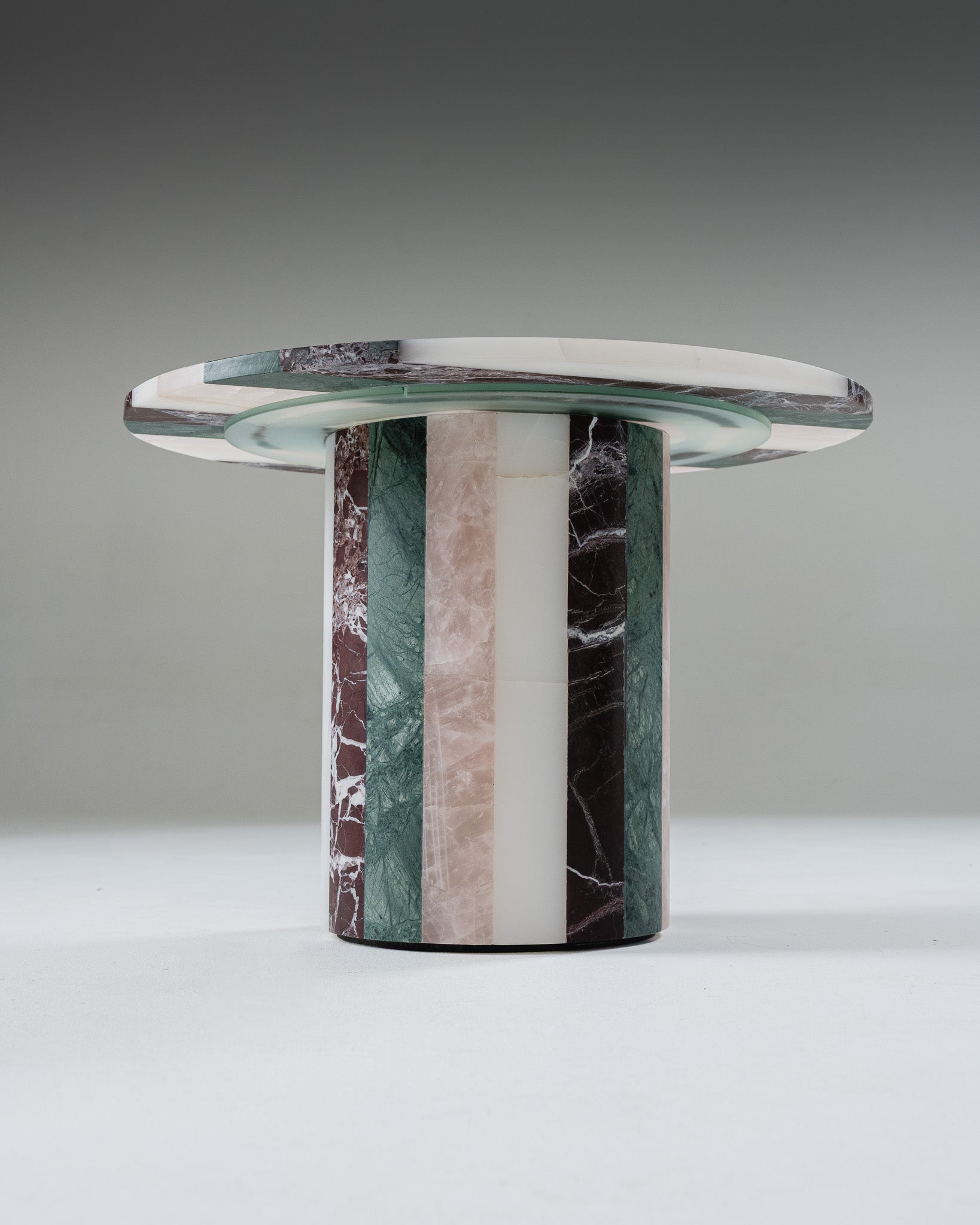 Studio Gaïa celebrates high-quality stone marquetry through unique pieces, such as this side table in colored and striped onyx.