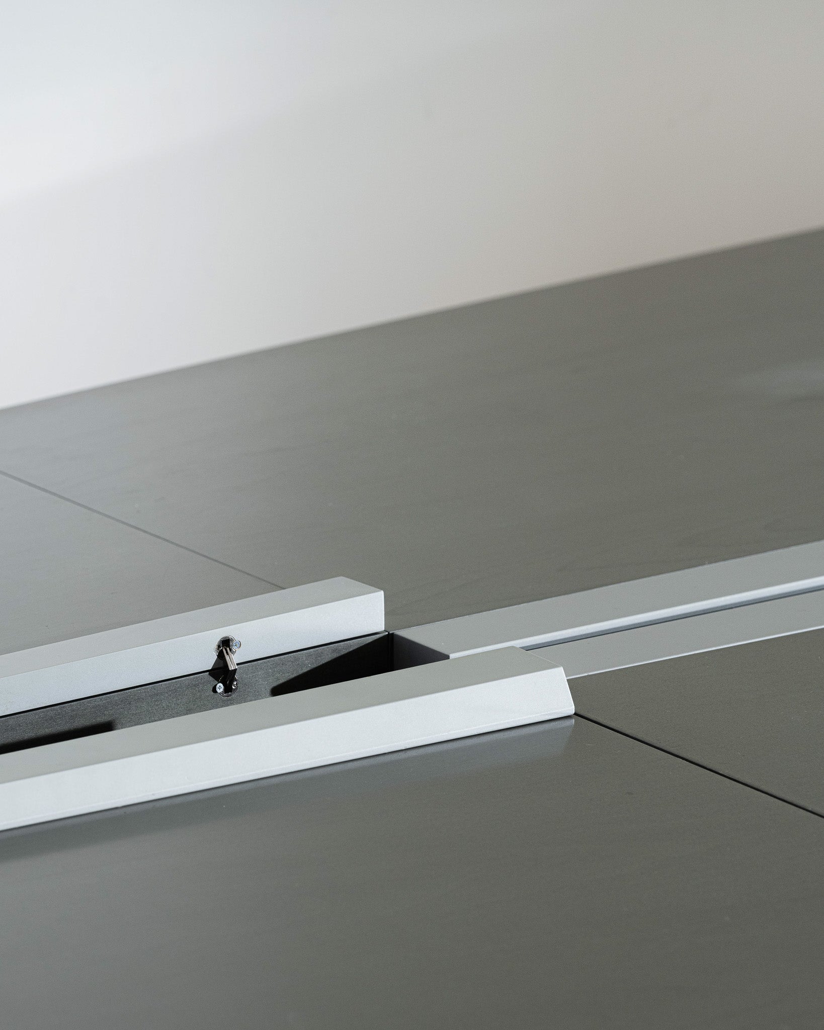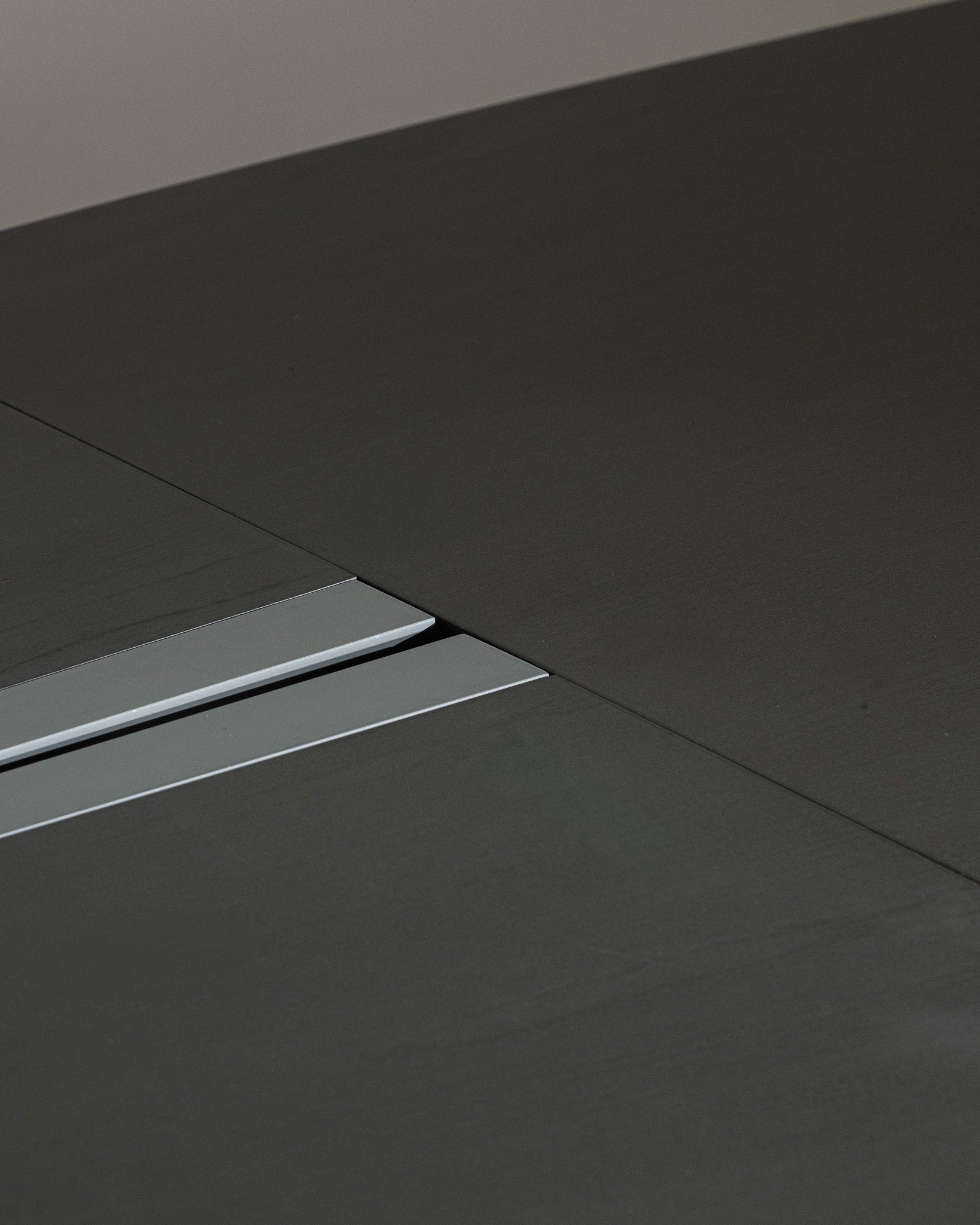 Large, elongated conference table. Grey-stained wooden top, composed of several assembled elements with rounded ends. Metal frame and legs. Modular design allowing for disassembly.