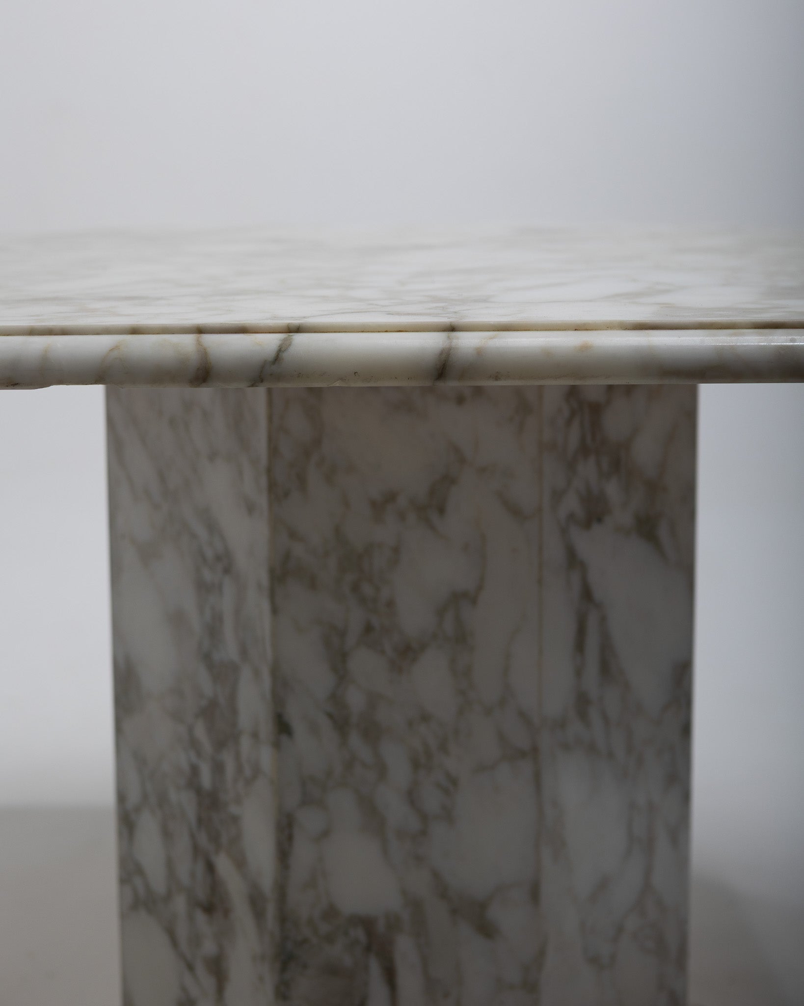 Large dining table in white marble veined with grey, in the style of the 1970s. The tabletop The octagonal base rests on a central marble pedestal. The entire assembly can be detached from the base for easier transport.