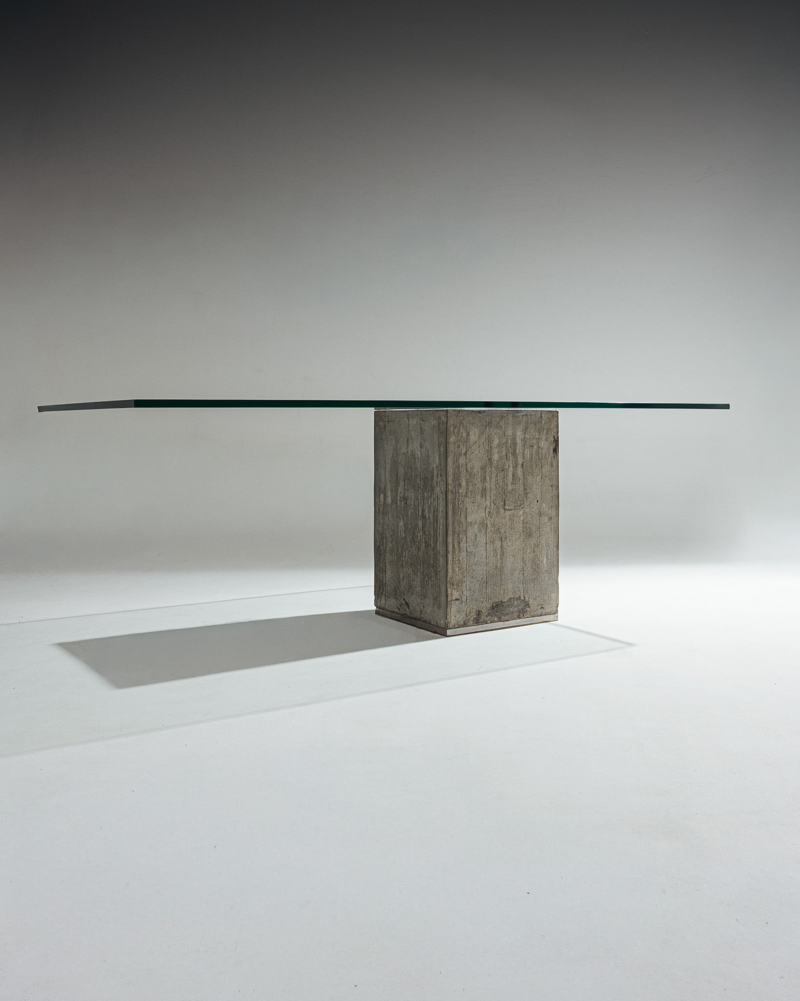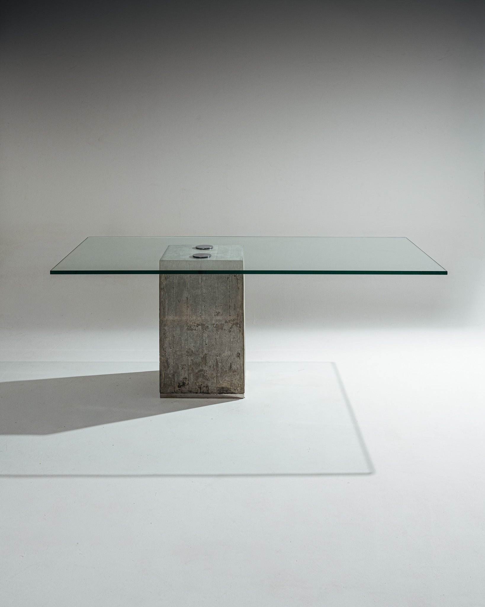 The Sapo dining table, designed by Sergio and Giorgio Saporiti for Saporiti Italia in the 1970s, is emblematic of Italian Brutalist design. It features a large rectangular glass top resting on a monolithic base of raw concrete. The top is secured by two exposed metal elements, a signature technical feature of the design.