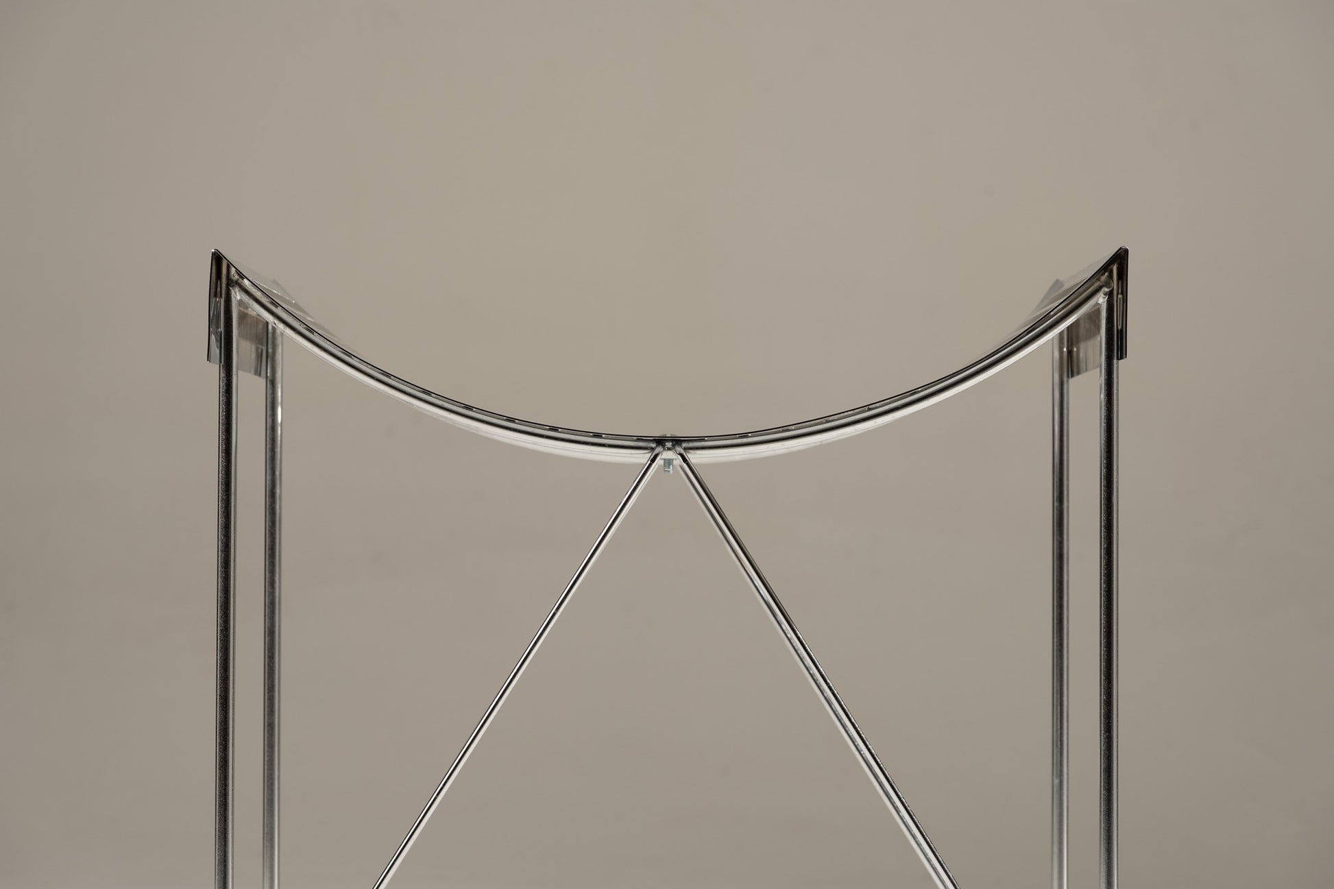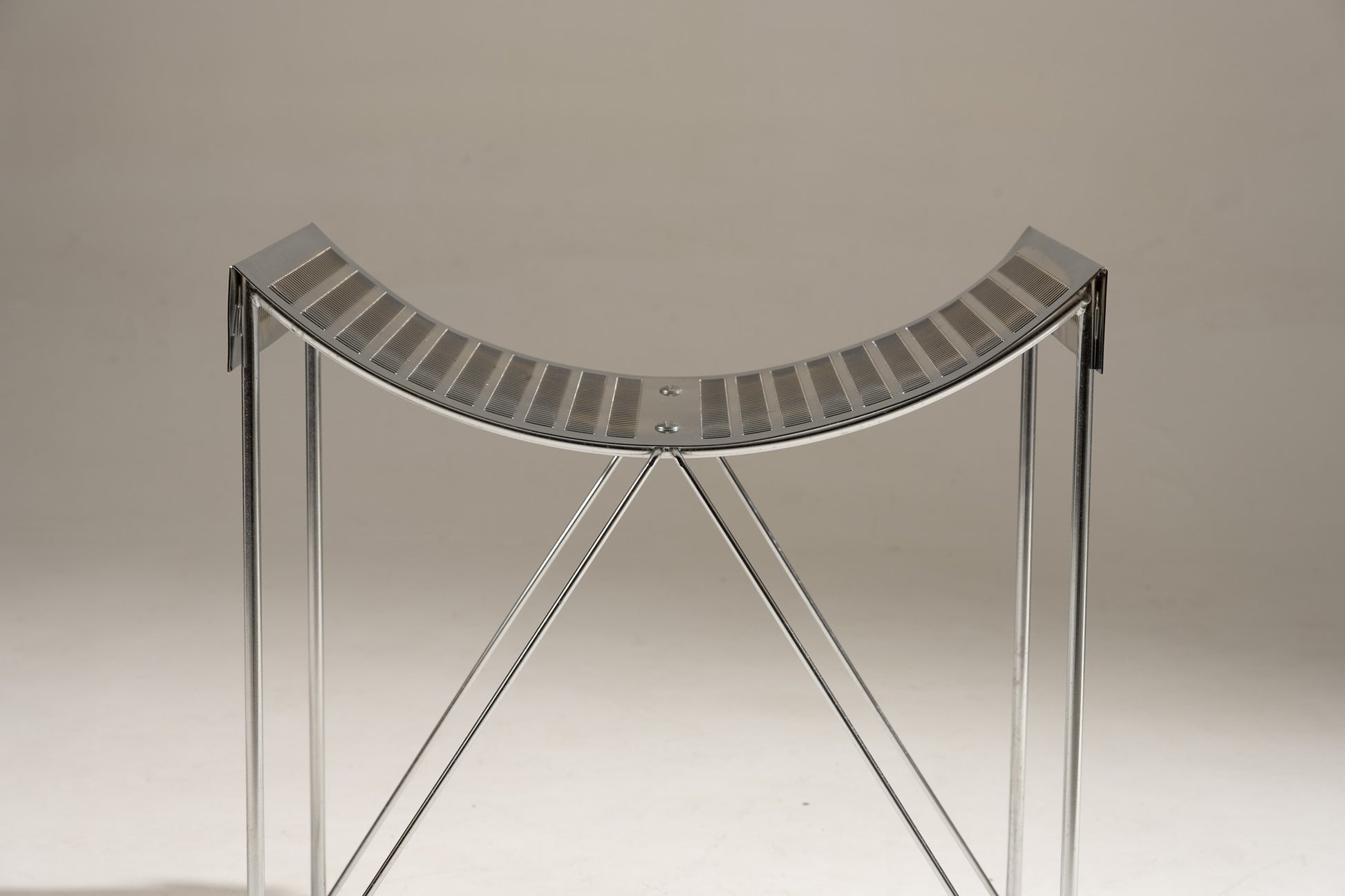 Minimalist metal stool, composed of a light and graphic tubular structure forming a cross-shaped base. The seat, made of perforated metal strips, creates an undulating line.