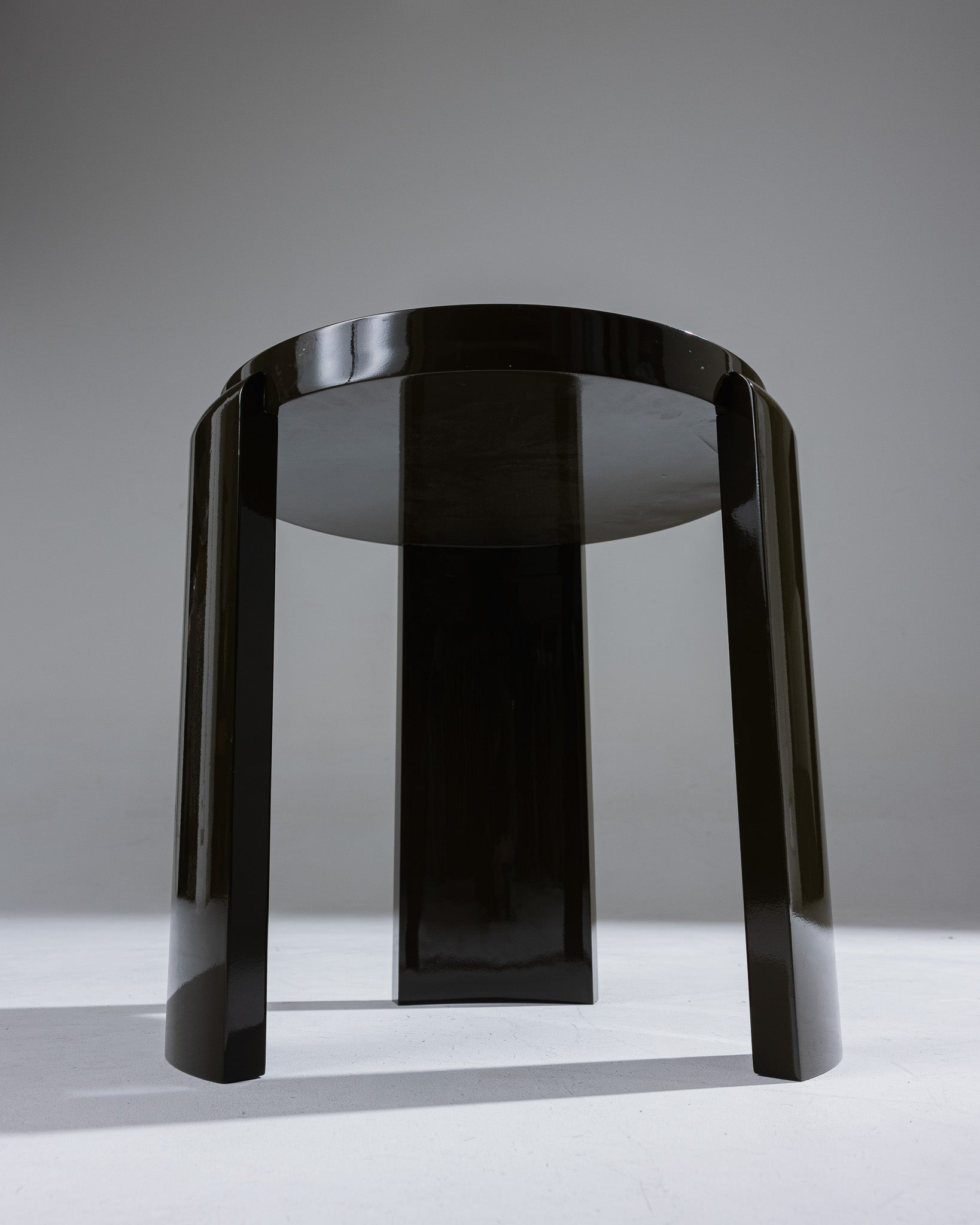 SPINA STOOL stool in solid oak, finished in olive green lacquer, by Louise Roe. Tripod design with a circular seat and widened central leg. Can be used as a stool or a small side table.