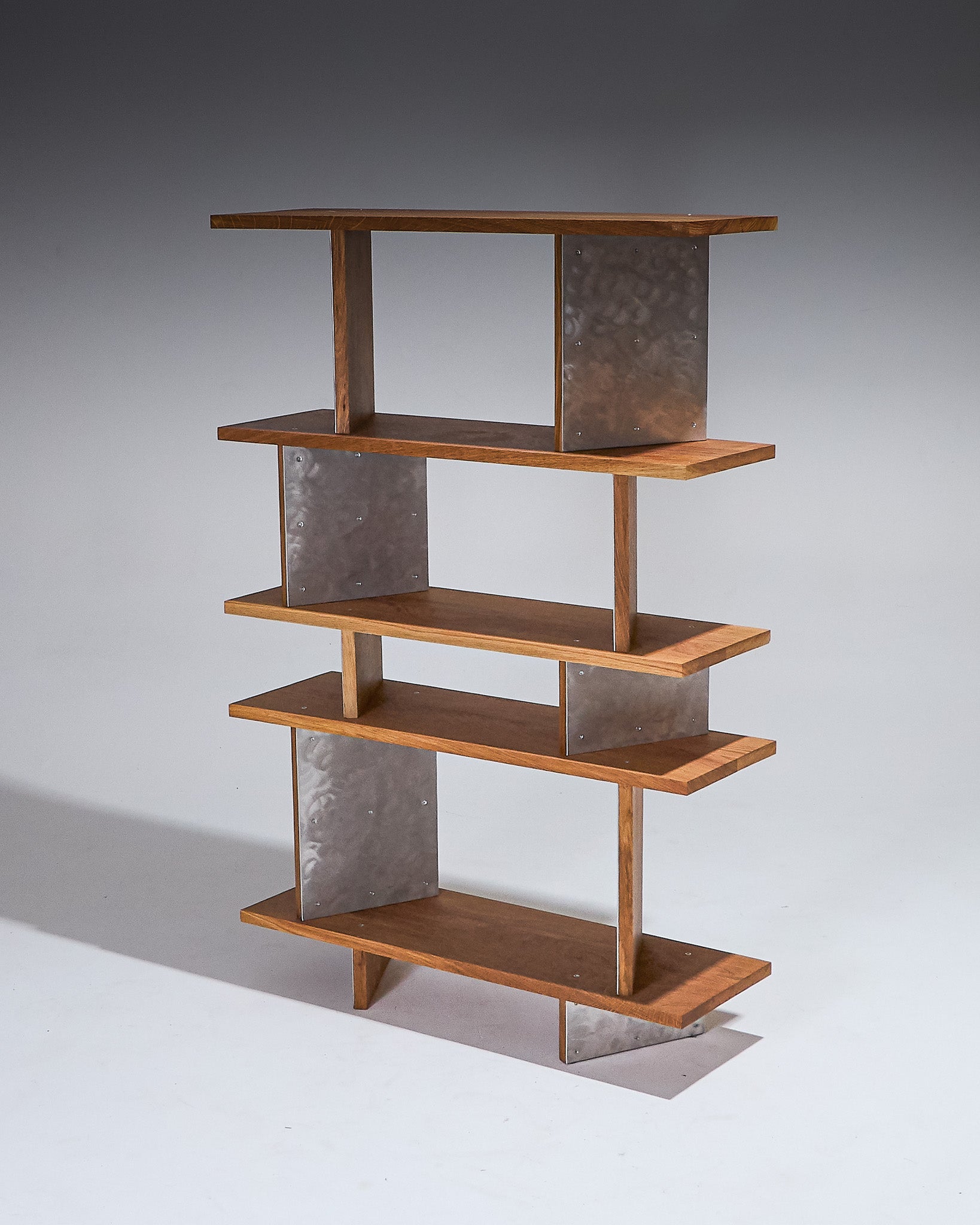 Torx shelving unit by designer Hugo Periesse, exclusive to Galerie Paradis. Structure composed of solid wood shelves and uprights, assembled with vertical metal elements in a silver finish with a patinated appearance. Asymmetrical staggered arrangement, alternating solid and open sections.