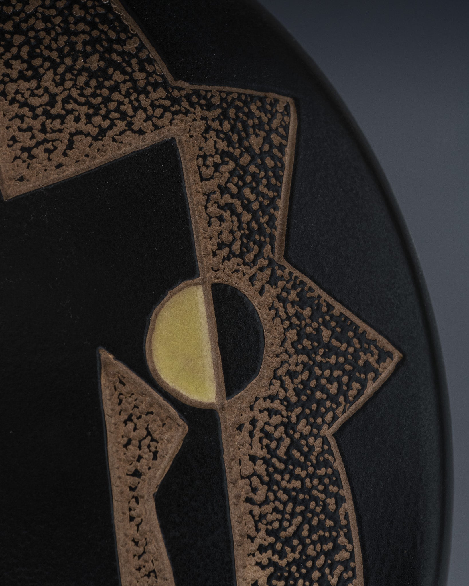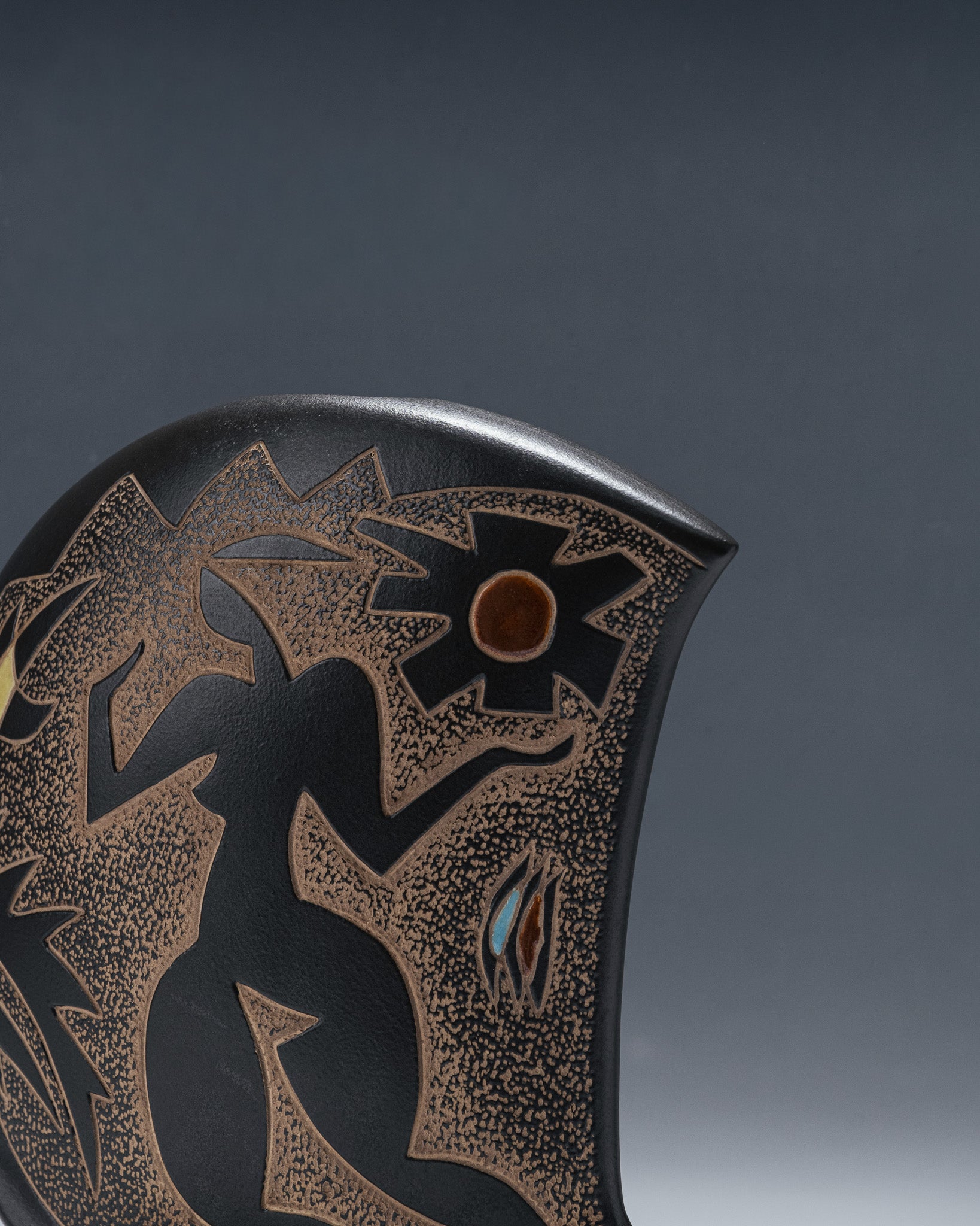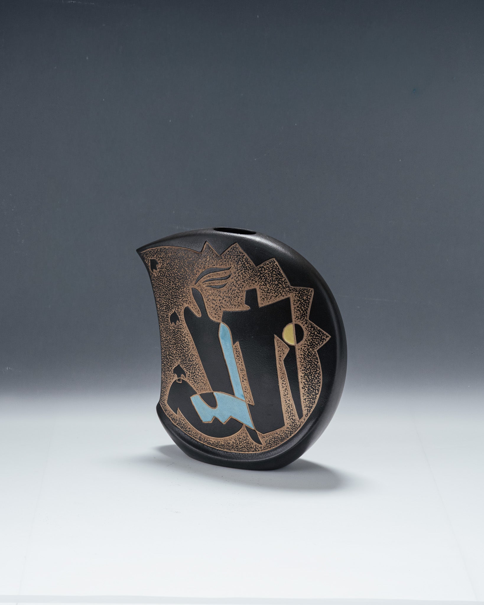 A matte black terracotta vase with a flattened body. Both sides are decorated with engraved motifs against a mottled beige background. One side features a female figure surrounded by floral motifs. The other side depicts male figures. A piece in the style of the 1990s, signed on the base. In very good overall condition.