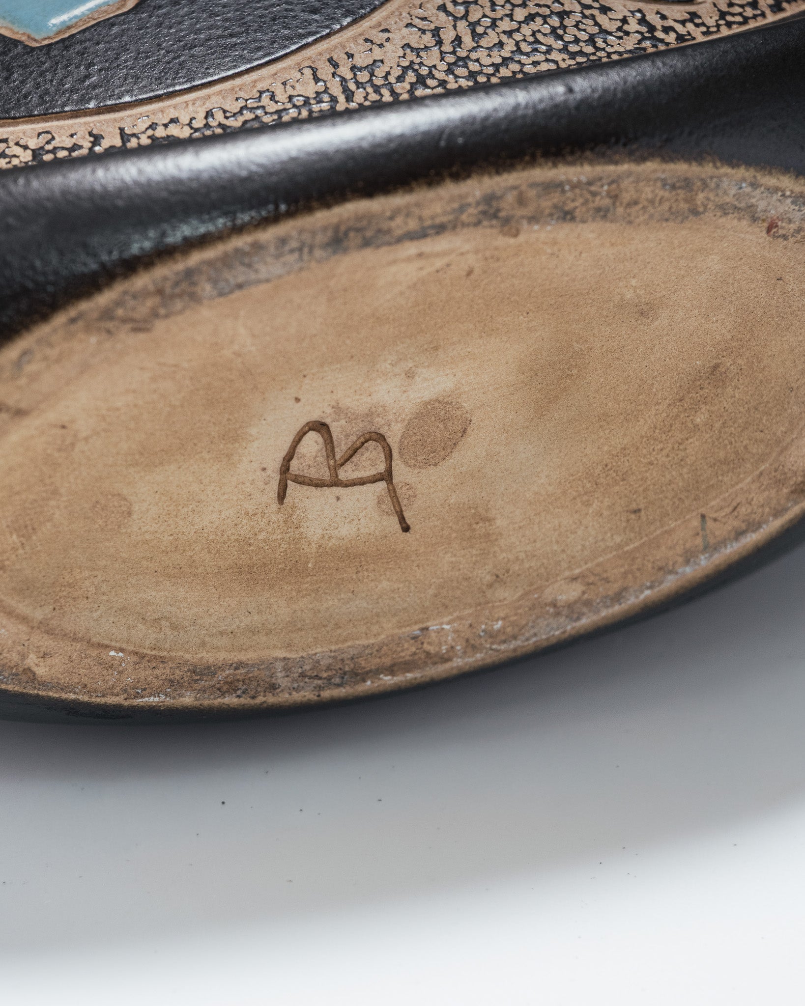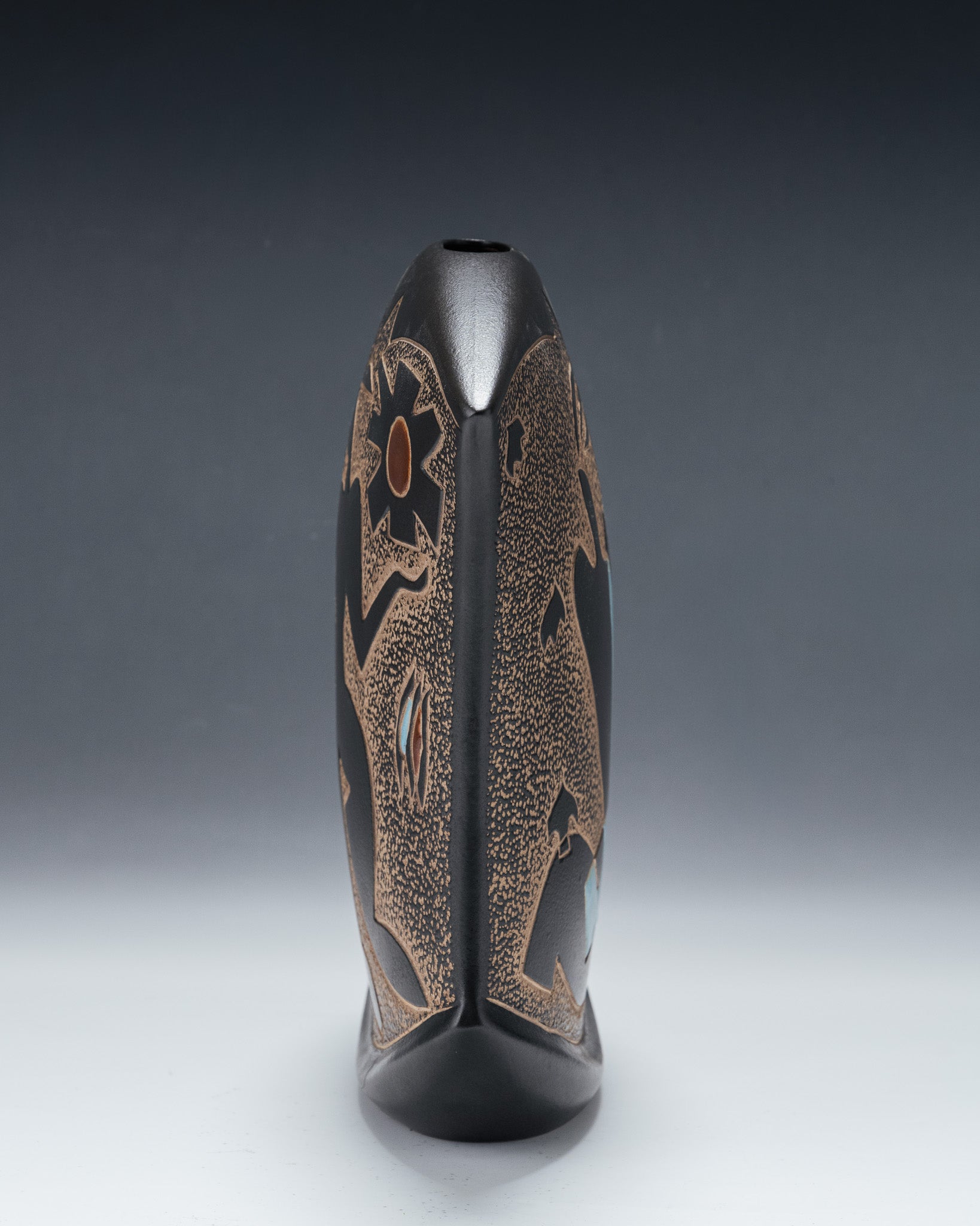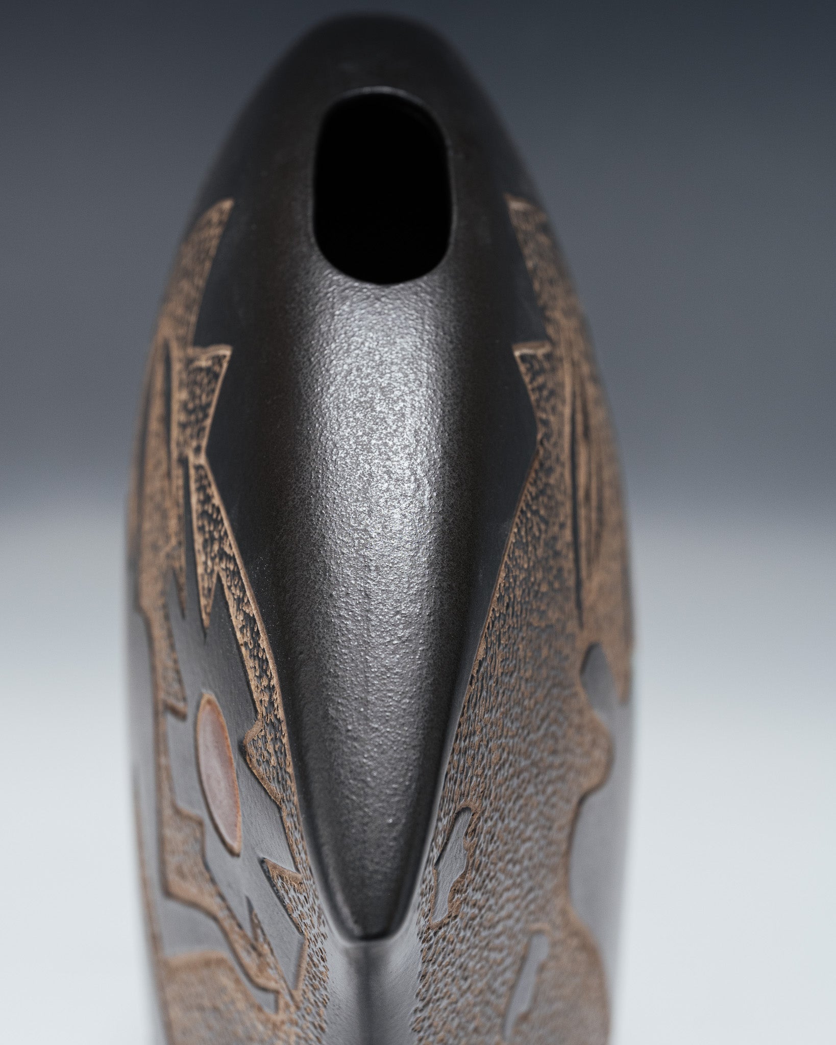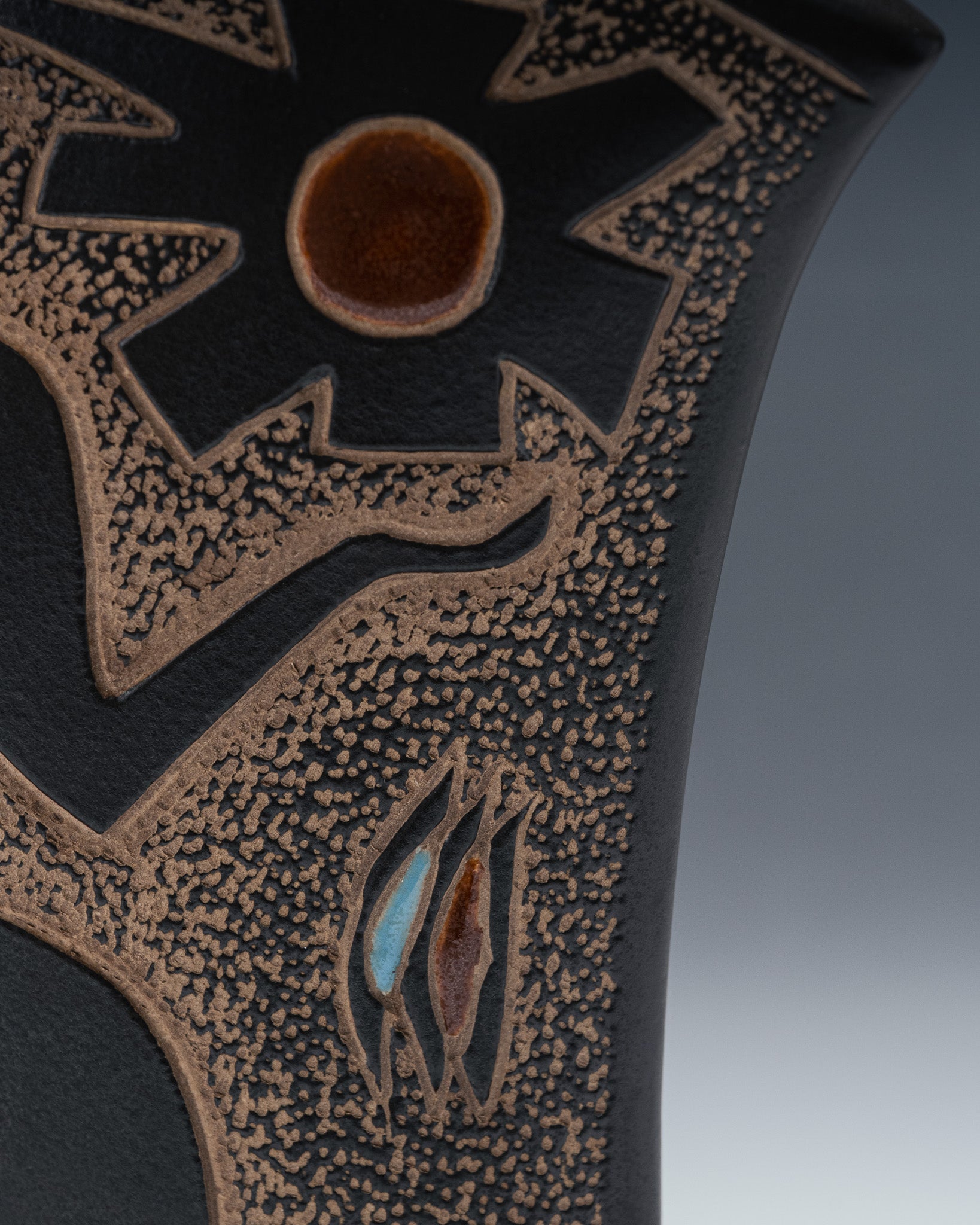 A matte black terracotta vase with a flattened body. Both sides are decorated with engraved motifs against a mottled beige background. One side features a female figure surrounded by floral motifs. The other side depicts male figures. A piece in the style of the 1990s, signed on the base. In very good overall condition.