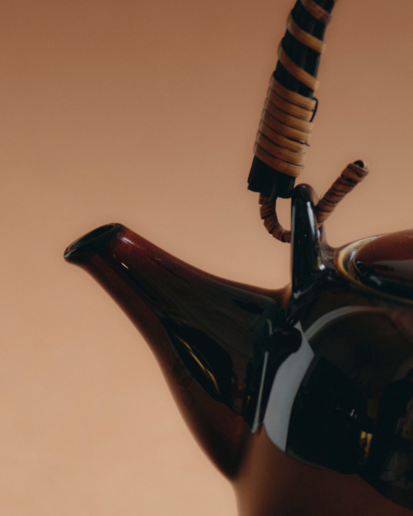 Japanese teapot in deep brown glazed ceramic, with a two-tone woven rattan handle. Simple and harmonious design, typical of late 20th-century Japanese production. Excellent condition.