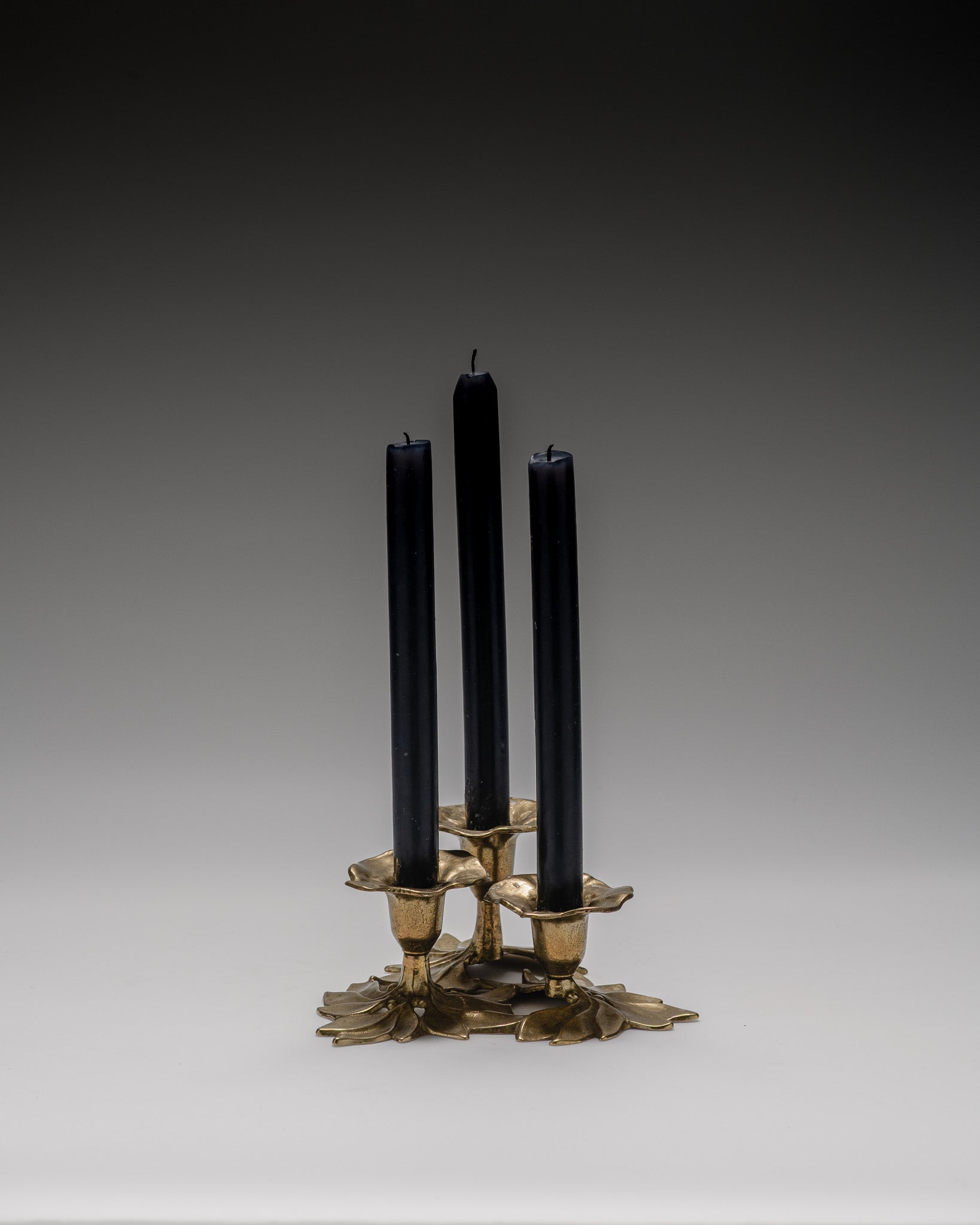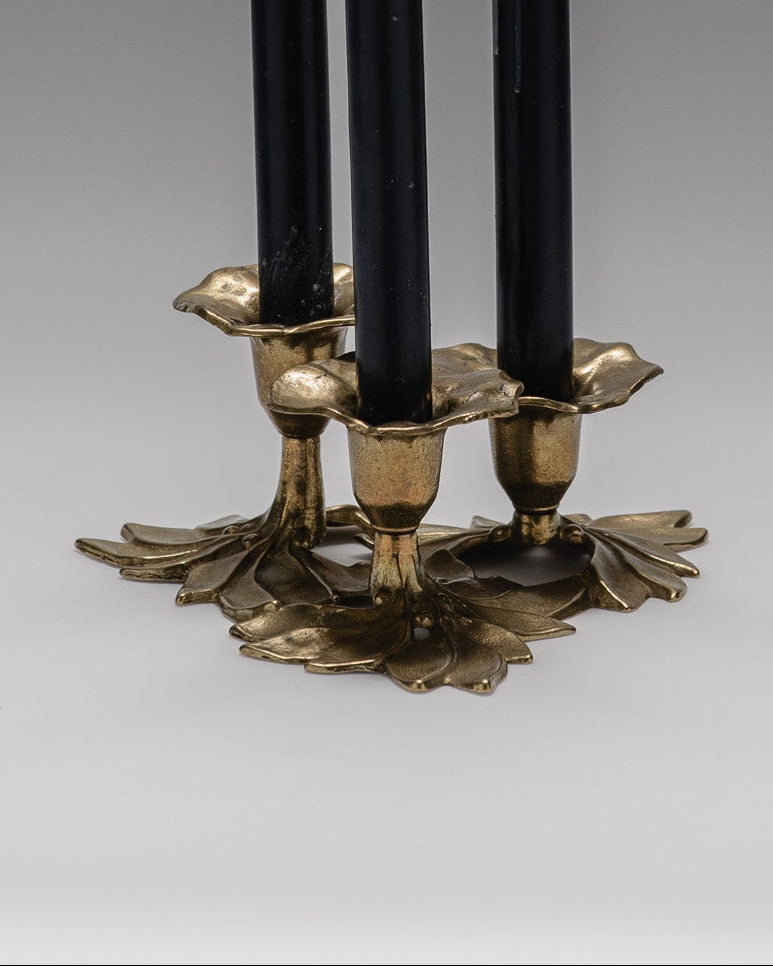 Gilt brass candlestick with stylized floral decoration. The design features three flowers holding candles at different heights, surrounded by veined leaves. Made of cast brass with its original matte gilding. A 1970s piece.