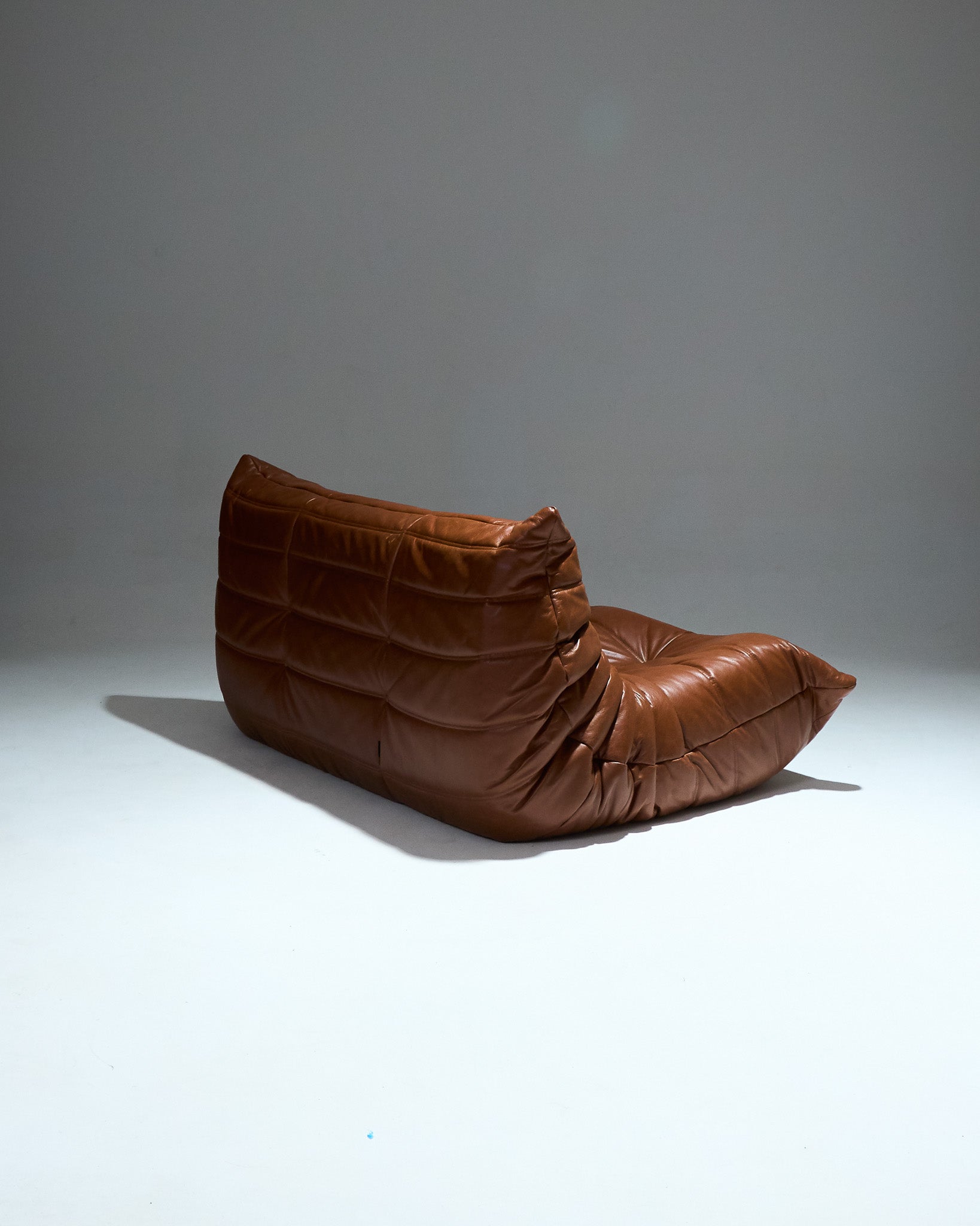TOGO two-seater sofa by designer Michel Ducaroy (1925-2009) for Ligne Roset in the 1970s. A true design classic, this armchair, made entirely of foam, is covered in its original brown leather slipcover. Labeled piece.
