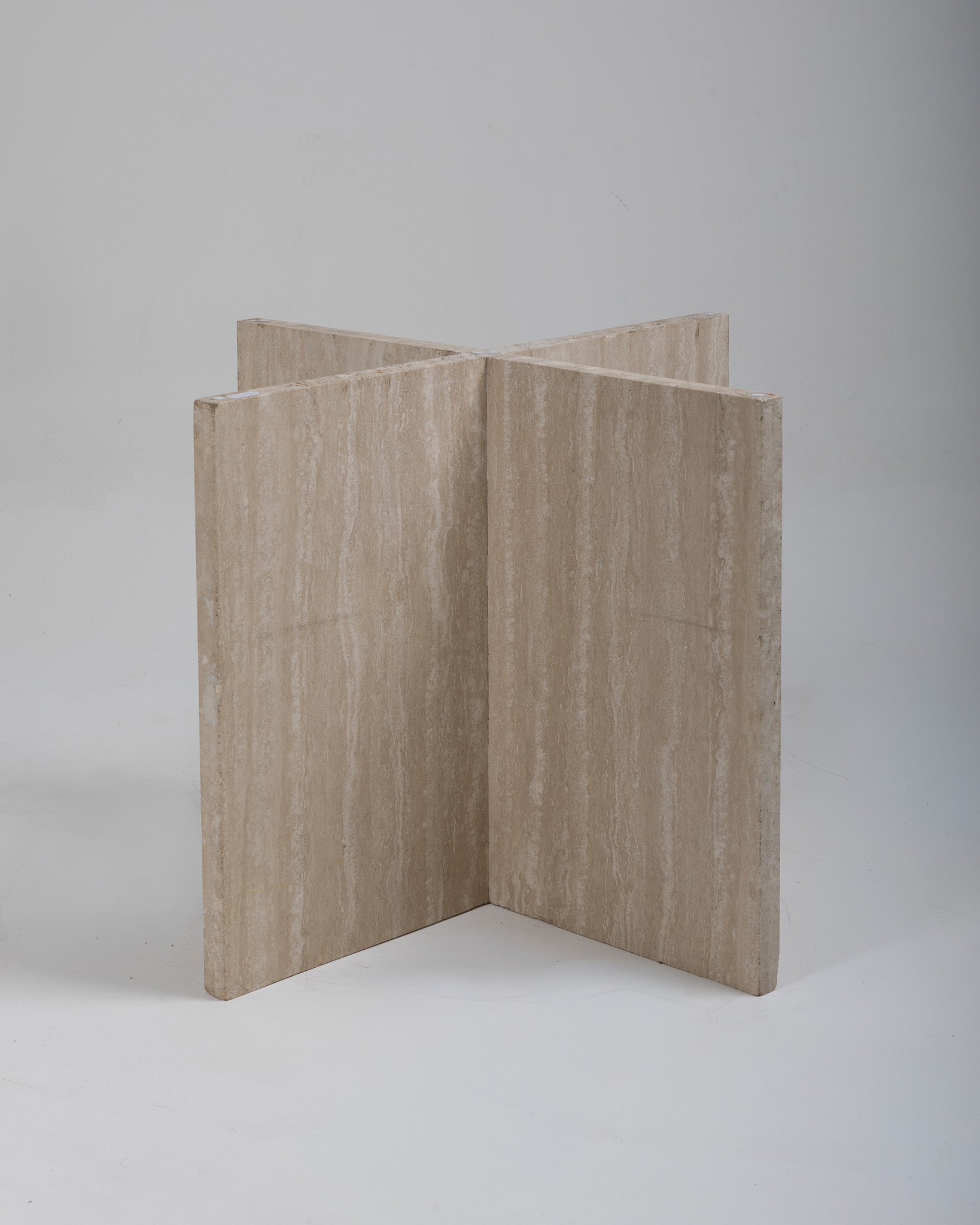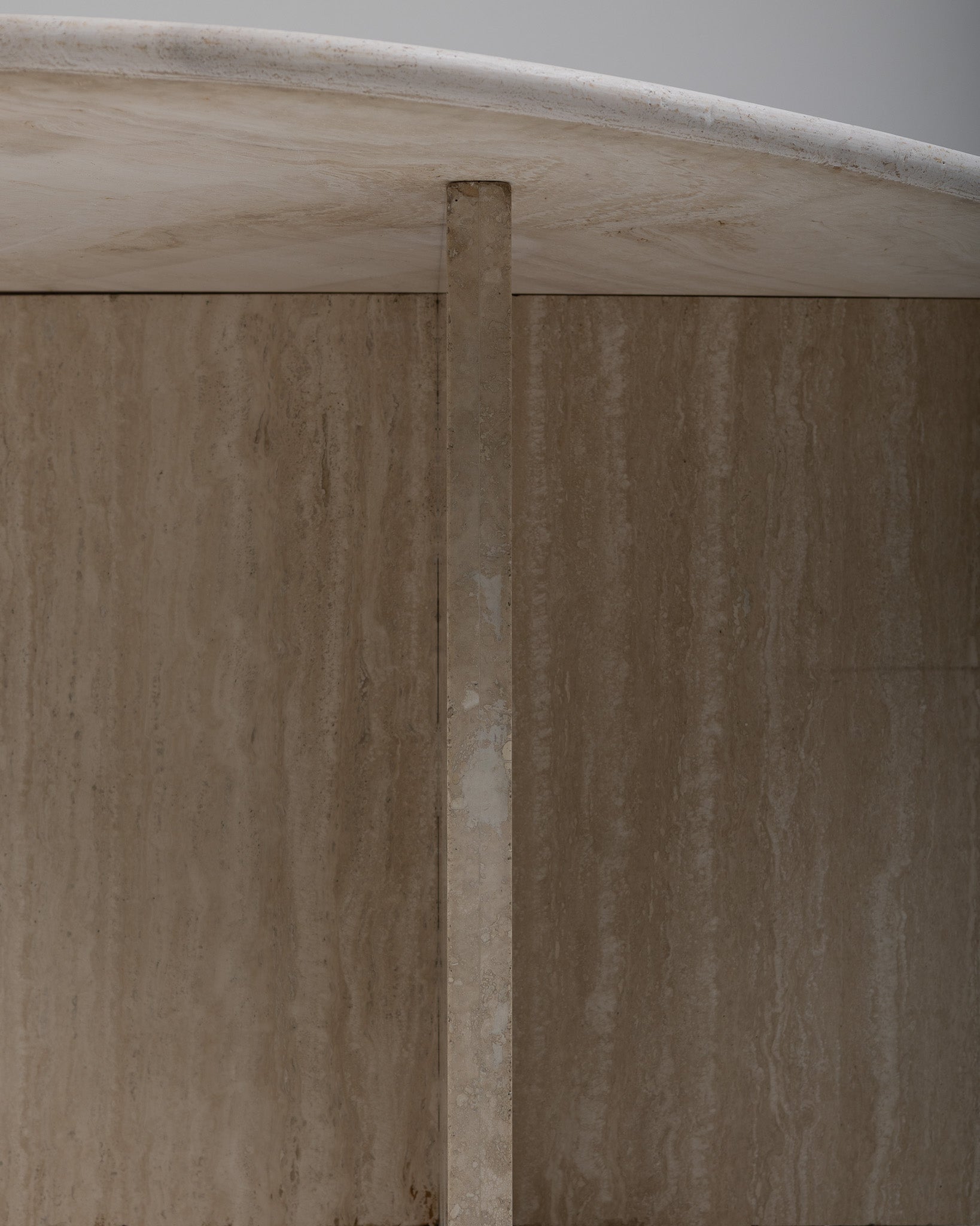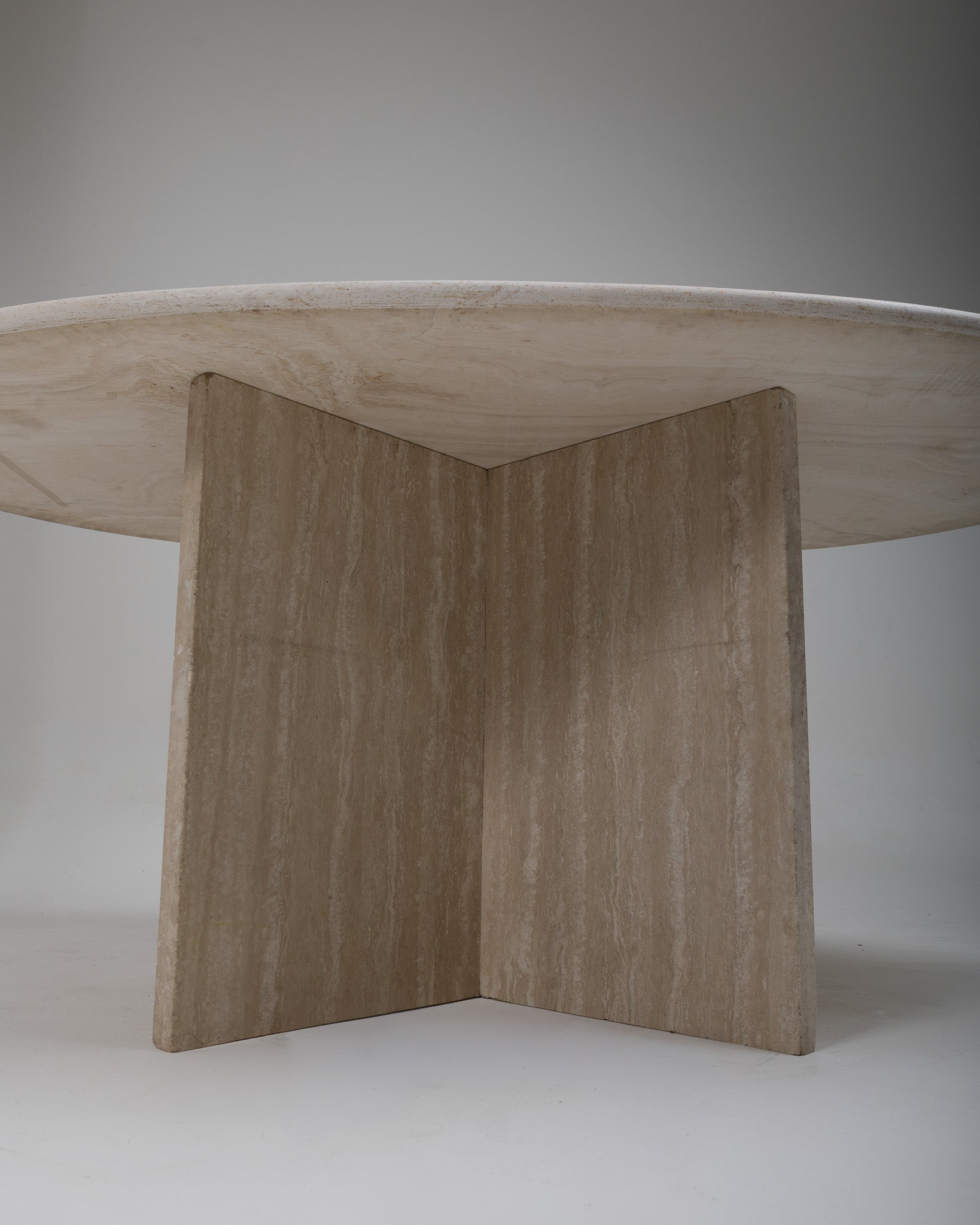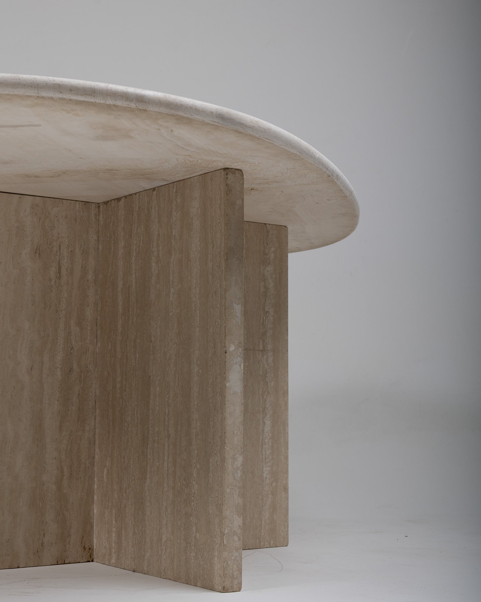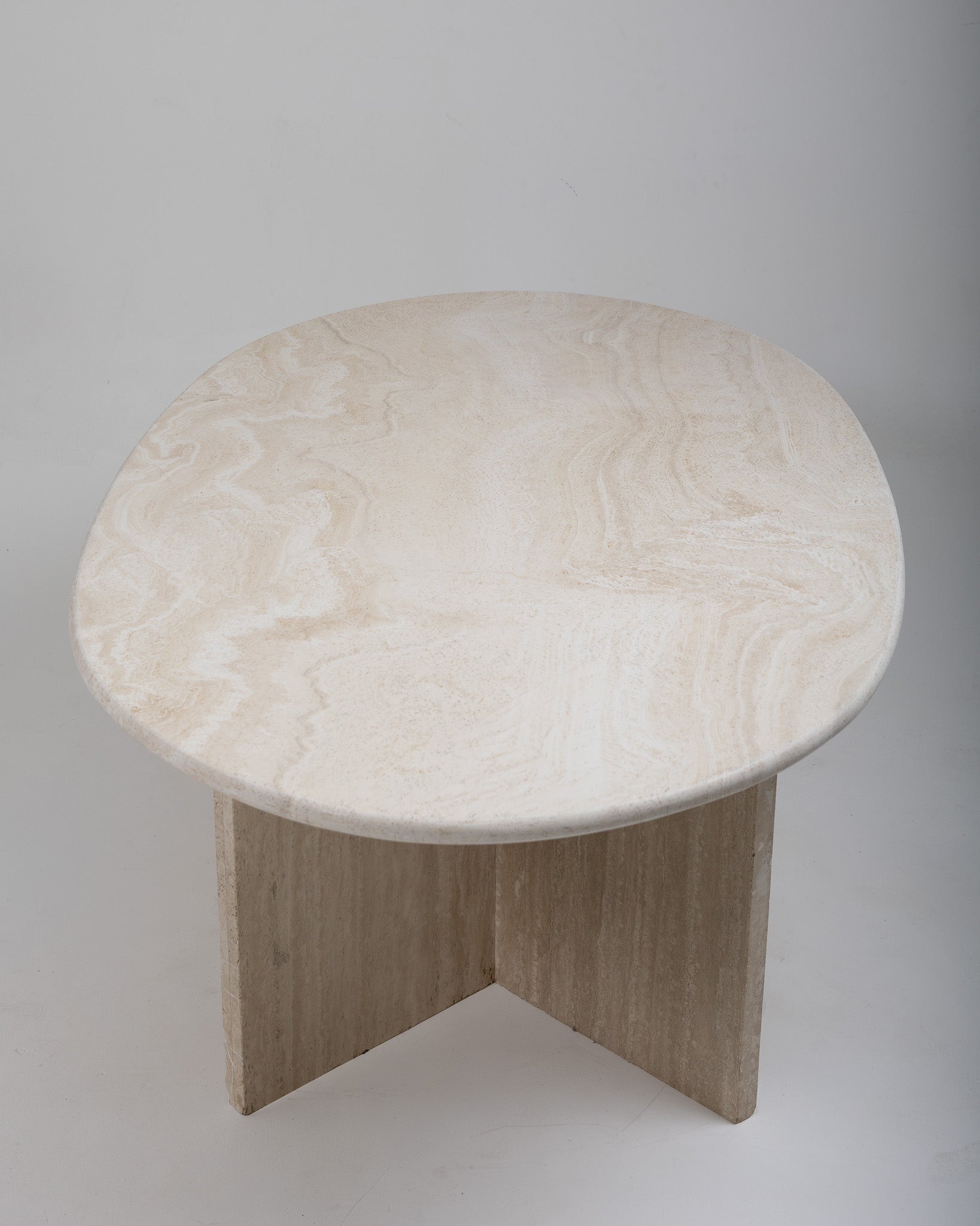 Large oval travertine dining table by Artelano France, from the 1980s. The top rests on a monolithic cross-shaped central base, also made of travertine. The set can be separated from the base for easier transport.