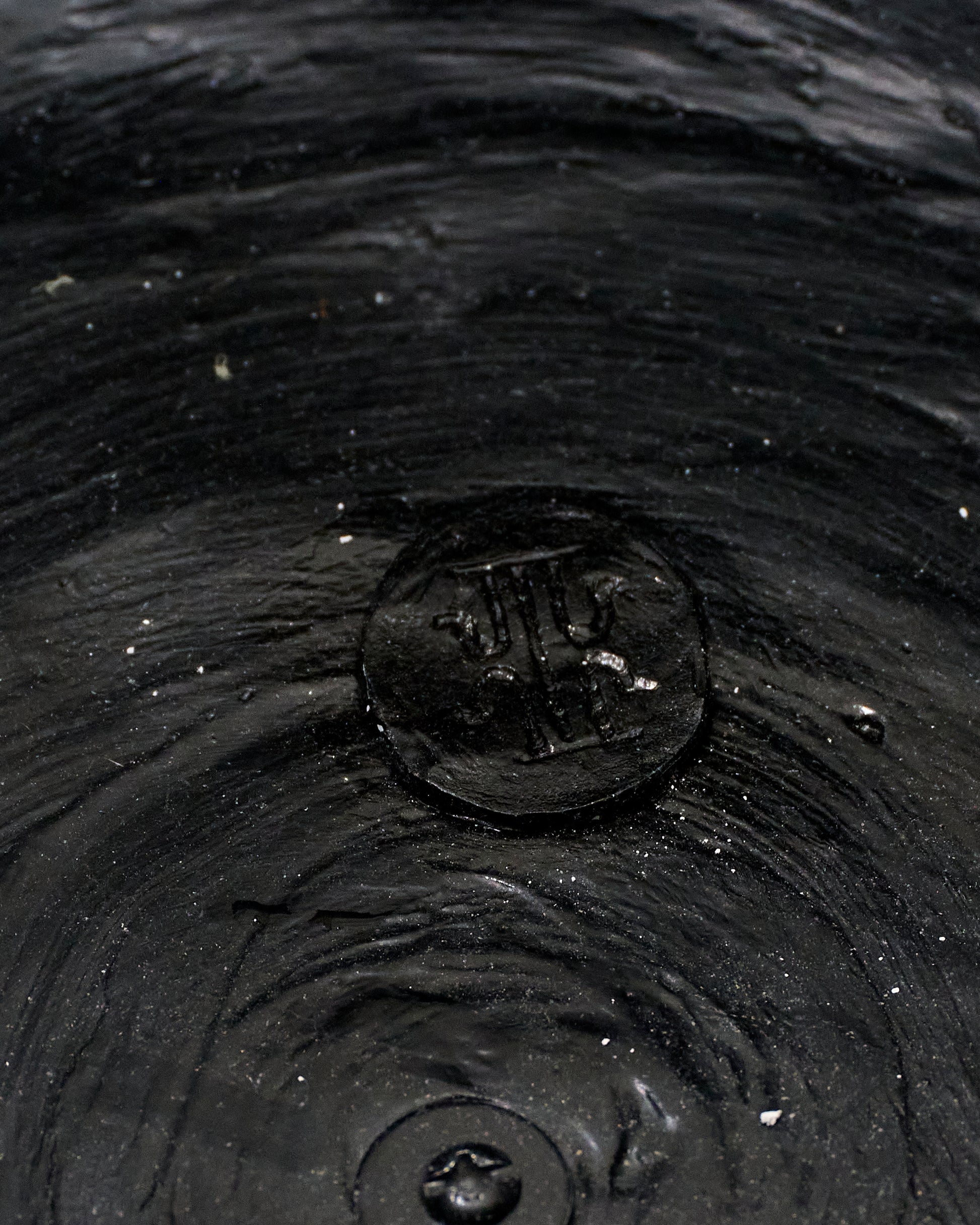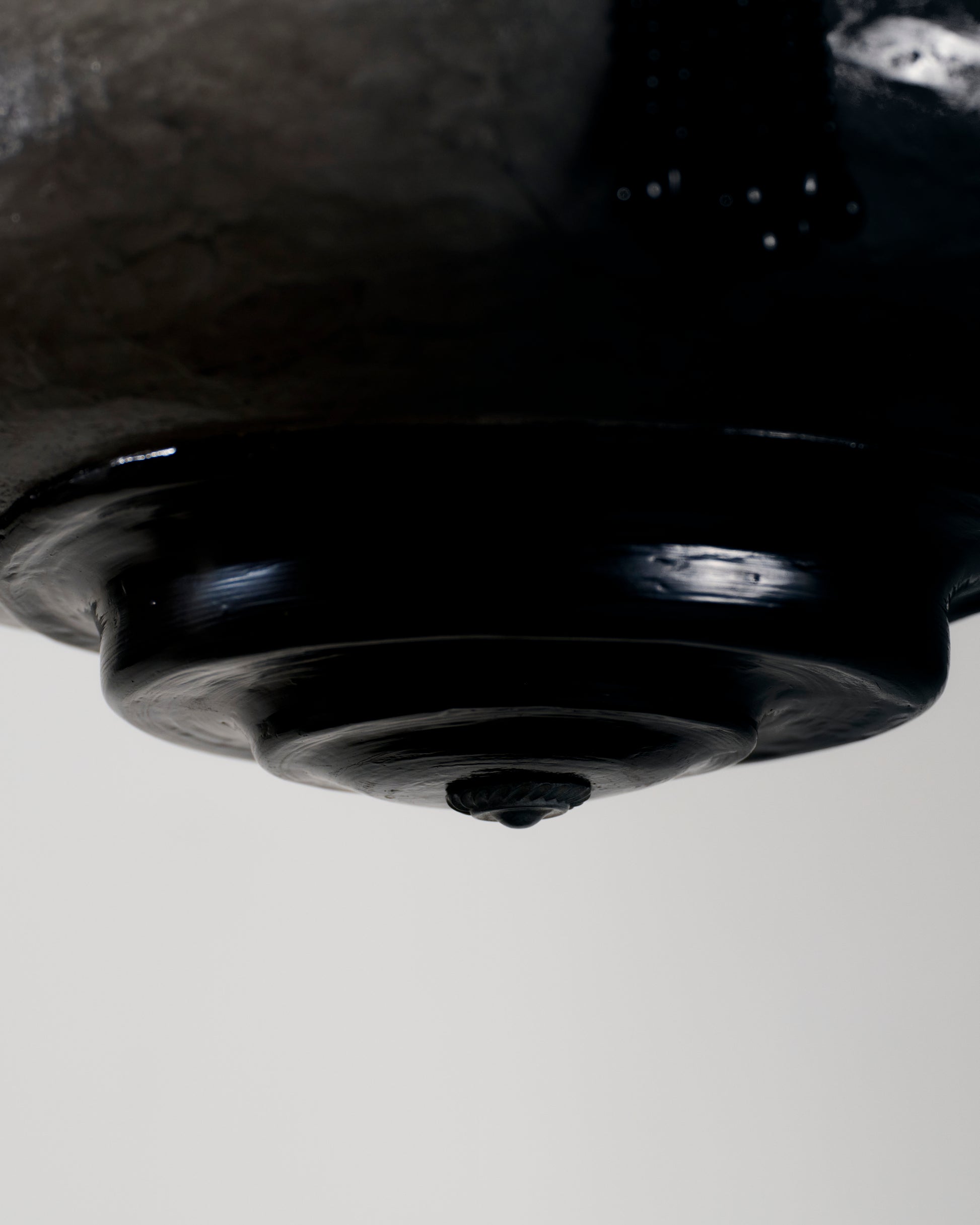 Bowl-shaped suspension made of concrete and bitumen, hanging from three metal chains. Artist’s signature visible inside the bowl.