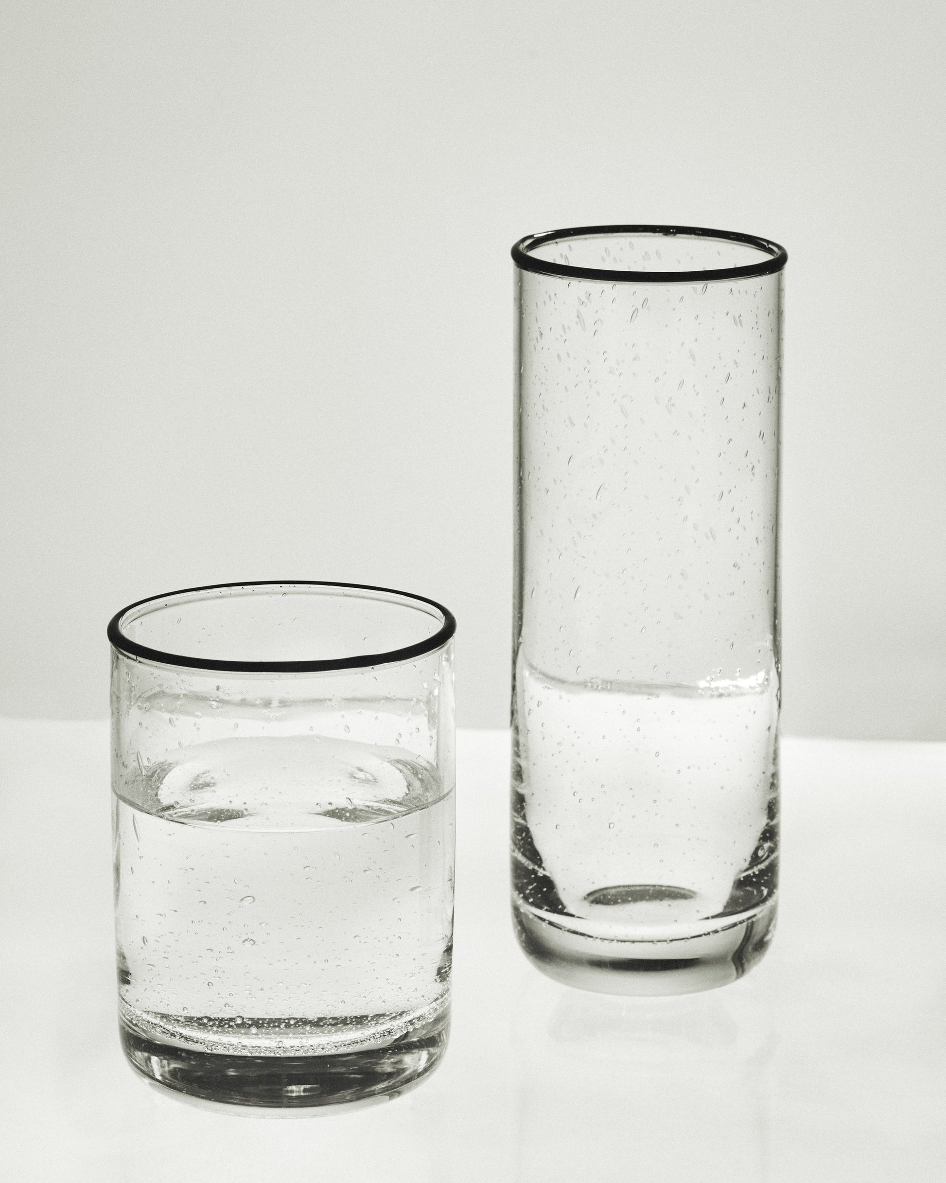 Characterized by a black rim that is both understated and assertive, the SR Drinking Glass Low is an evolution of the original Bubble Glass collection. This set celebrates the craftsmanship of blown glass, which gives each piece a deliberately distinctive individual character.
