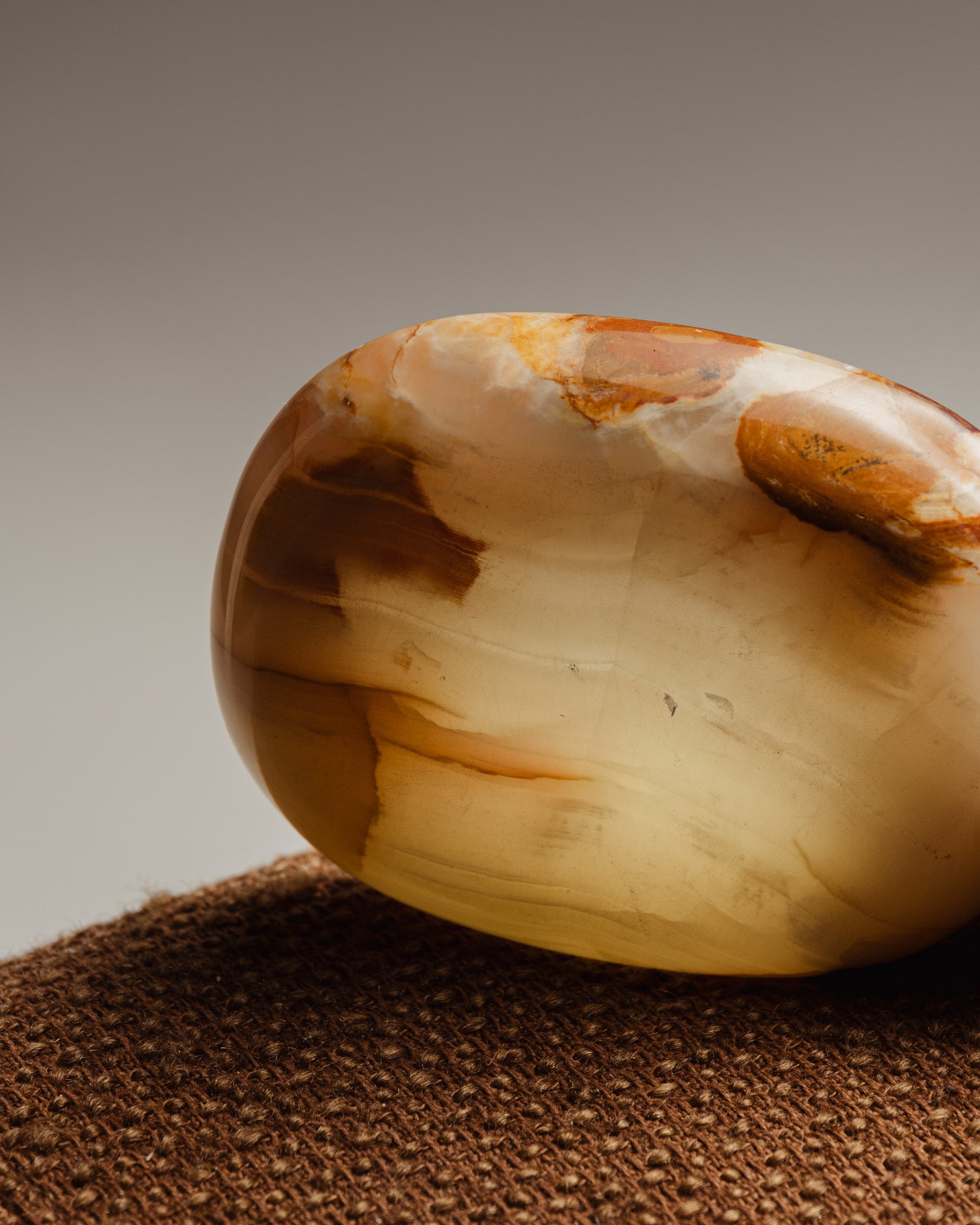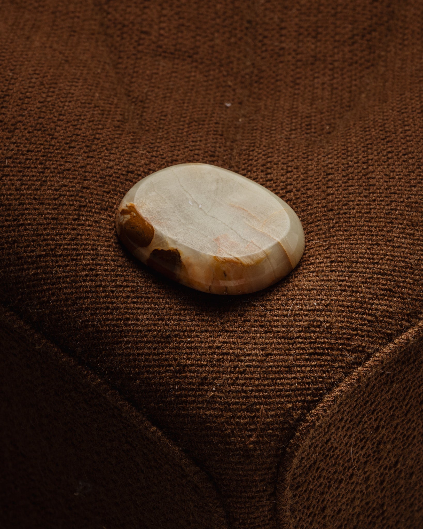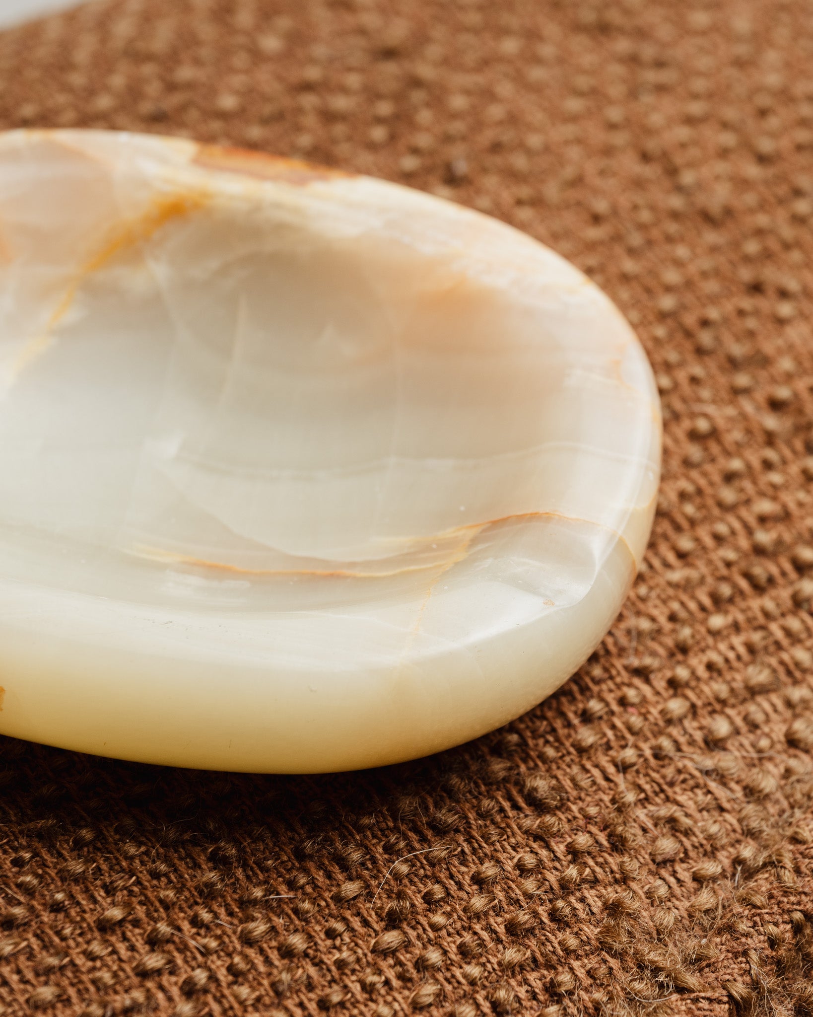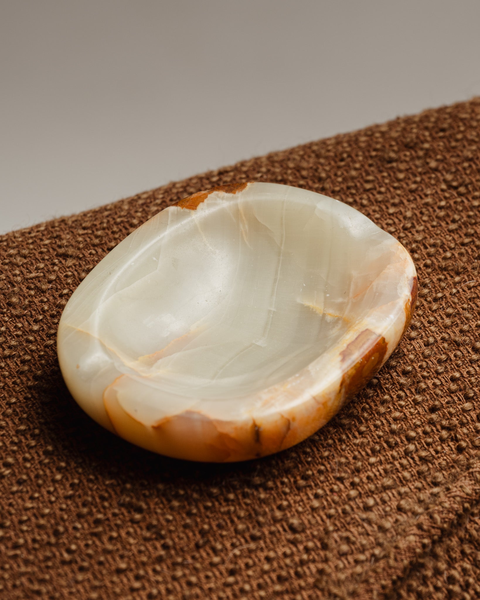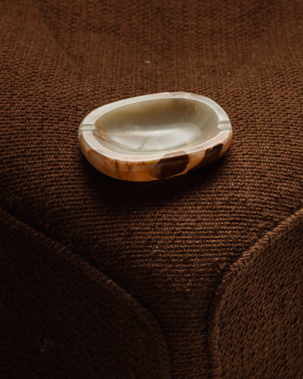 A trinket tray or ashtray made of antique onyx, with natural veining in shades of beige and green. From the 1960s. The polished stone highlights its mineral variations.
