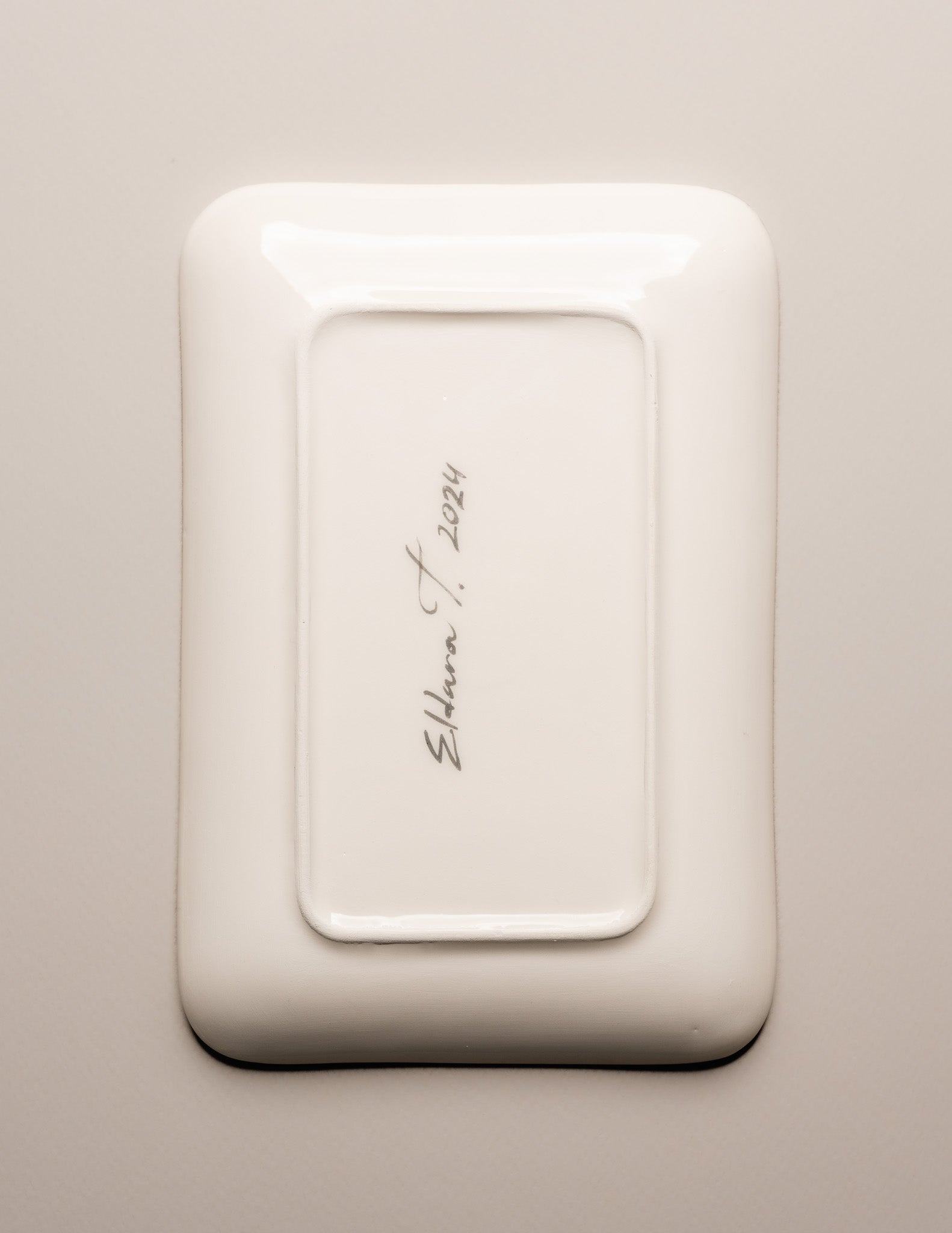 A unique, blue glazed ceramic workshop trinket tray, signed "Eldarov. T 2024" on the reverse. Its rectangular shape with curved edges and the delicate glaze attest to contemporary craftsmanship. A versatile decorative piece, ideal for holding everyday items or as a sculptural element on a side table.