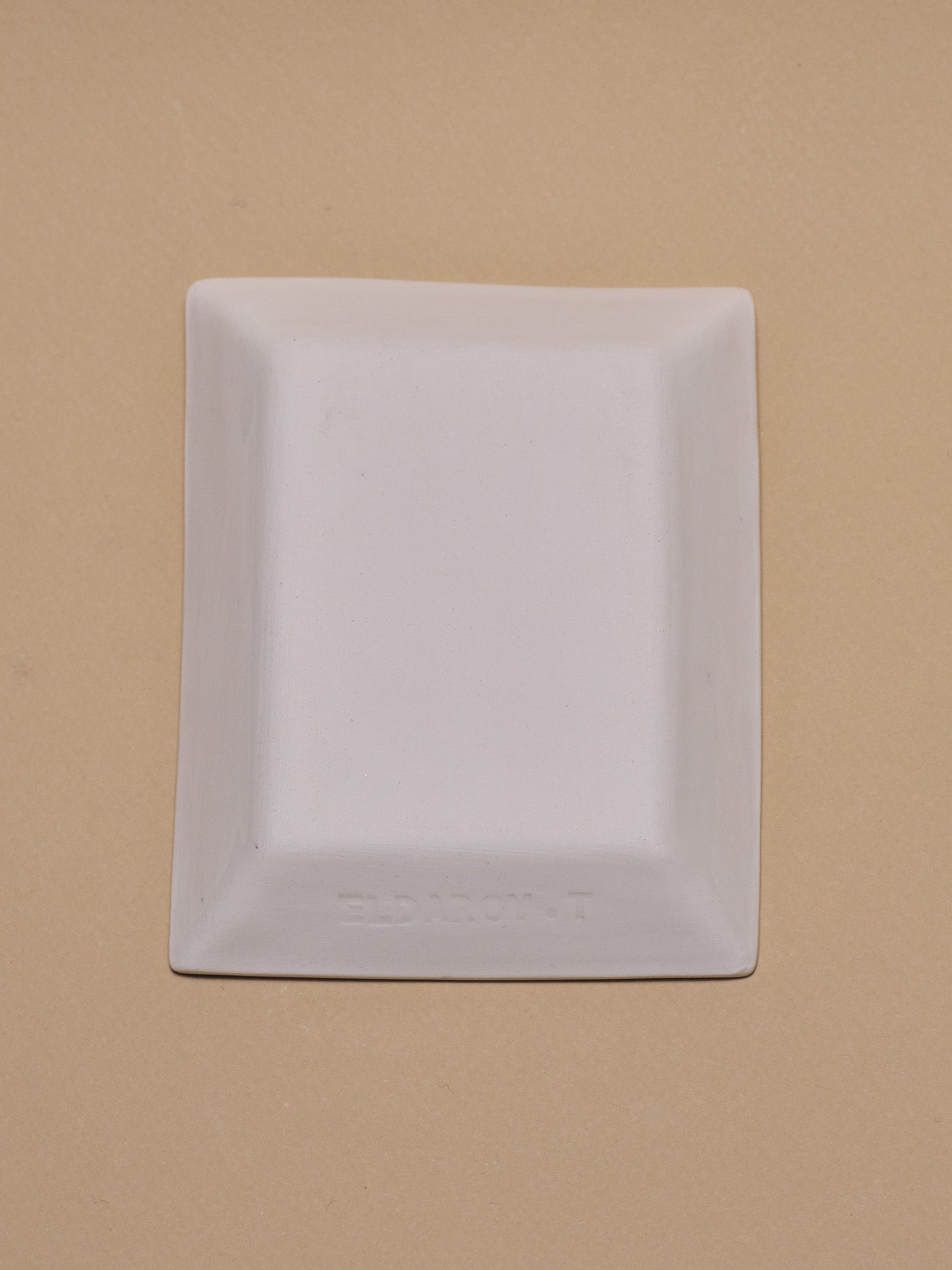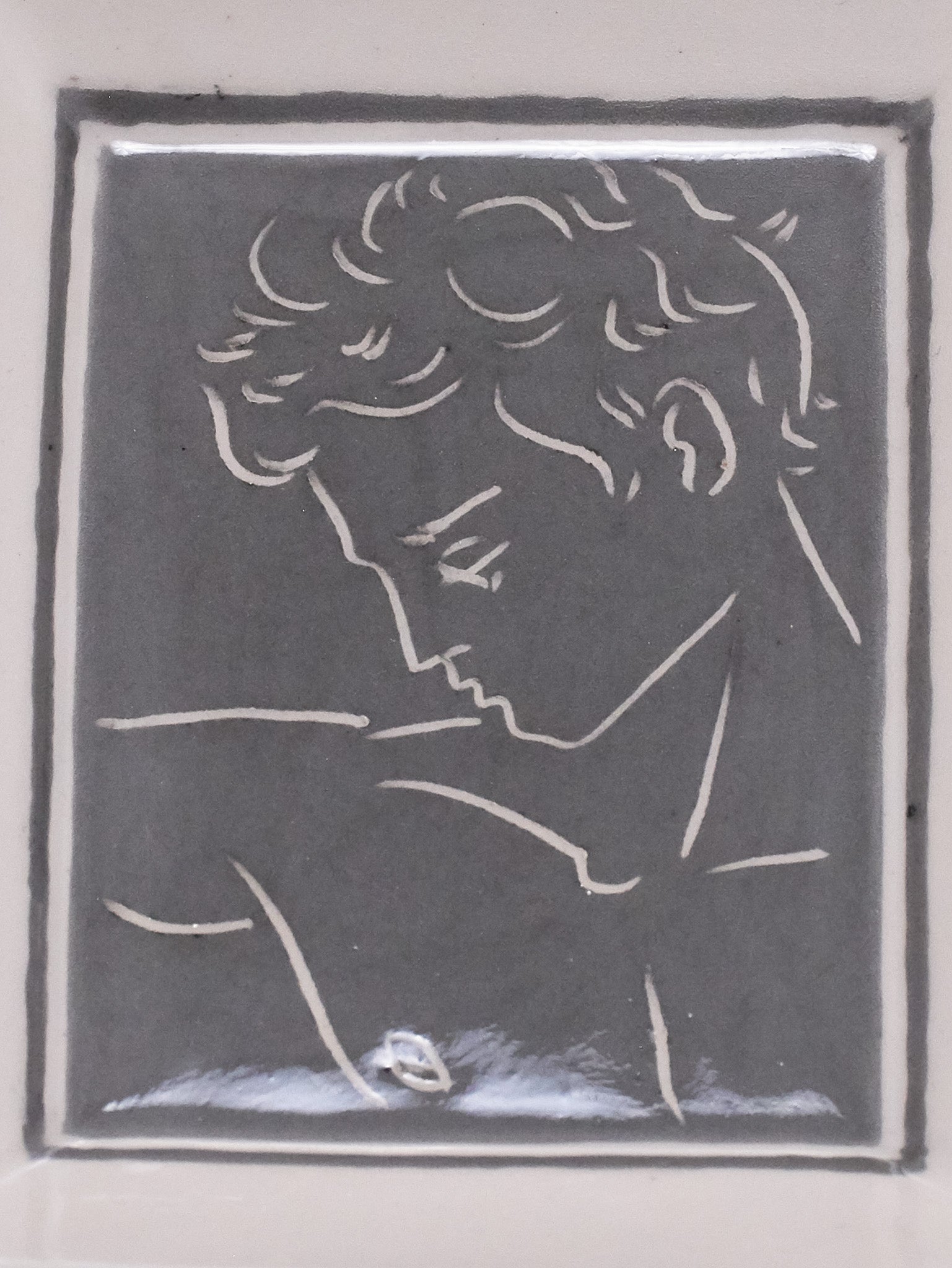 Petit vide-poche carré en céramique émaillée blanche à décor gravé d'un visage masculin inscrit dans un cadre rectangulaire. Pièce unique signée « Eldarov. T » au revers. Travail artisanal européen. Parfait état.