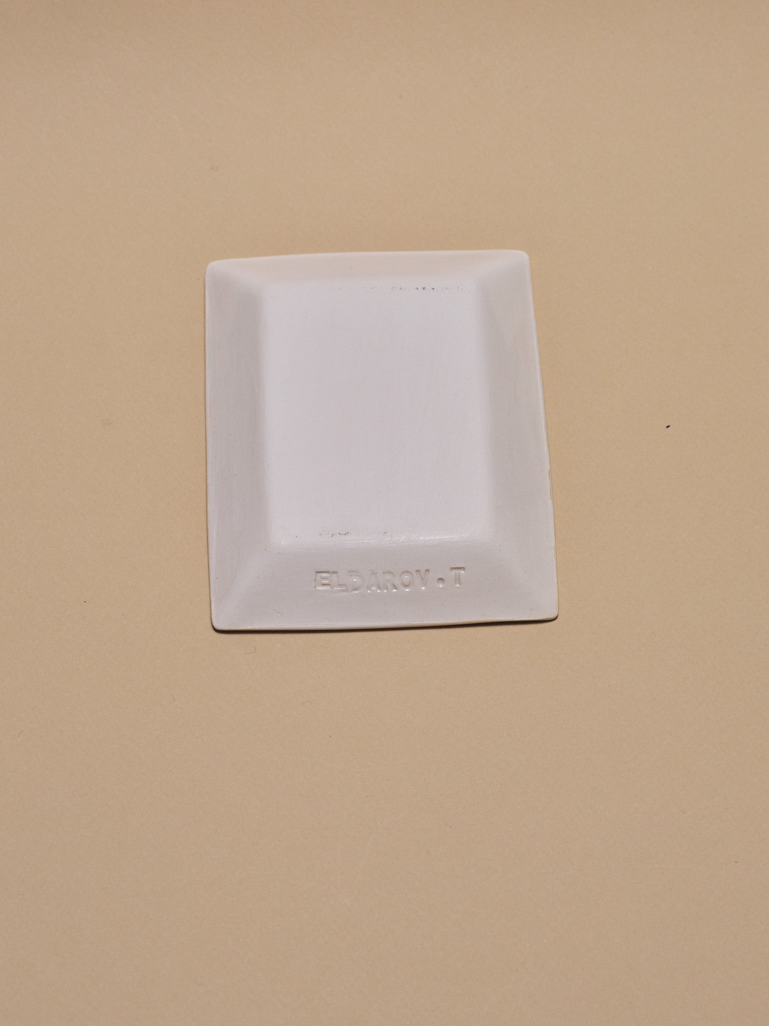 Petit vide-poche carré en céramique émaillée blanche à décor gravé d'un visage masculin inscrit dans un cadre rectangulaire noir. Pièce unique signée « Eldarov. T » au revers. Travail artisanal européen. Parfait état.