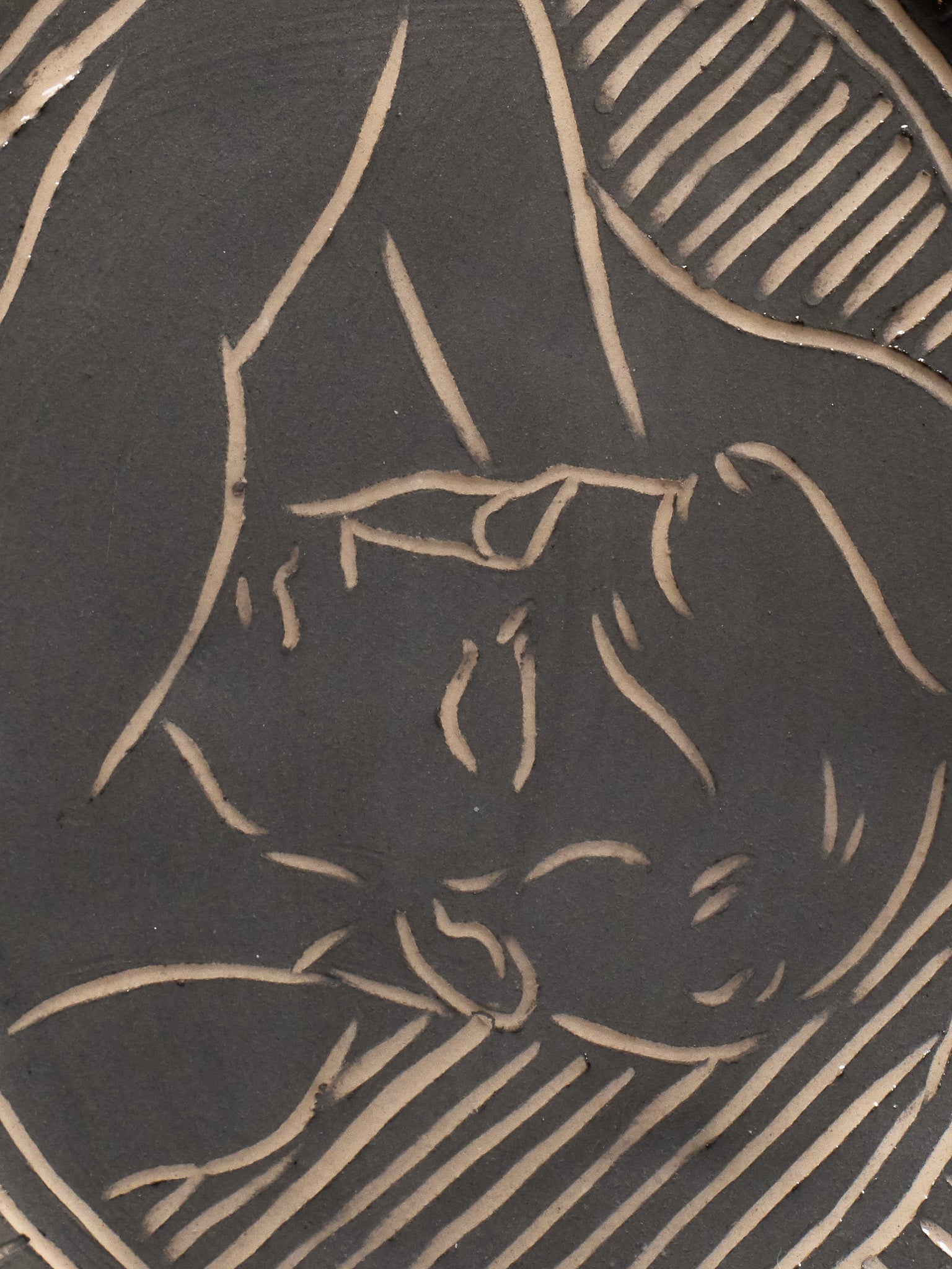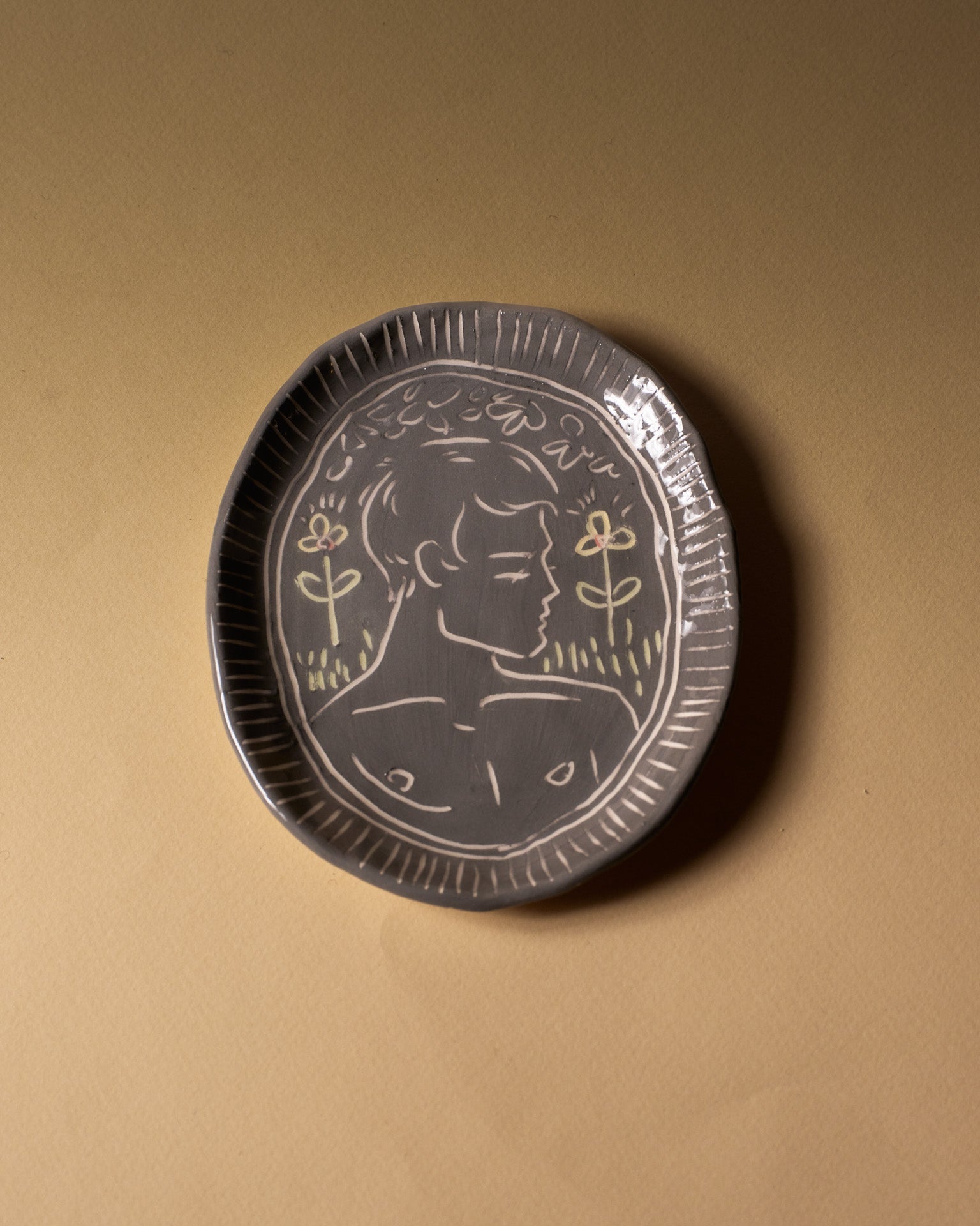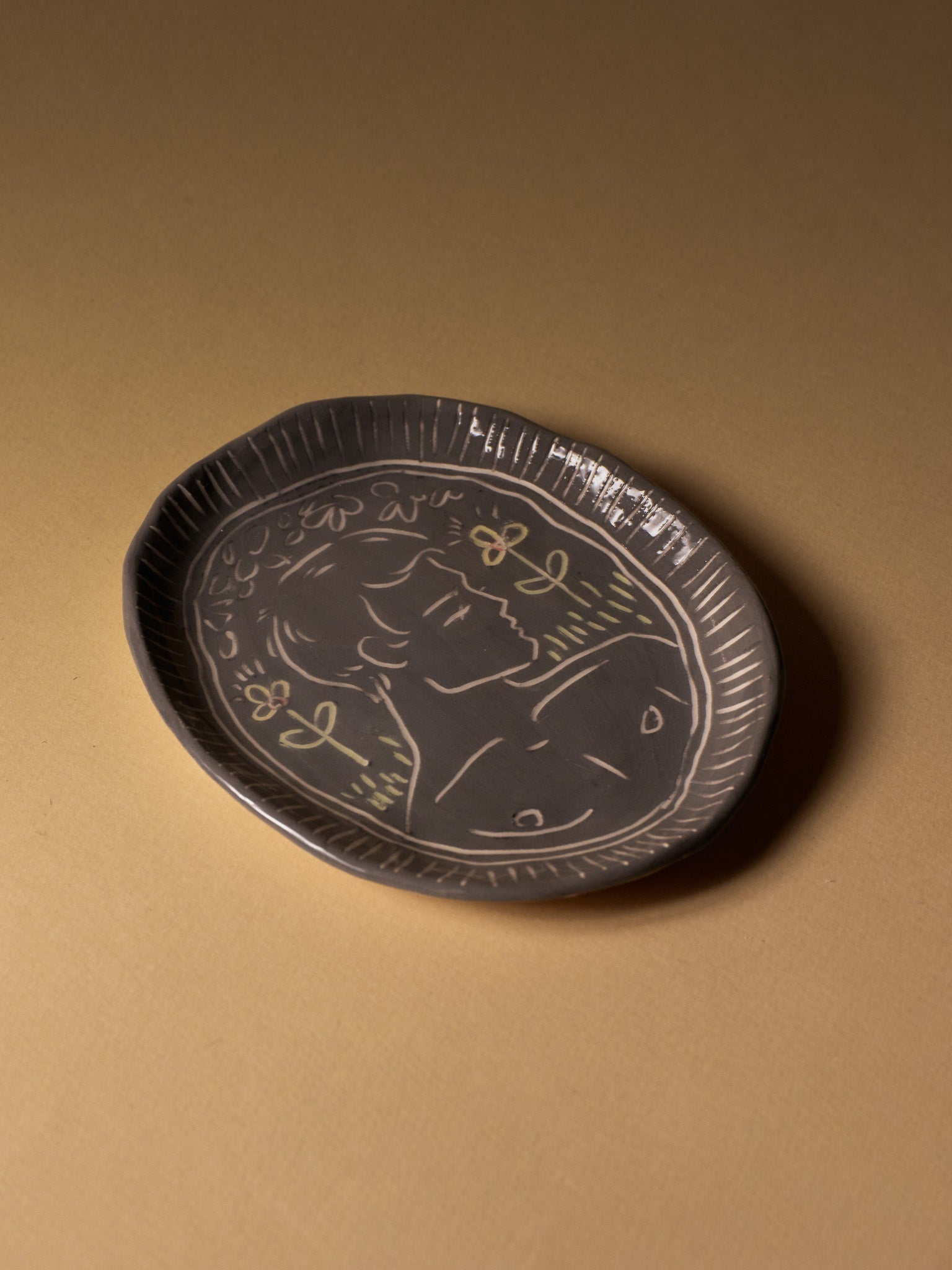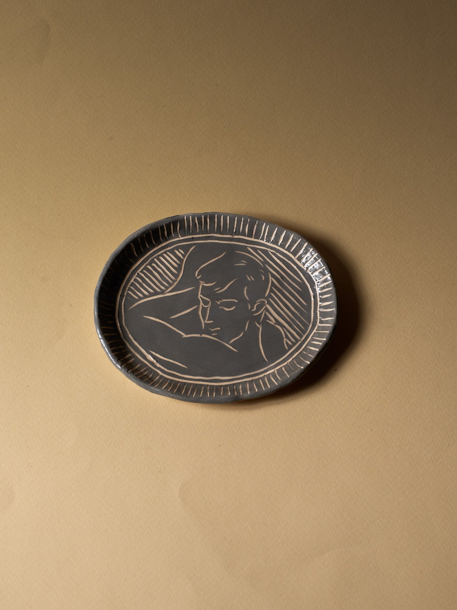 Oval trinket dish in blue glazed ceramic, decorated with an incised male profile surrounded by stylized floral motifs. Unique handcrafted piece signed "Eldarov. T" on the reverse. Perfect condition.