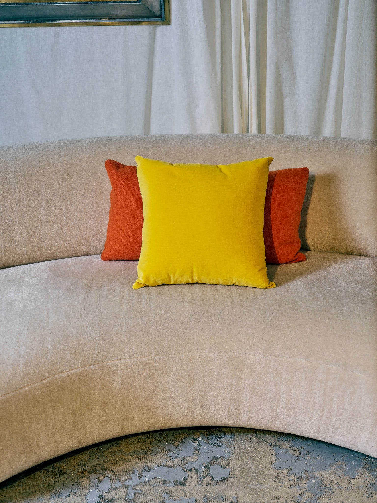 Yellow fabric cushion. Removable cover with zipper underneath. Sold with its cushion insert. Excellent condition.