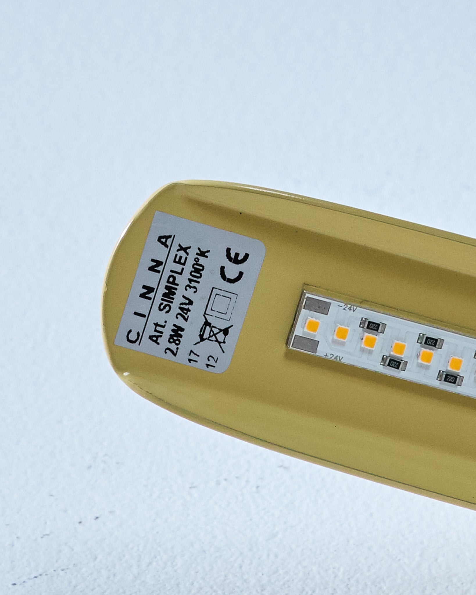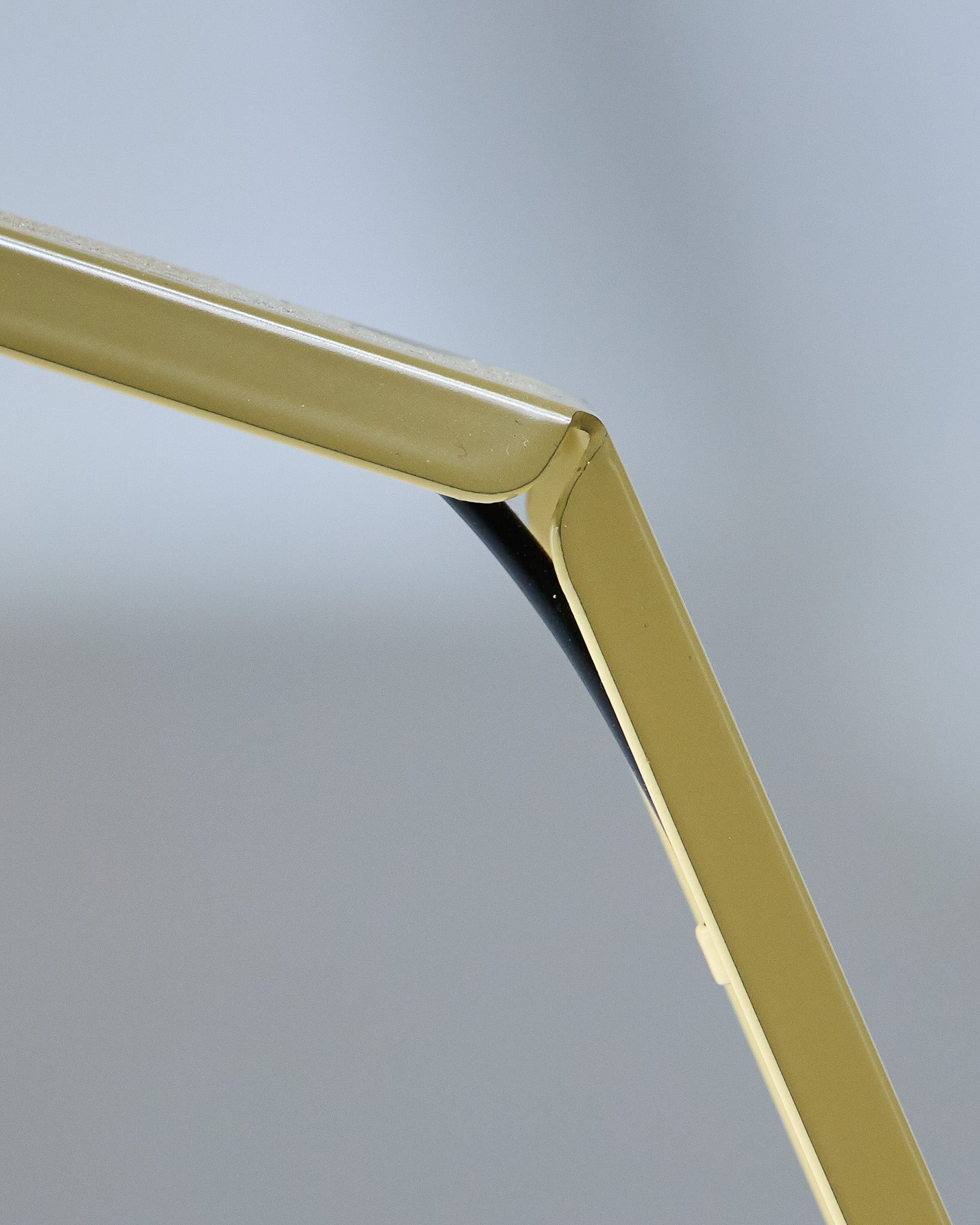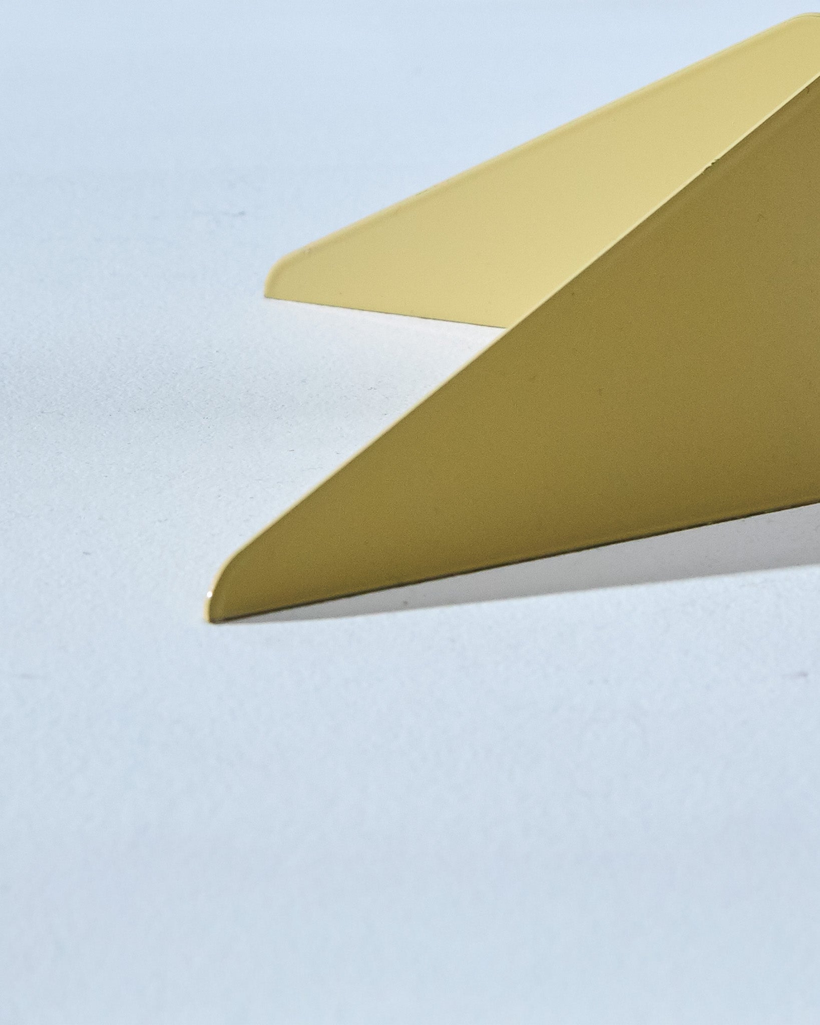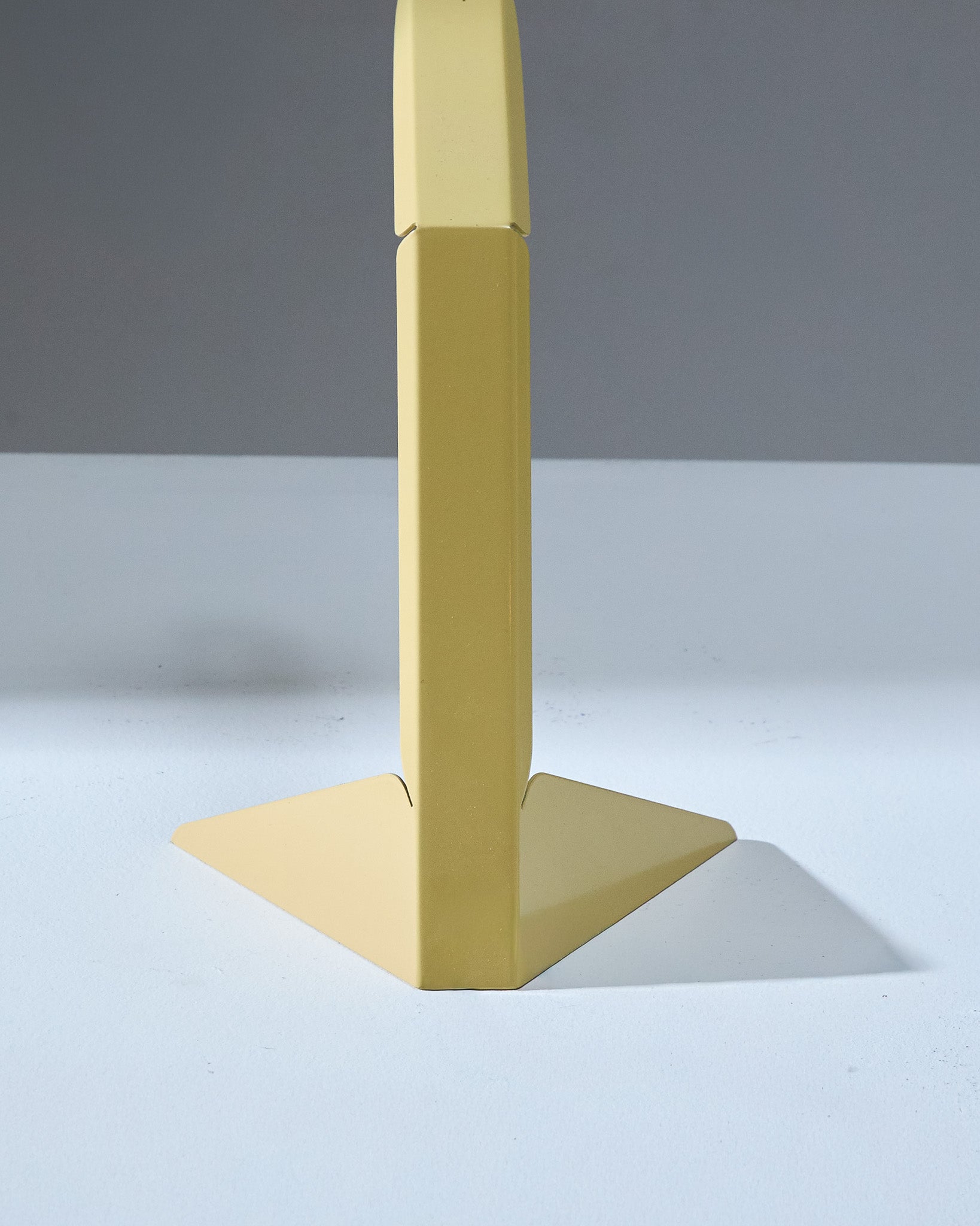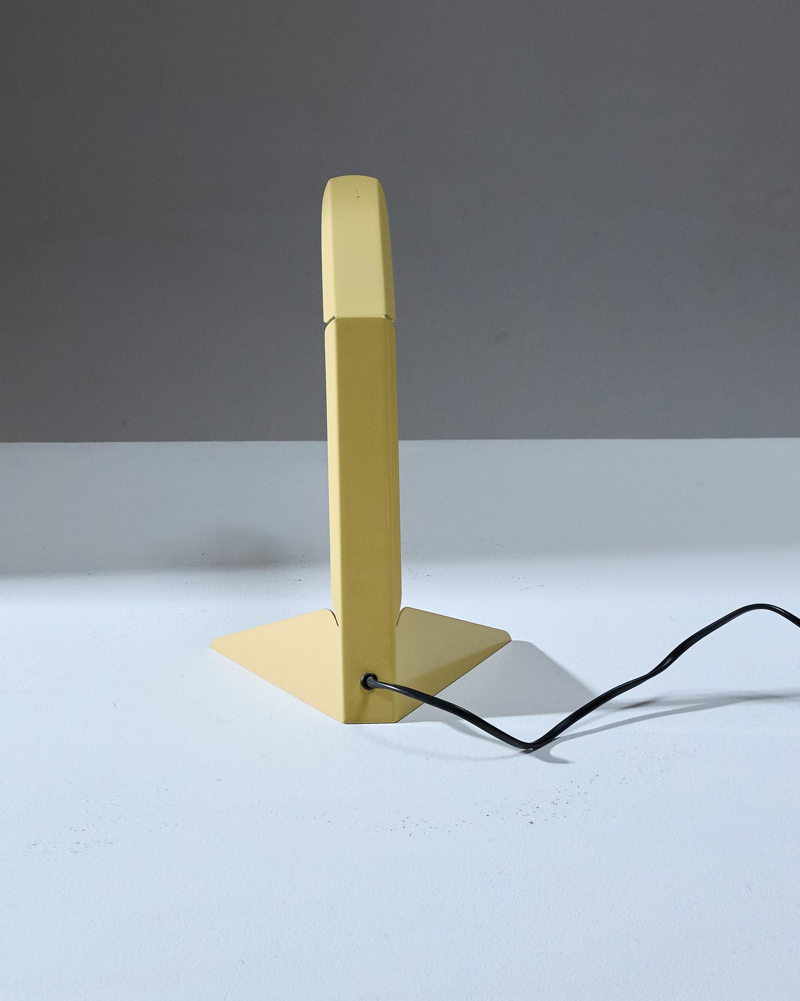 Table lamp in yellow painted metal. The structure is composed of two flat elements forming an angle, mounted on a triangular base. A black electrical cable is integrated into the structure and runs inside the lamp. A typical piece from the 1980s.