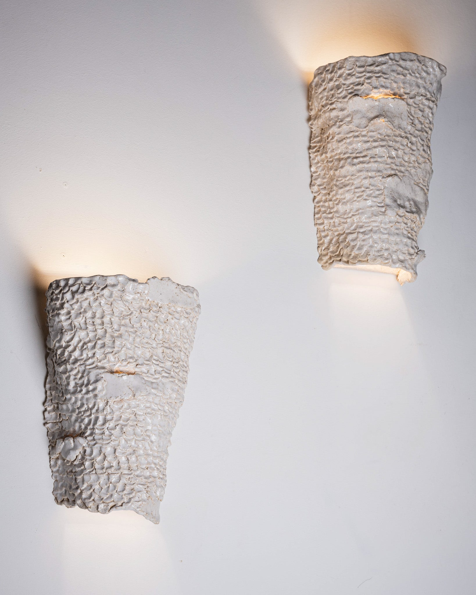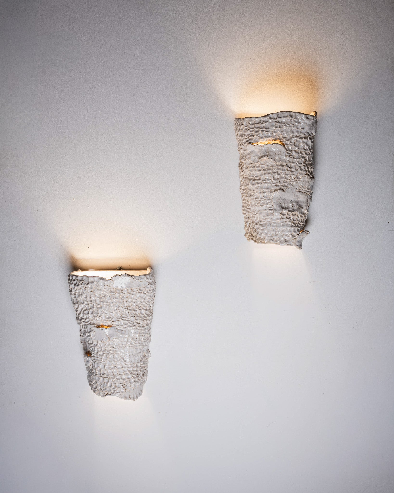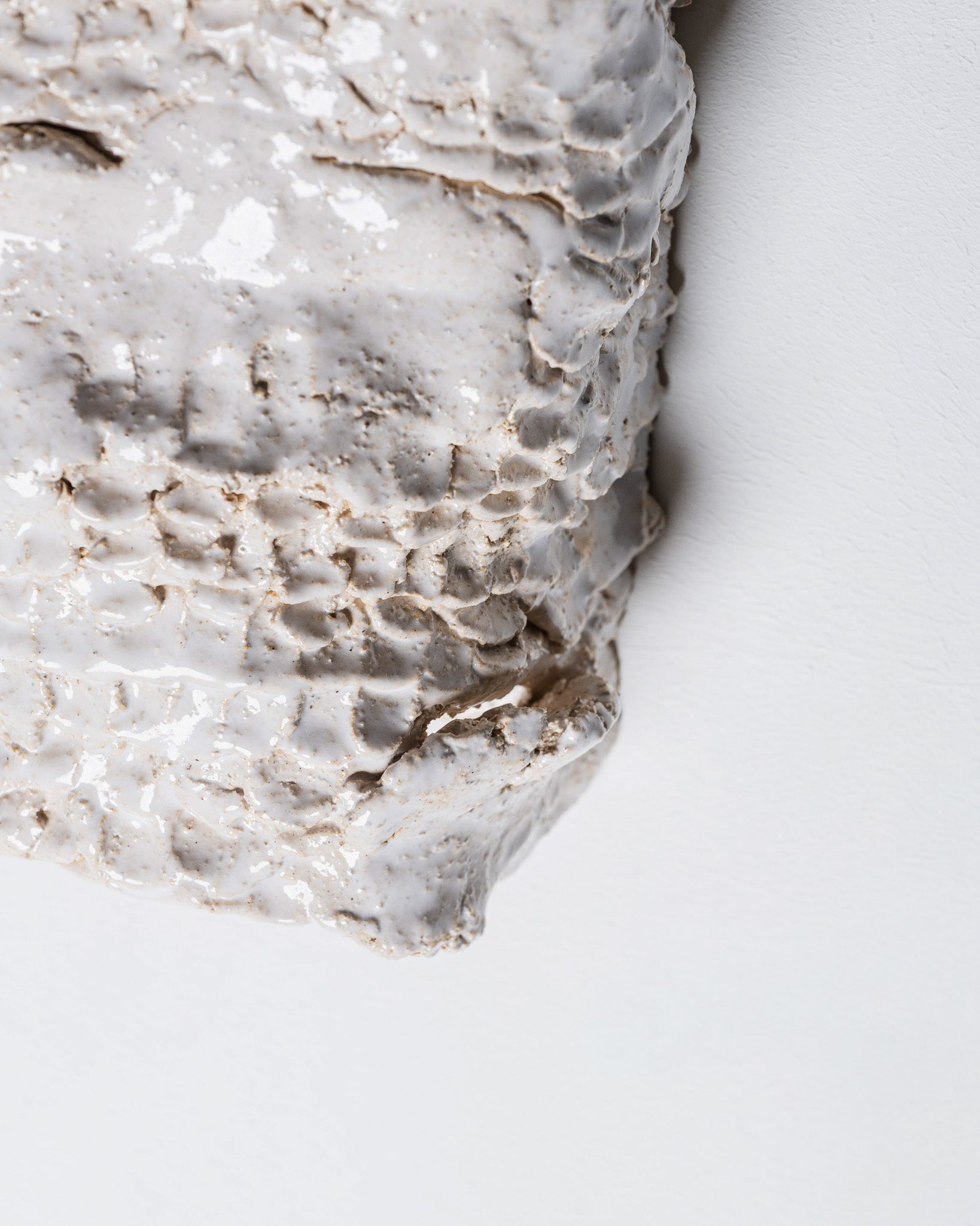 Applique murale CASA n° 1, conçue en 2023. Luminaire en céramique à la finition texturée, fabriqué dans l’atelier de céramique du Projet 213A. Chaque pièce est unique de par sa fabrication ; les formes et les nuances peuvent légèrement varier.