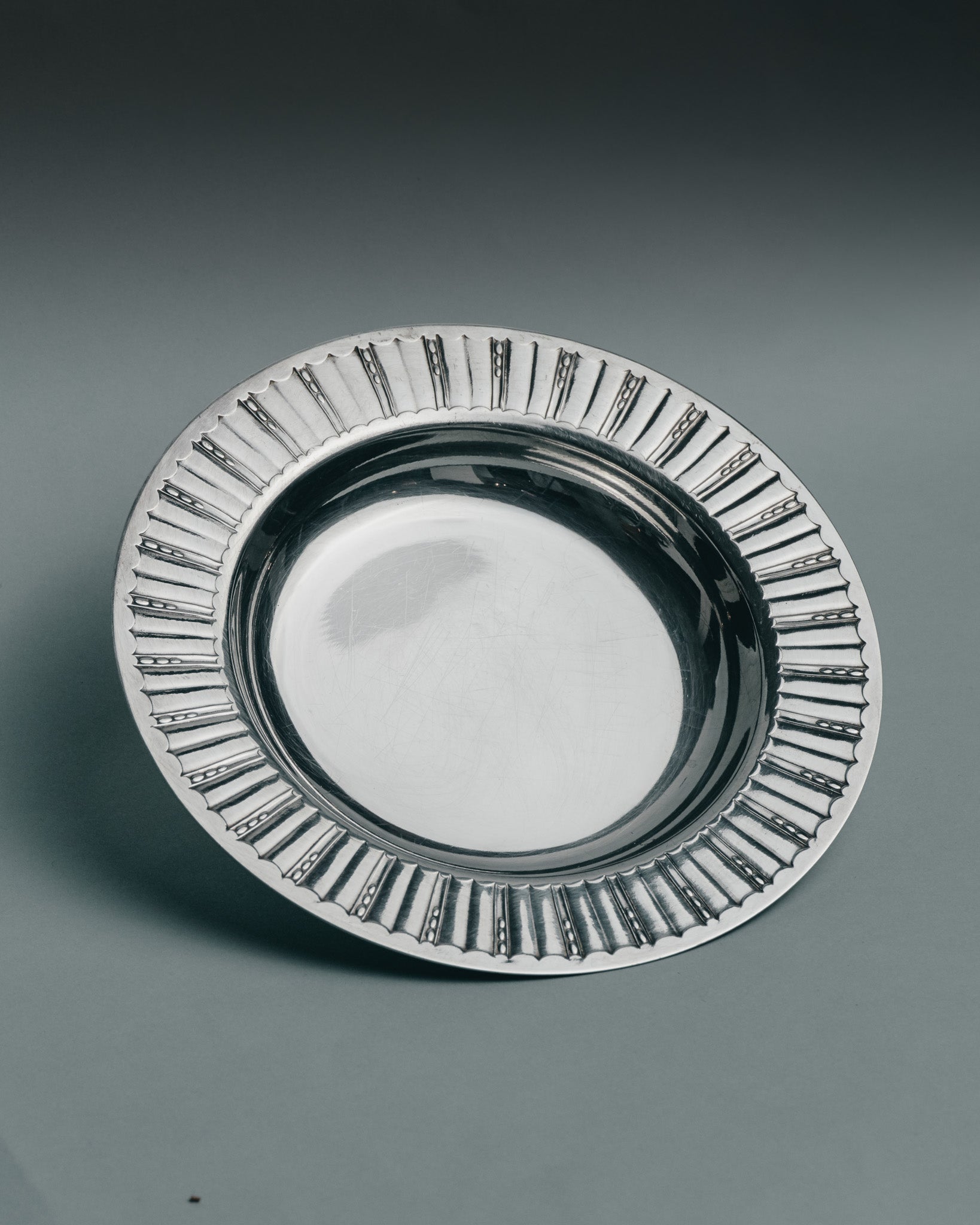 ASSIETTE À PÂTÉE EN MÉTAL ARGENTÉ POUR MOYEN CHIEN, GALLIA, 1930s