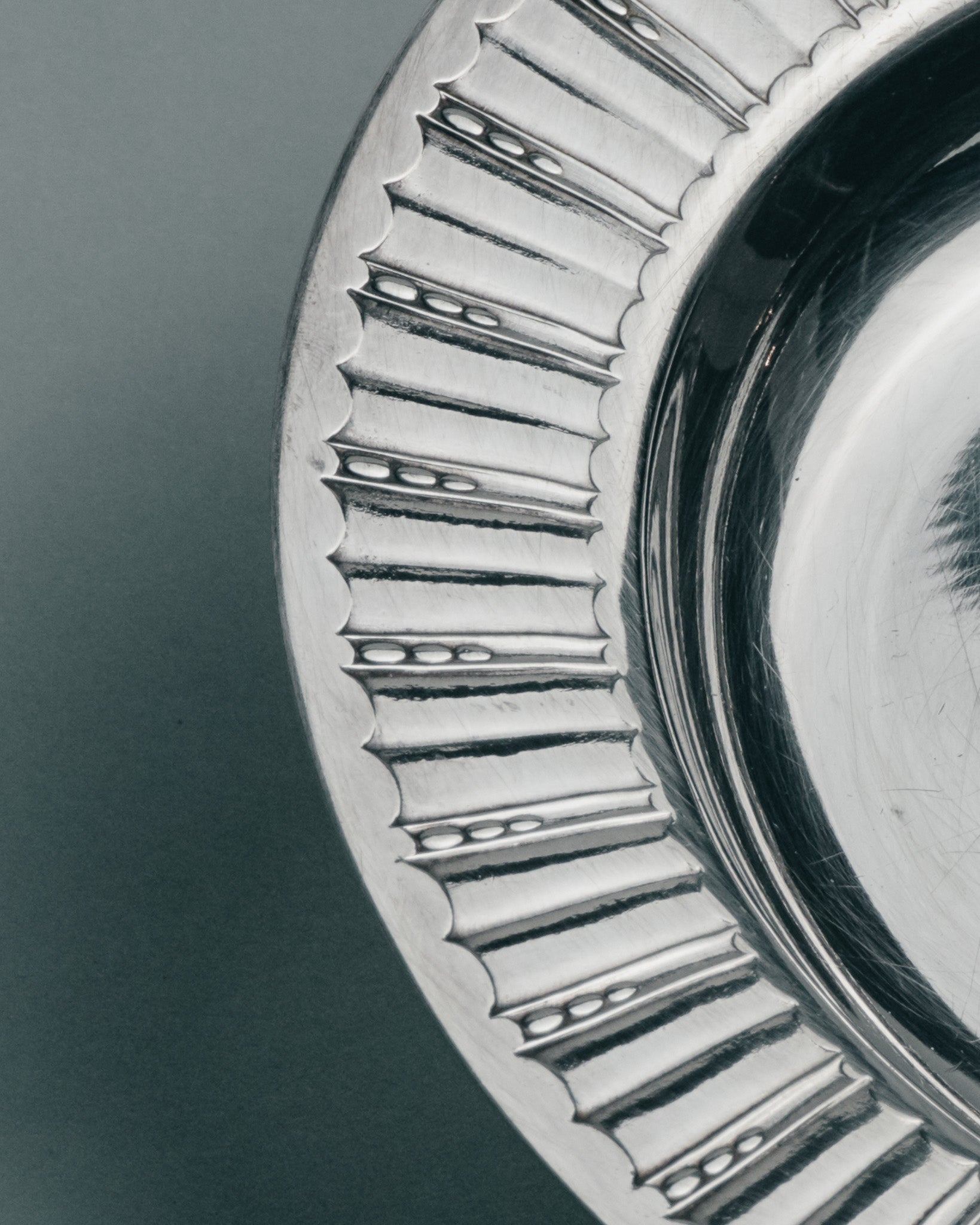 Cette assiette a pâté bénéfice naturellement des propriétés anti-bactériennes de l'argent. Son diamètre et sa forme ouverte en font une gamelle whisker-friendly, idéal pour le confort des petits chiens et des chats. Bel état général, avec de légères traces d’usage liées à l'âge et l'usage.