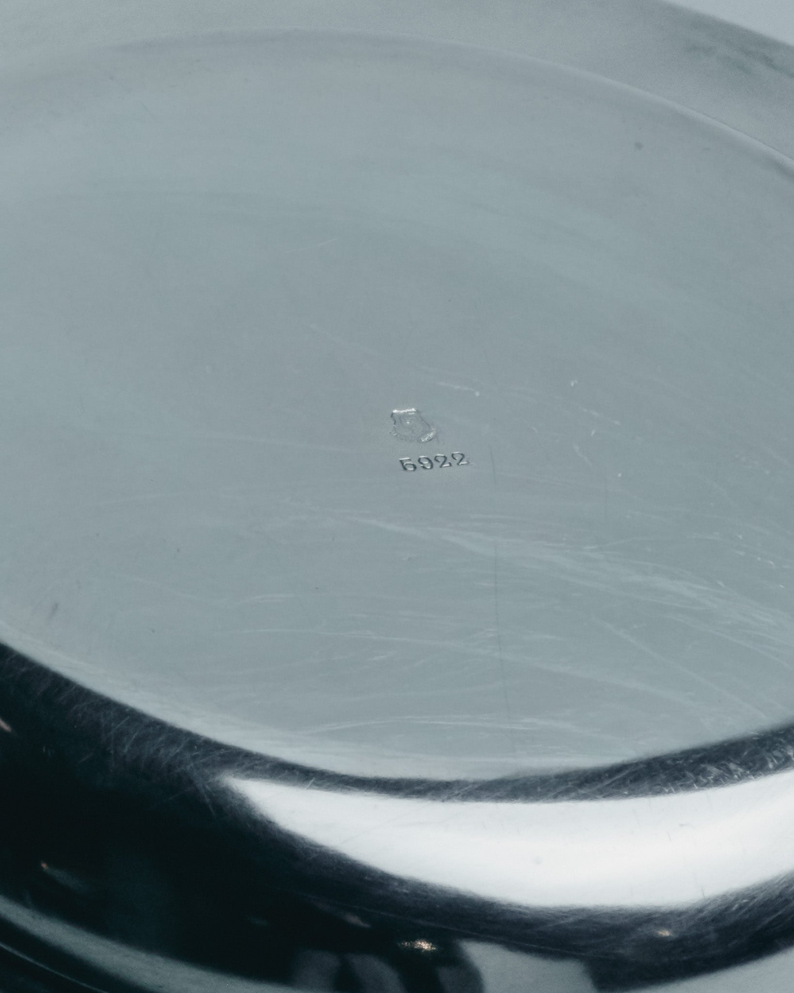 Assiette à pâtée en métal argenté dans le style art déco avec un liseré sur la partie plate. Pièce poinçonnée de la collection Gallia, et numérotée '5922' créée par Christofle en 1898, l'estampille est un coq dans un écusson légendé « Orfèvrerie Gallia » utilisé jusqu’en 1942.
