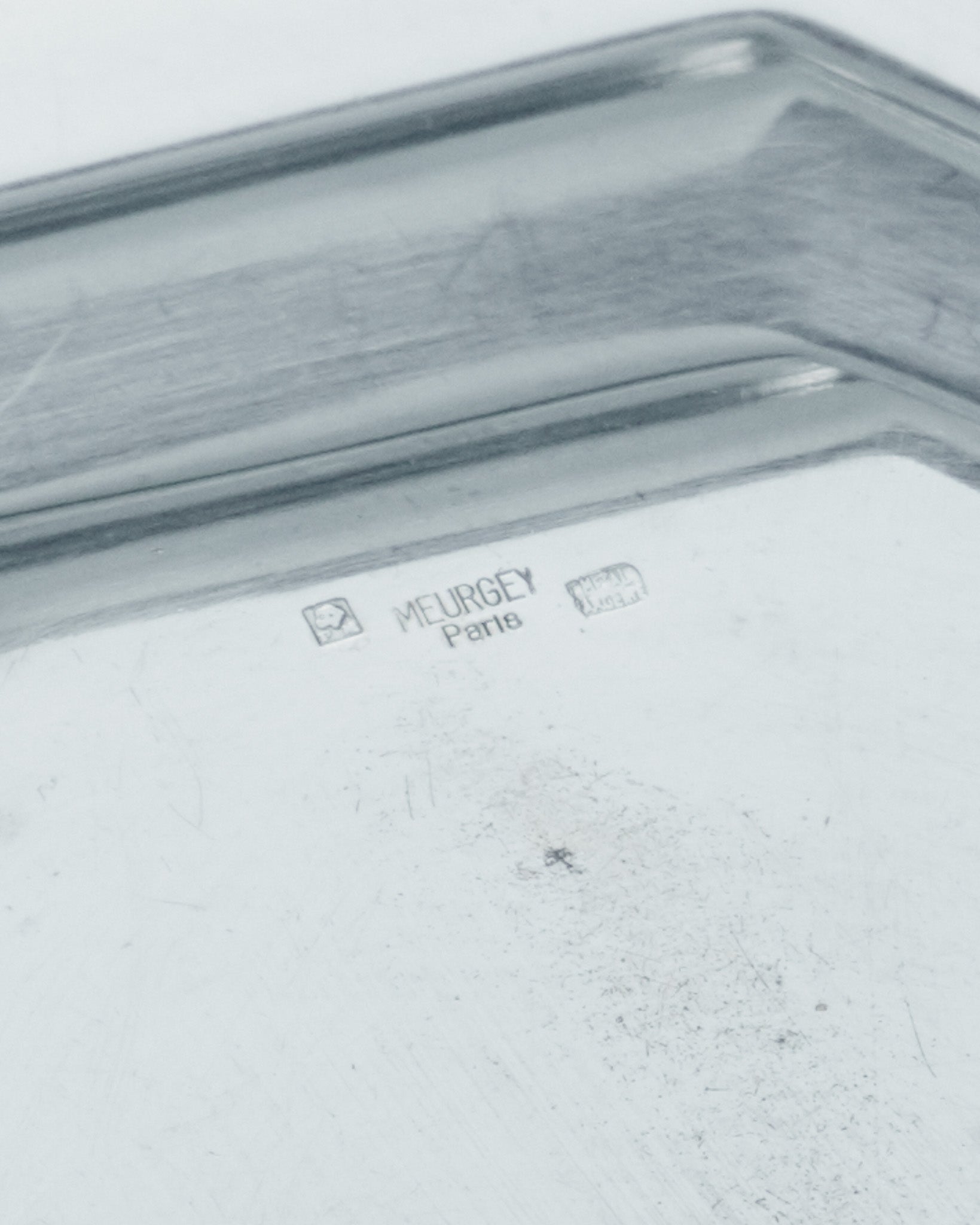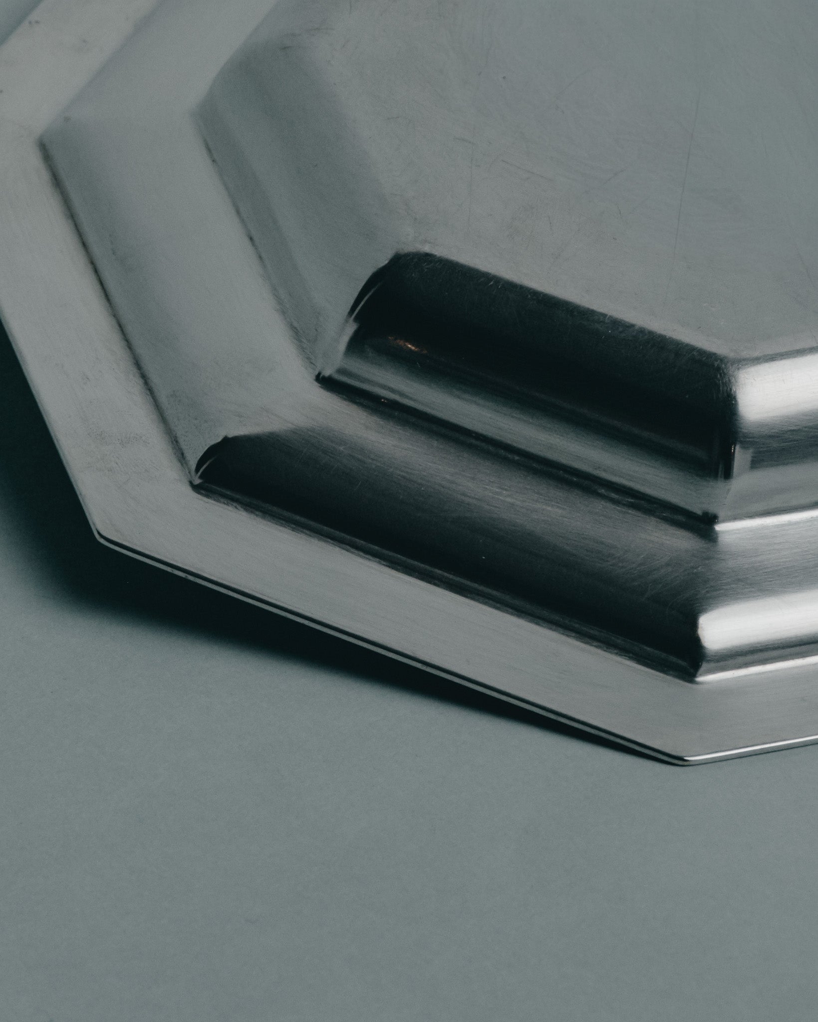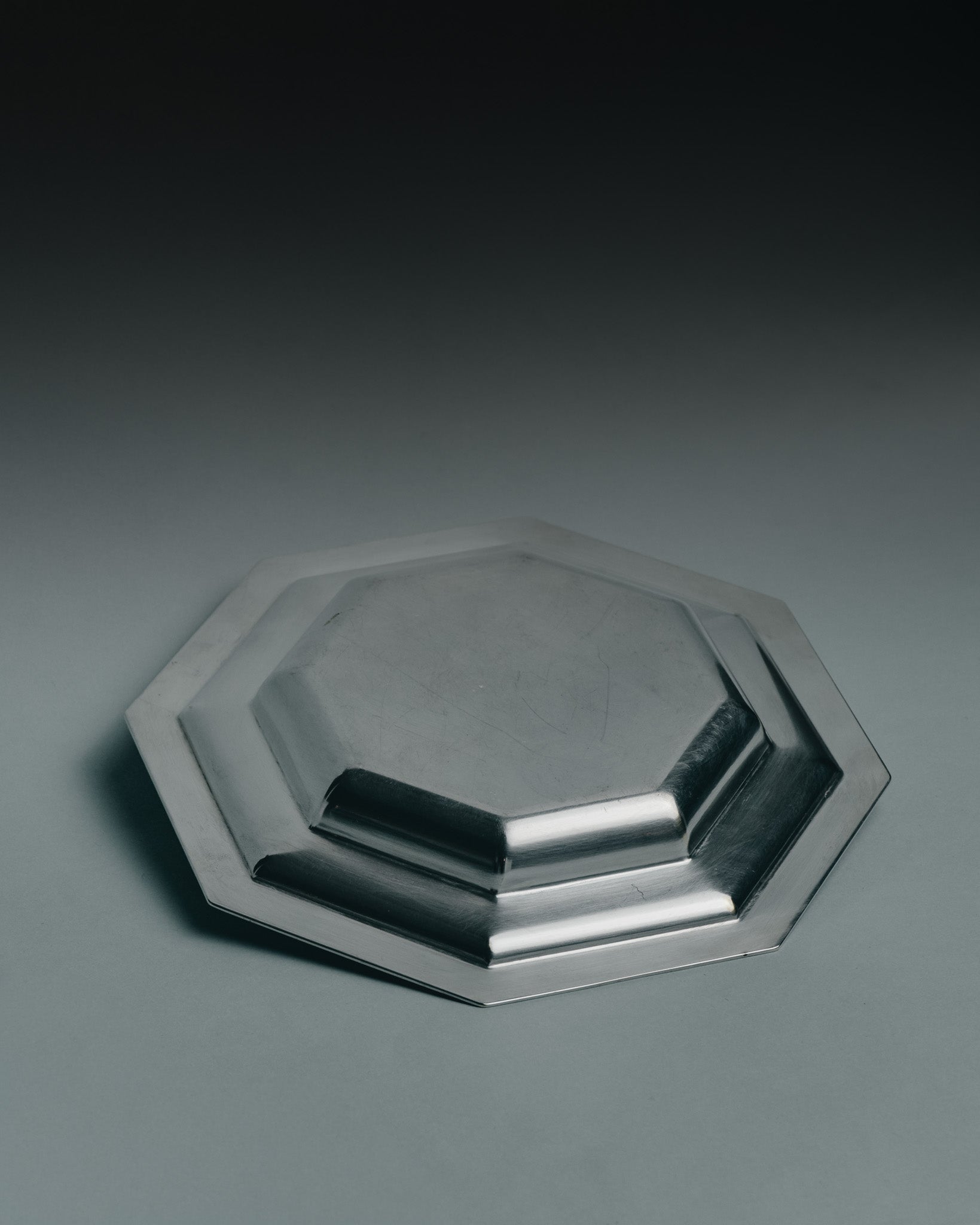 Assiette à pâté en métal argenté octogonale dans le style art déco. Pièce estampillée sur la face de l'assiette Orfèvrerie Pierre Meurgey : artisan depuis 1929, créations de couverts, plats, timbales, chandeliers, trophées et cadeaux d’exception.