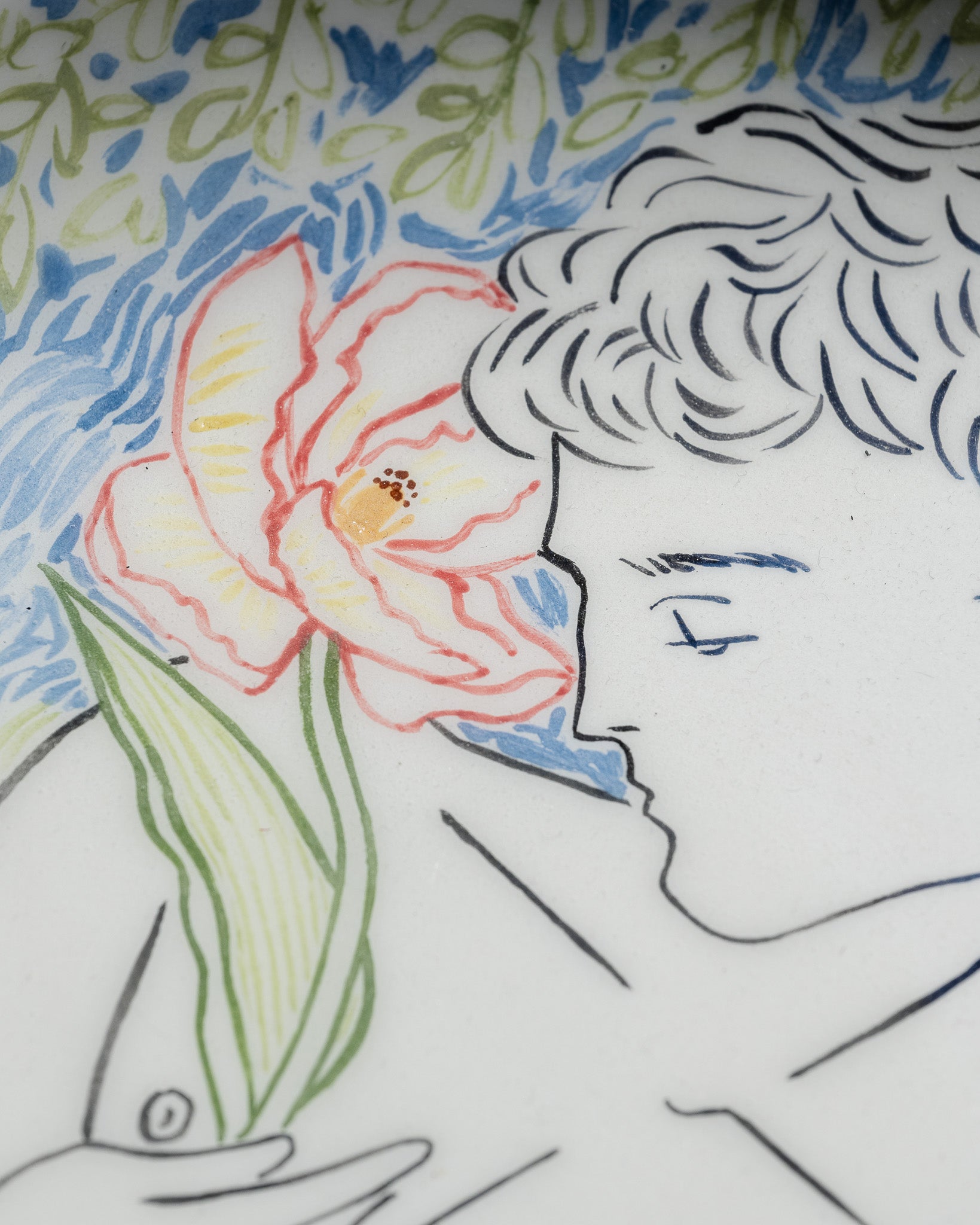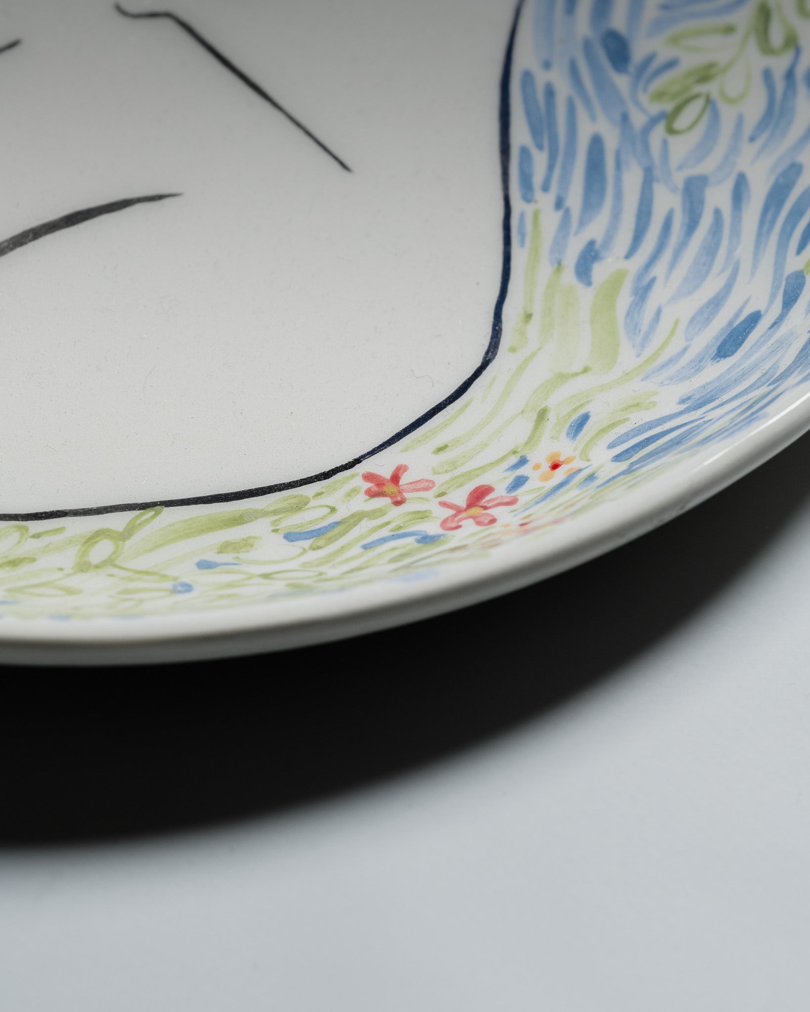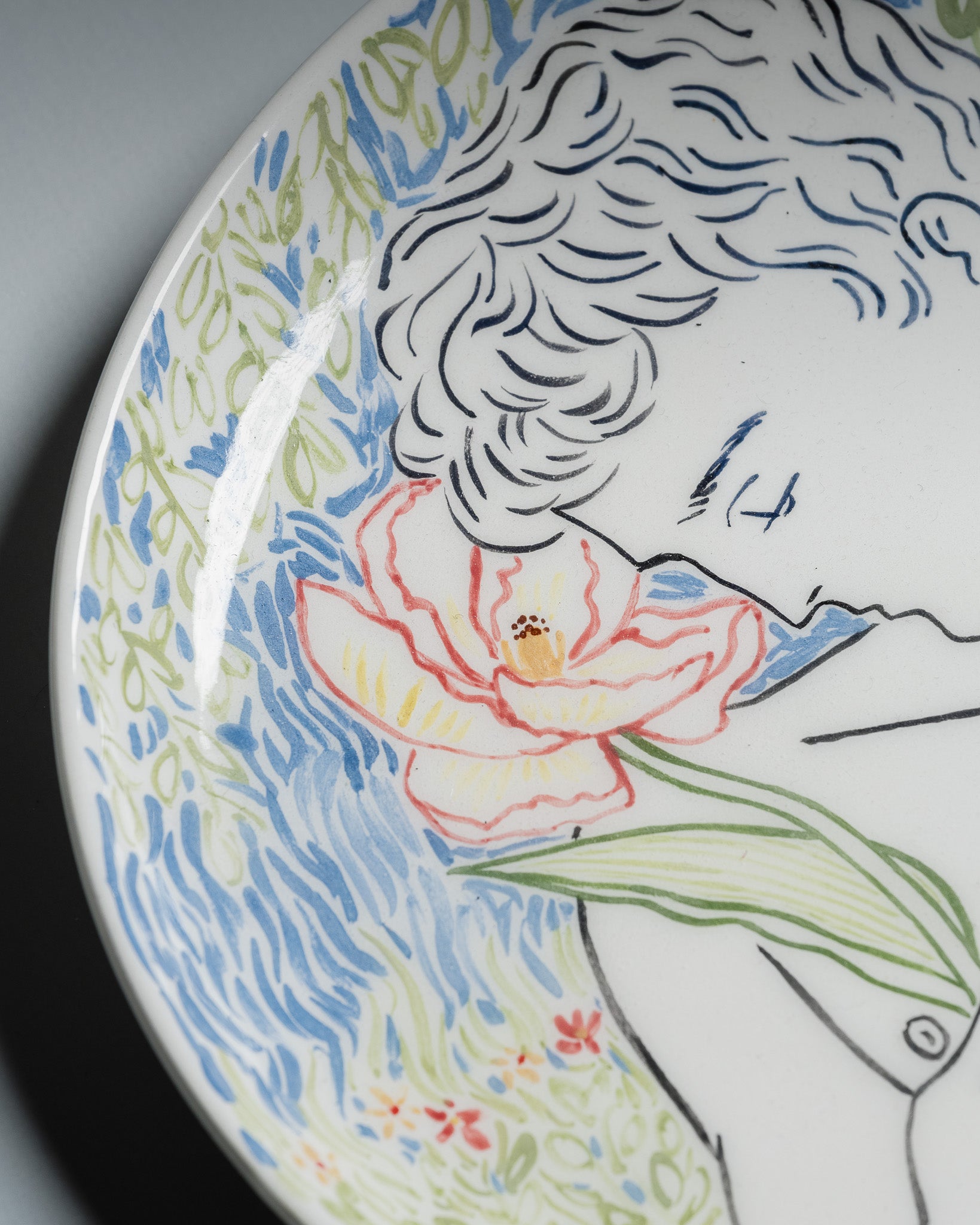 Assiette en céramique émaillée blanche, à décor représentant un profil masculin stylisé autour d'un décor floral. Signée 'Eldarov. T 2024' au revers.