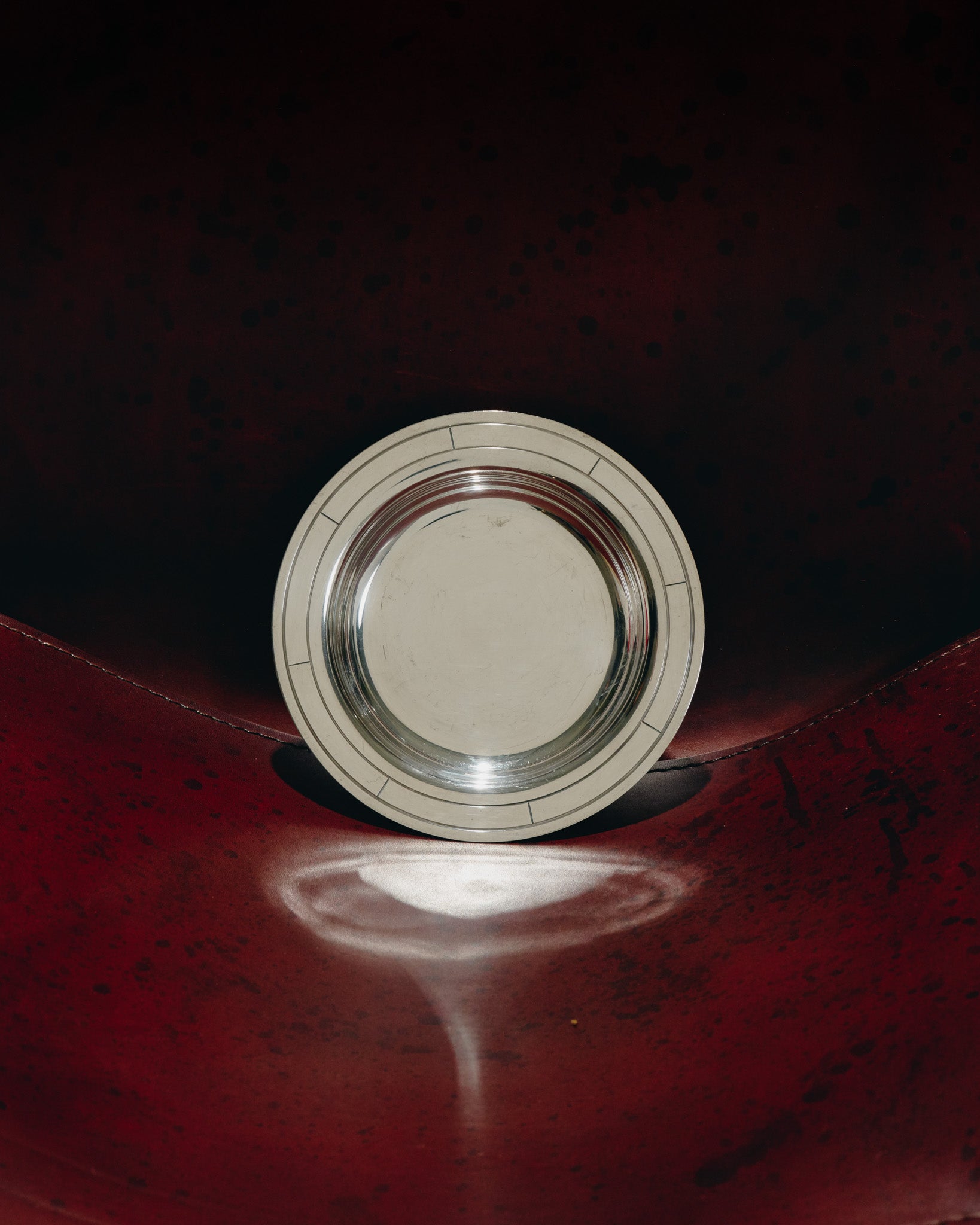 ASSIETTE À PÂTÉE EN MÉTAL ARGENTÉ PETIT CHIEN / CHAT, 1960s